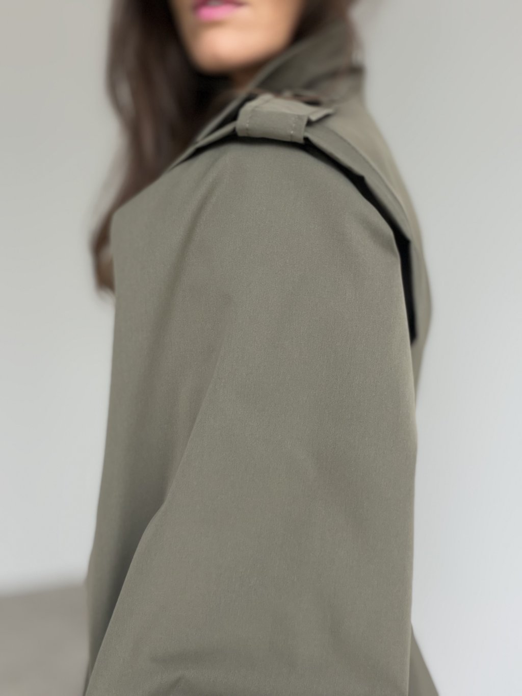 Tento krátky trenčkot je výrazný, moderný kúsok s pevnejšou konštrukciou, ktorý dodá outfitu čistý a luxusný vzhľad. Strih je skrátený, takže krásne funguje k nohaviciam s vyšším pásom aj k sukniam, a pritom nepôsobí ťažko. Dominantou sú objemné rukávy so zaujímavým tvarovaním a detail na ramenách, ktorý vytvára elegantnú, „architektonickú“ siluetu. Zapínanie na gombíky a opasok v páse umožnia trenčkot nosiť voľnejšie ako vrstvenie, alebo ho zvýrazniť v páse pre ženský tvar. Je to ideálny prechodový model, ktorý sa dá nosiť do práce aj na bežný deň.