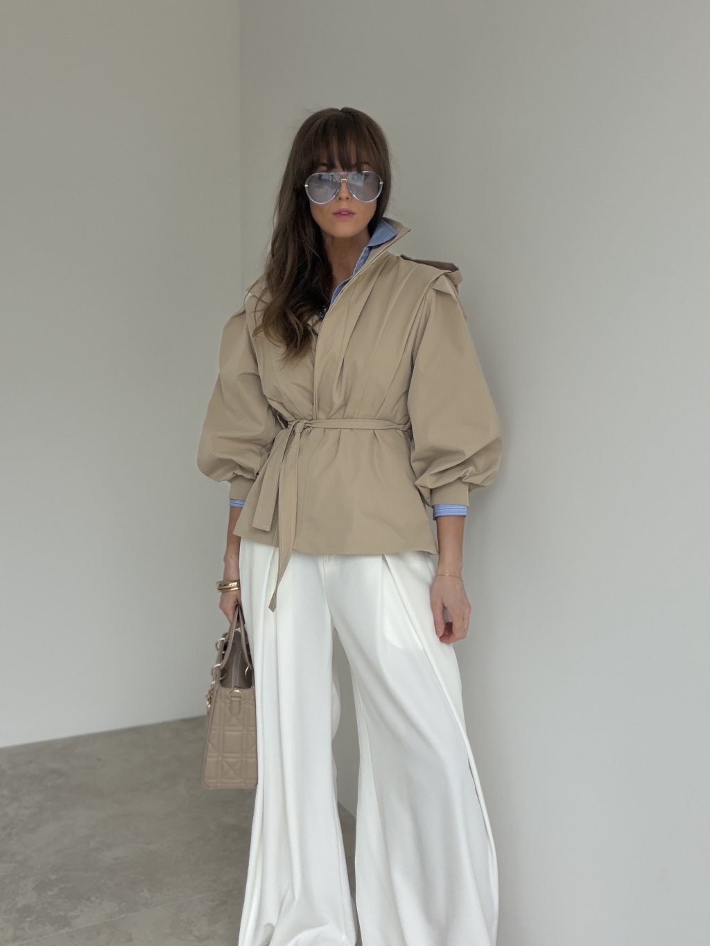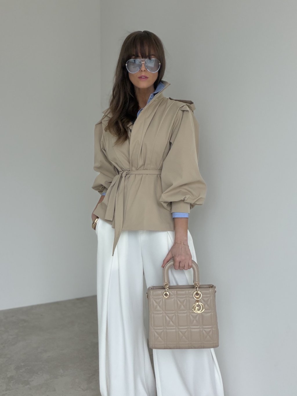 Tento krátky trenčkot je výrazný, moderný kúsok s pevnejšou konštrukciou, ktorý dodá outfitu čistý a luxusný vzhľad. Strih je skrátený, takže krásne funguje k nohaviciam s vyšším pásom aj k sukniam, a pritom nepôsobí ťažko. Dominantou sú objemné rukávy so zaujímavým tvarovaním a detail na ramenách, ktorý vytvára elegantnú, „architektonickú“ siluetu. Zapínanie na gombíky a opasok v páse umožnia trenčkot nosiť voľnejšie ako vrstvenie, alebo ho zvýrazniť v páse pre ženský tvar. Je to ideálny prechodový model, ktorý sa dá nosiť do práce aj na bežný deň.