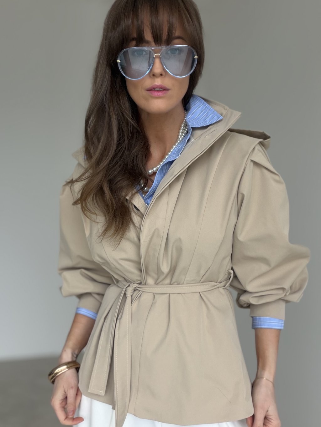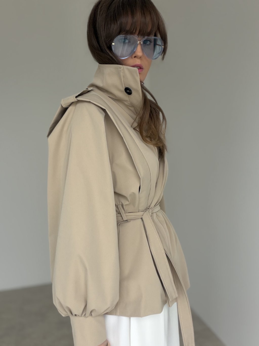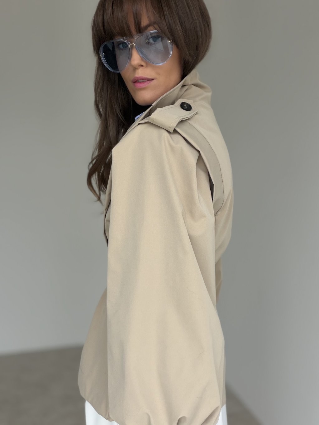 Krátky trenčkot so zapínaním na gombíky, opaskom v páse a výrazne tvarovanými rukávmi. Štýlový prechodový kúsok, ktorý zvýrazní siluetu a dodá outfitu eleganciu.