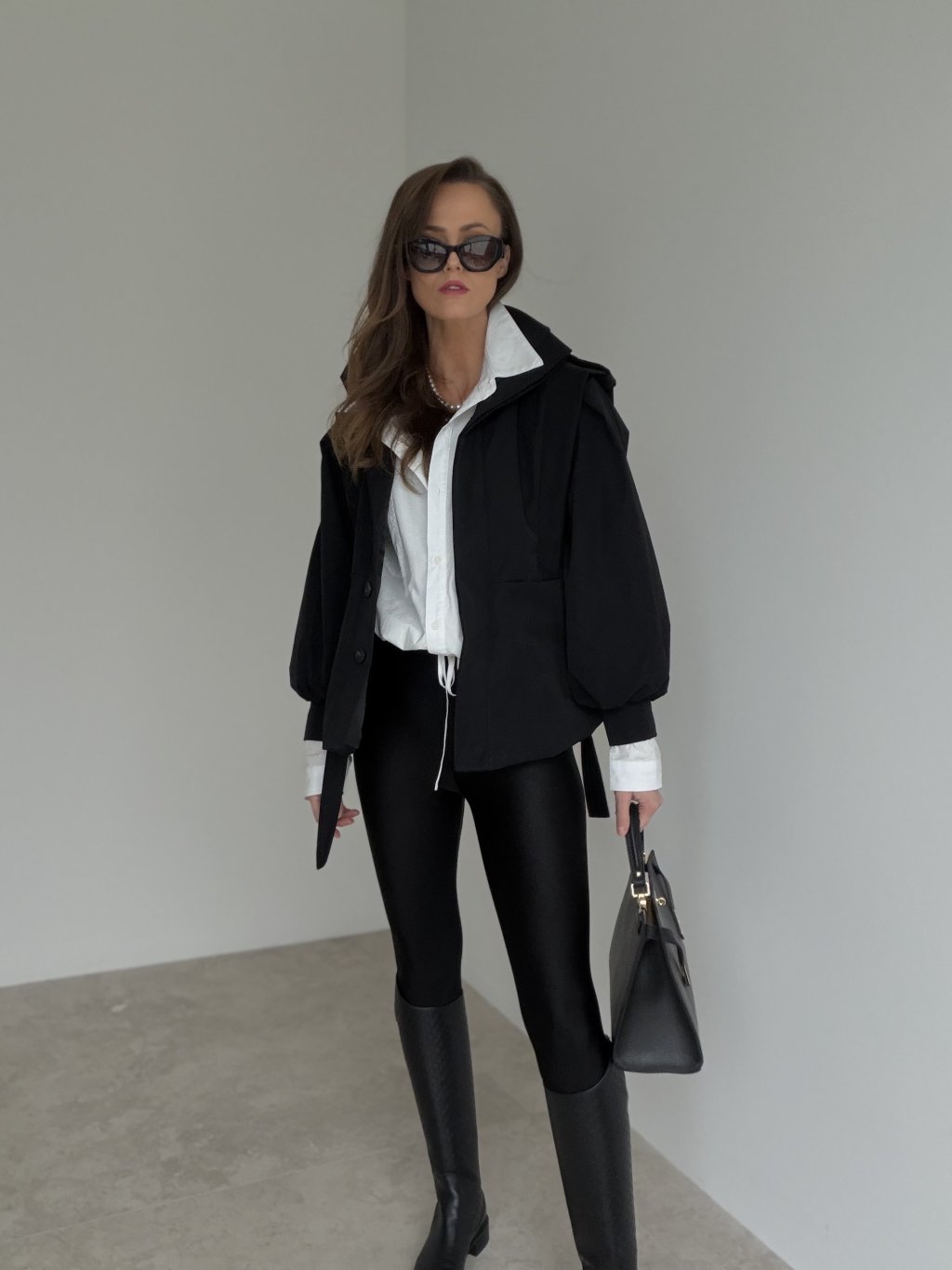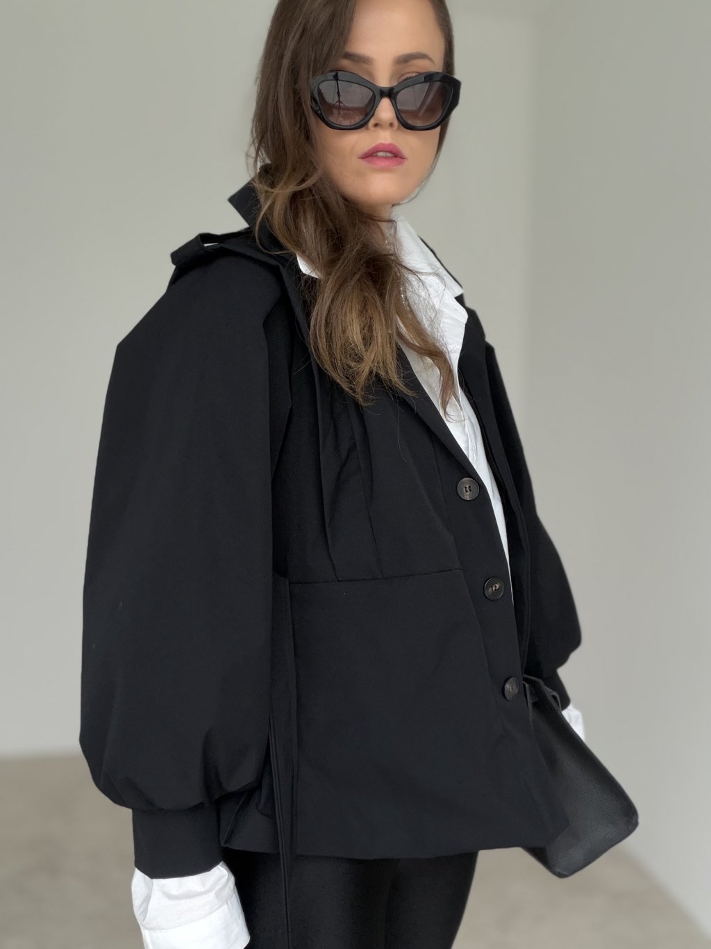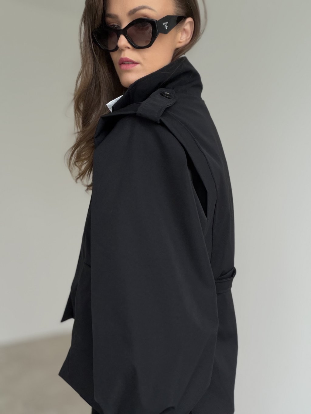 Tento krátky trenčkot je výrazný, moderný kúsok s pevnejšou konštrukciou, ktorý dodá outfitu čistý a luxusný vzhľad. Strih je skrátený, takže krásne funguje k nohaviciam s vyšším pásom aj k sukniam, a pritom nepôsobí ťažko. Dominantou sú objemné rukávy so zaujímavým tvarovaním a detail na ramenách, ktorý vytvára elegantnú, „architektonickú“ siluetu. Zapínanie na gombíky a opasok v páse umožnia trenčkot nosiť voľnejšie ako vrstvenie, alebo ho zvýrazniť v páse pre ženský tvar. Je to ideálny prechodový model, ktorý sa dá nosiť do práce aj na bežný deň.