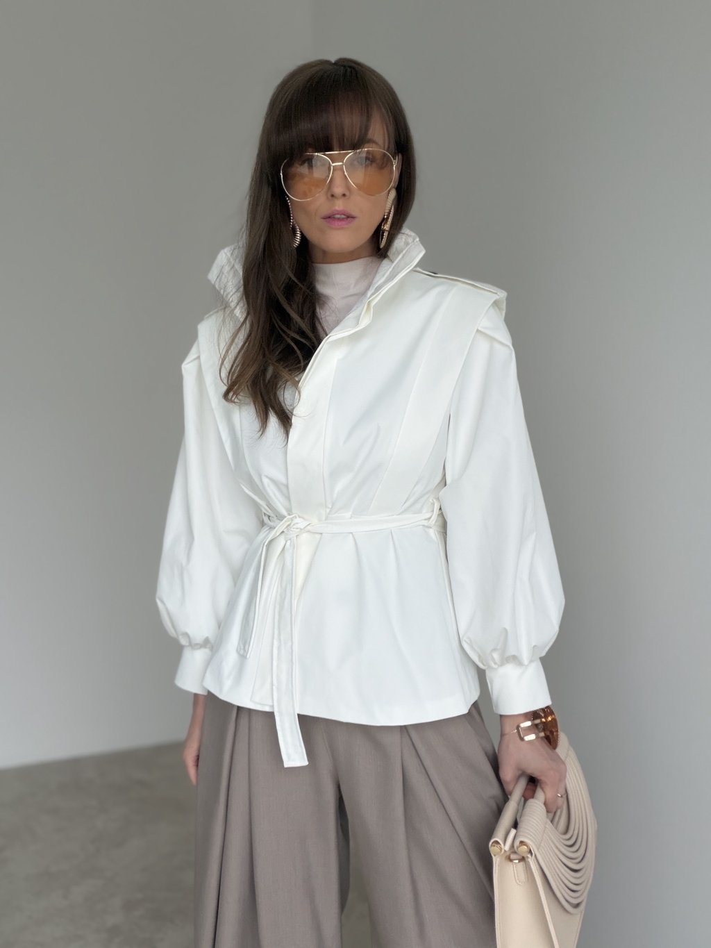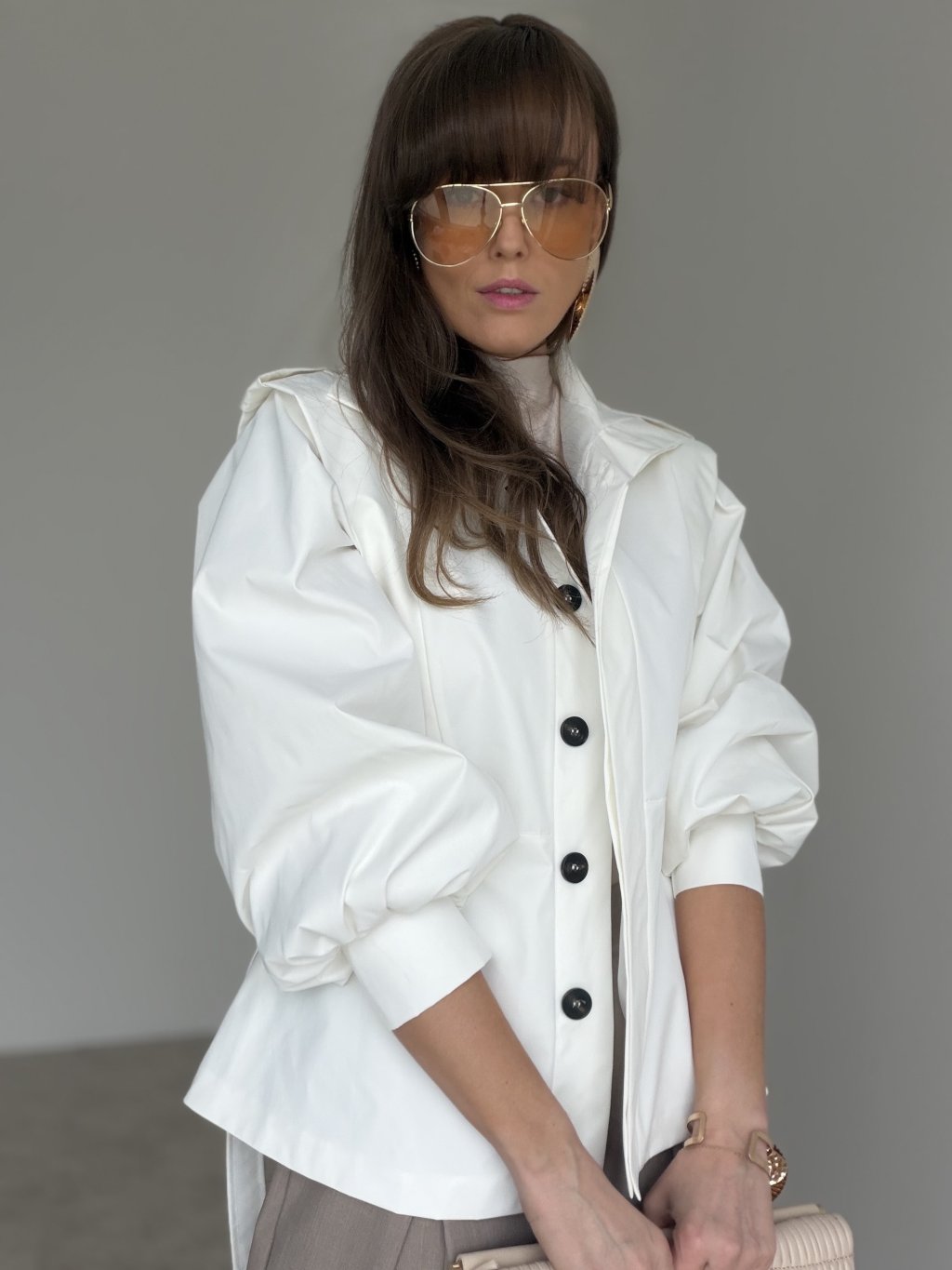 Tento krátky trenčkot je výrazný, moderný kúsok s pevnejšou konštrukciou, ktorý dodá outfitu čistý a luxusný vzhľad. Strih je skrátený, takže krásne funguje k nohaviciam s vyšším pásom aj k sukniam, a pritom nepôsobí ťažko. Dominantou sú objemné rukávy so zaujímavým tvarovaním a detail na ramenách, ktorý vytvára elegantnú, „architektonickú“ siluetu. Zapínanie na gombíky a opasok v páse umožnia trenčkot nosiť voľnejšie ako vrstvenie, alebo ho zvýrazniť v páse pre ženský tvar. Je to ideálny prechodový model, ktorý sa dá nosiť do práce aj na bežný deň.