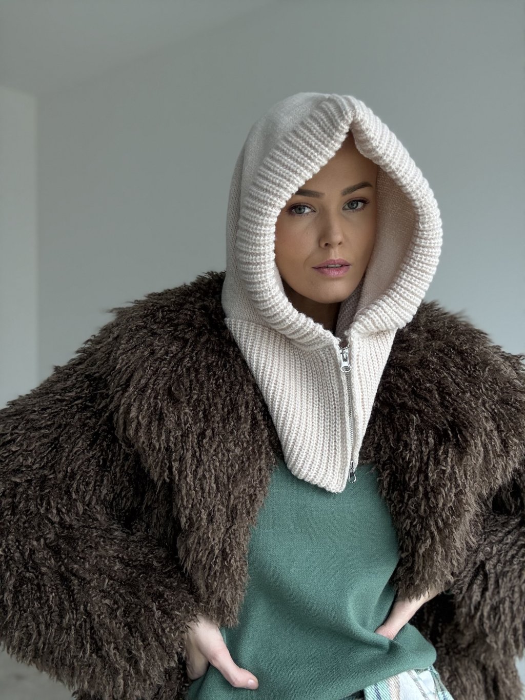 Pletená kukla so zipsom, mäkká a hrejivá, s pohodlným lemom okolo tváre a ľahkým vrstvením na každý deň.