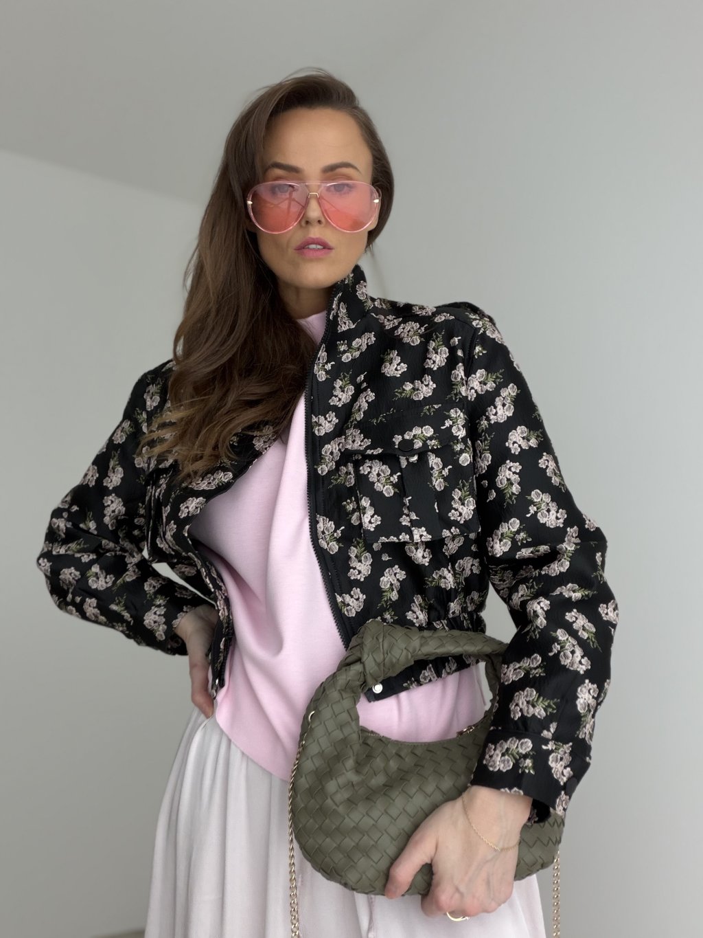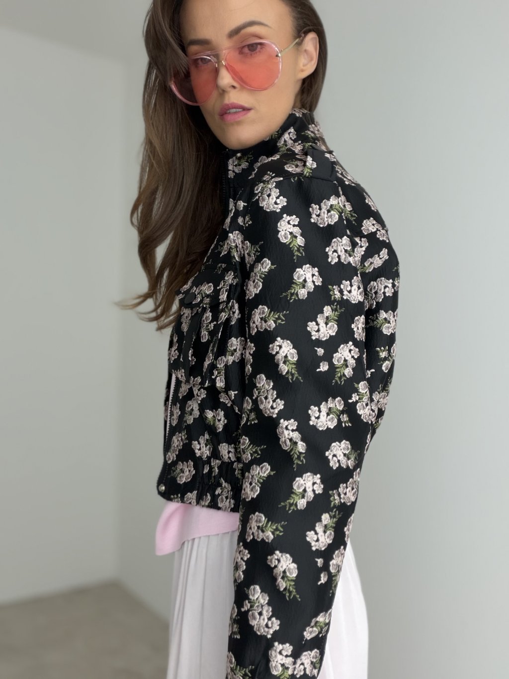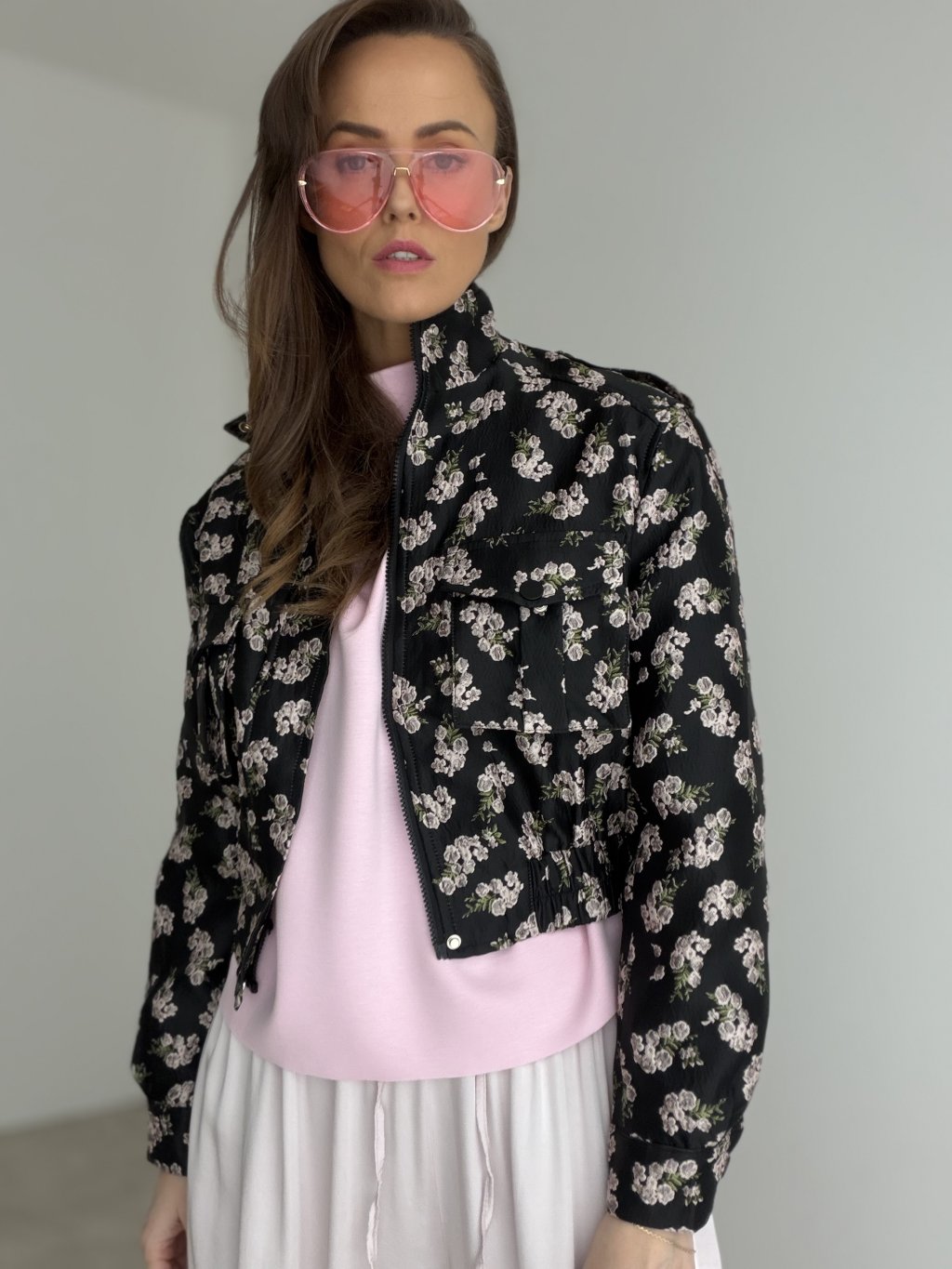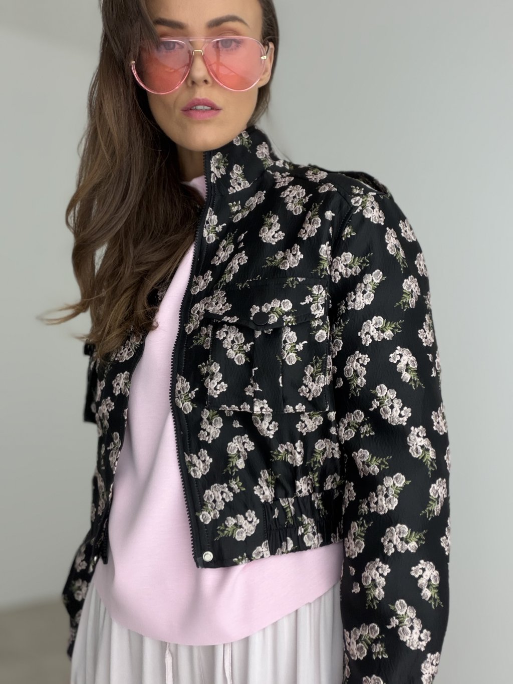 Krátka prešívaná bunda s kvetinovým vzorom, vyšším golierom, zipsom a prednými vreckami. Skvelá na vrstvenie a prechodné dni.