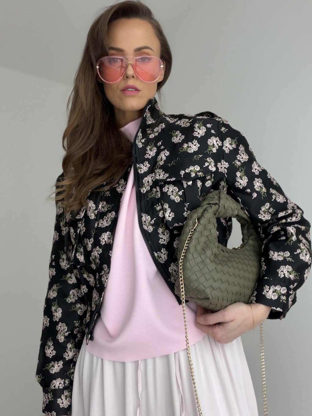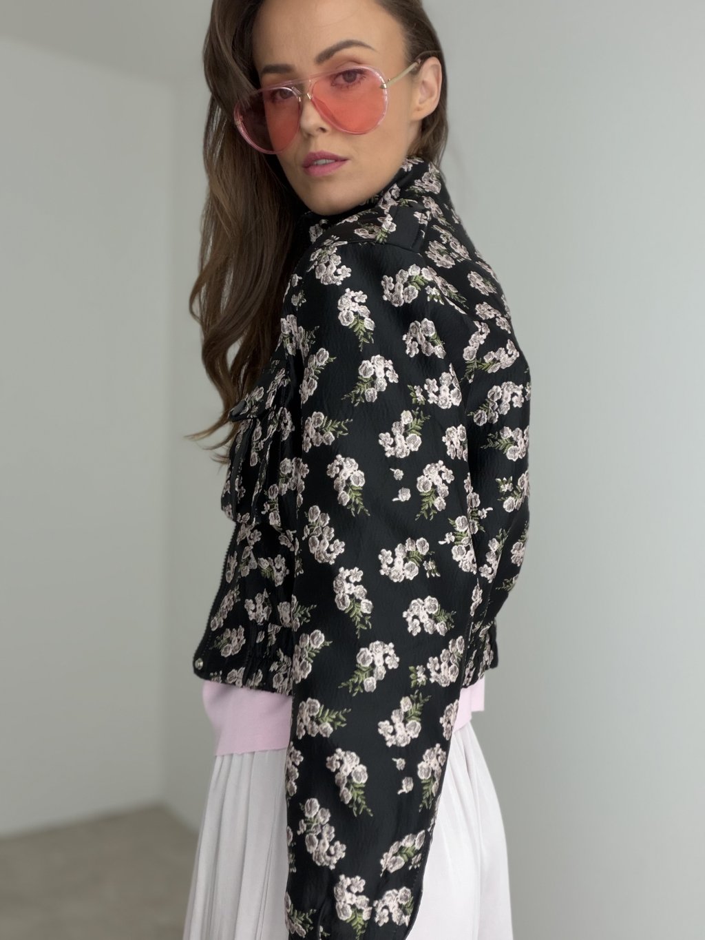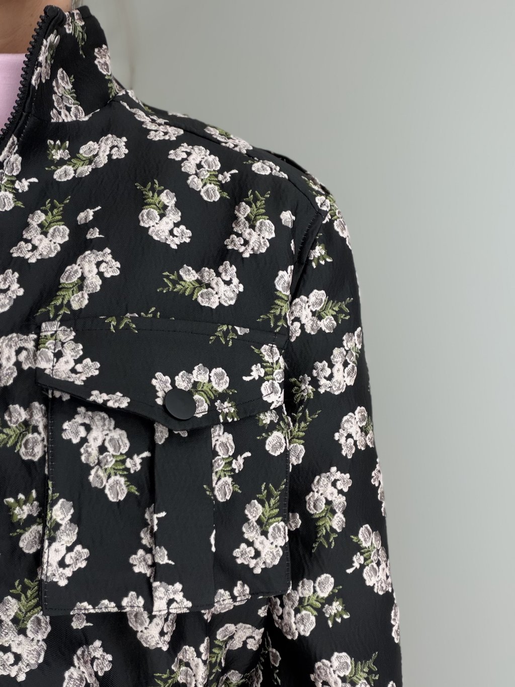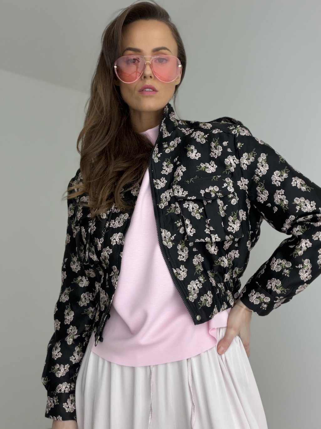 Krátka prešívaná bunda s kvetinovým vzorom, vyšším golierom, zipsom a prednými vreckami. Skvelá na vrstvenie a prechodné dni.