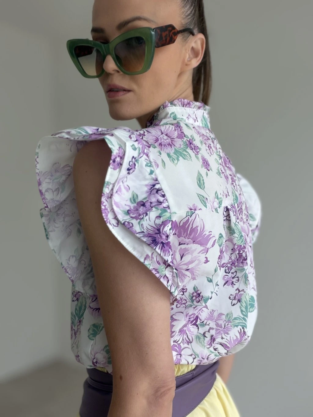 Táto blúzka pôsobí romanticky, žensky a veľmi elegantne. Jemný kvetinový vzor v kombinácii s výraznými volánovými rukávmi a ozdobným detailom v prednej časti vytvára sofistikovaný model, ktorý okamžite pritiahne pozornosť. Vyšší stojačik dodáva celému kúsku upravený a vkusný vzhľad, vďaka čomu sa hodí nielen na bežné nosenie, ale aj na príležitosti, keď chceš pôsobiť výnimočne a štýlovo.