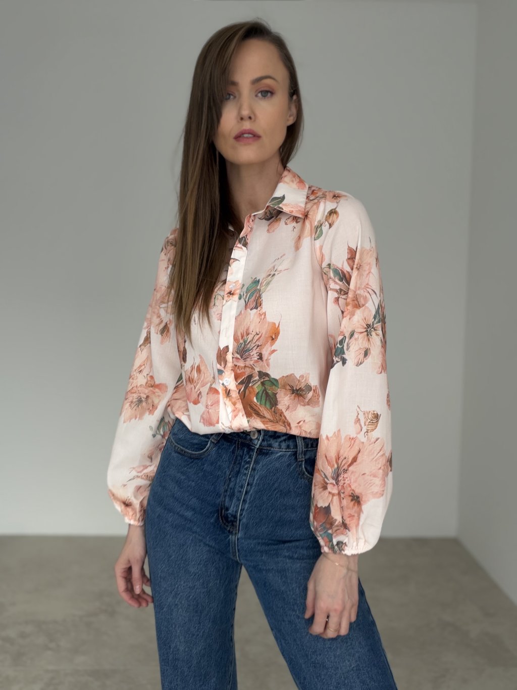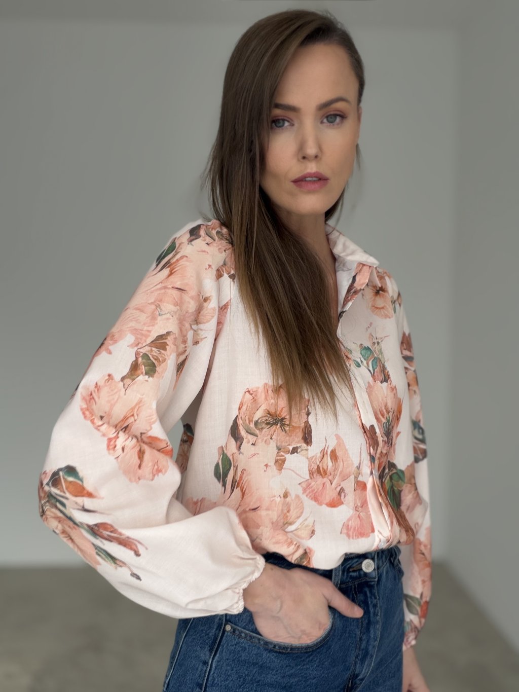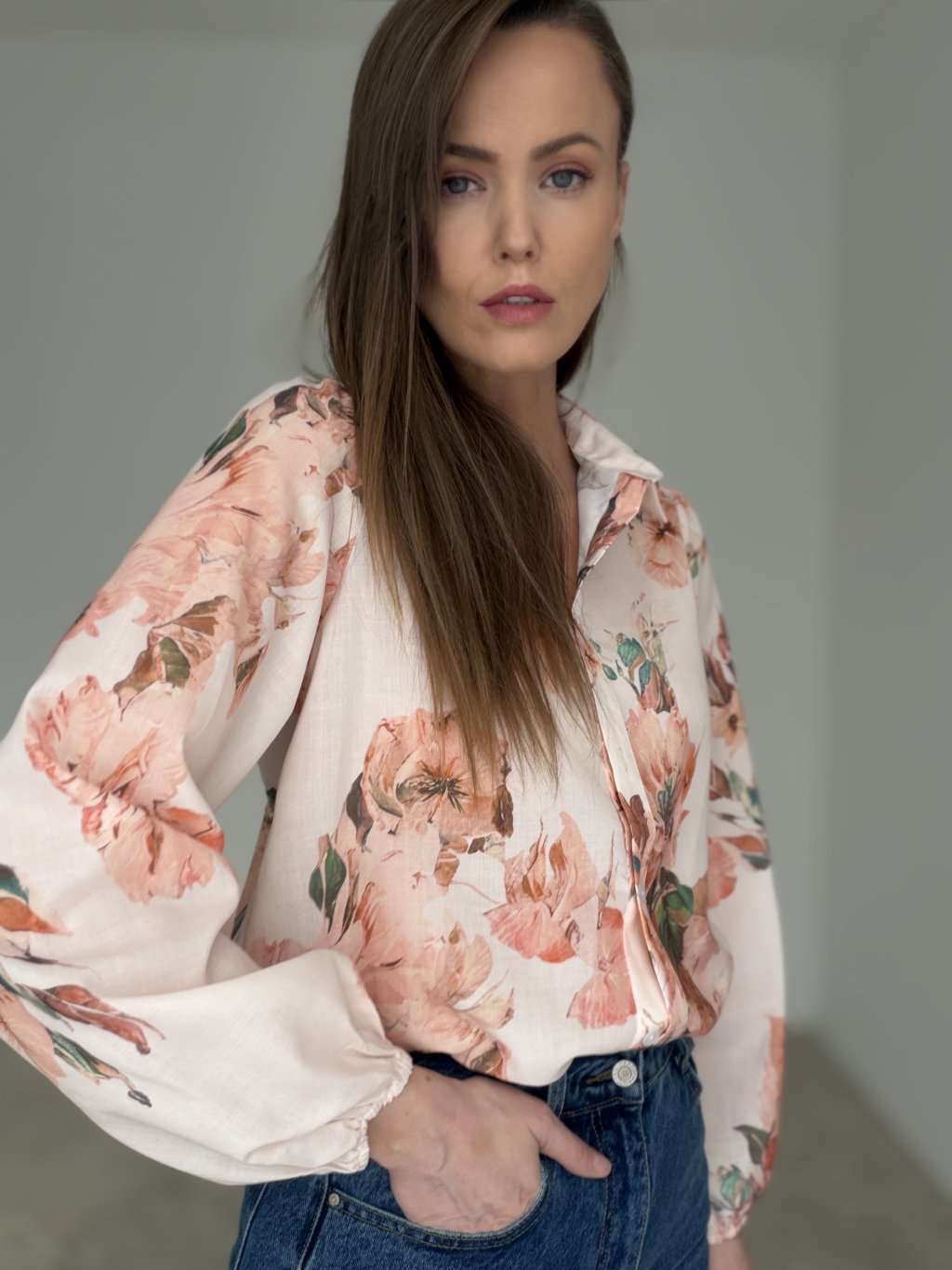 Kvetovaná košeľa s voľnejším strihom, klasickým golierom a jemne riasenými rukávmi. Elegantný a ženský kúsok, ktorý ľahko oživí každodenné aj upravenejšie outfity.