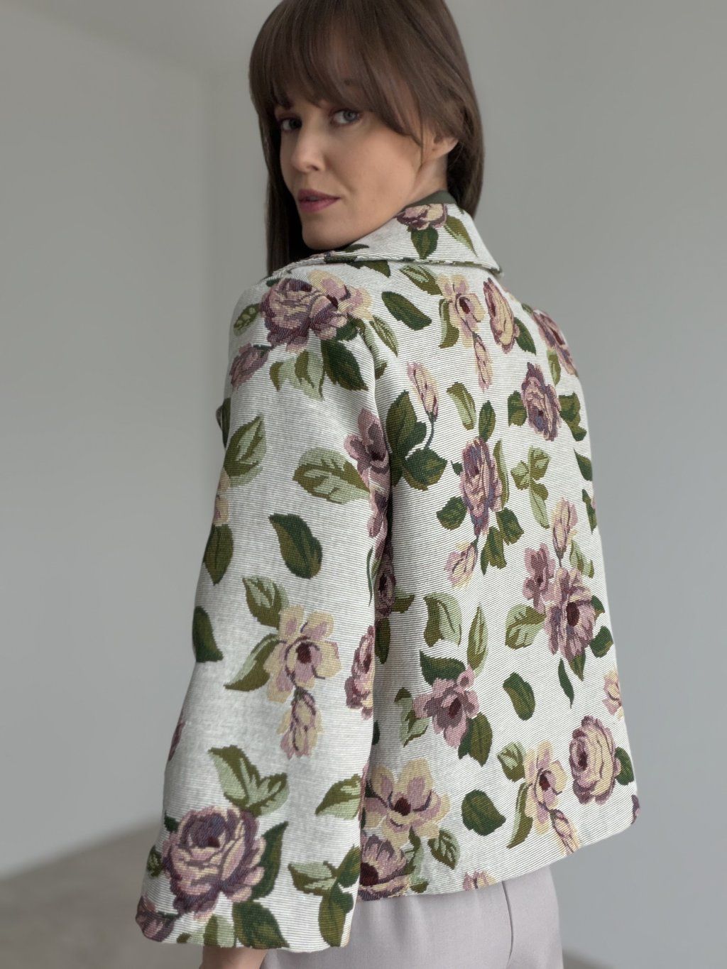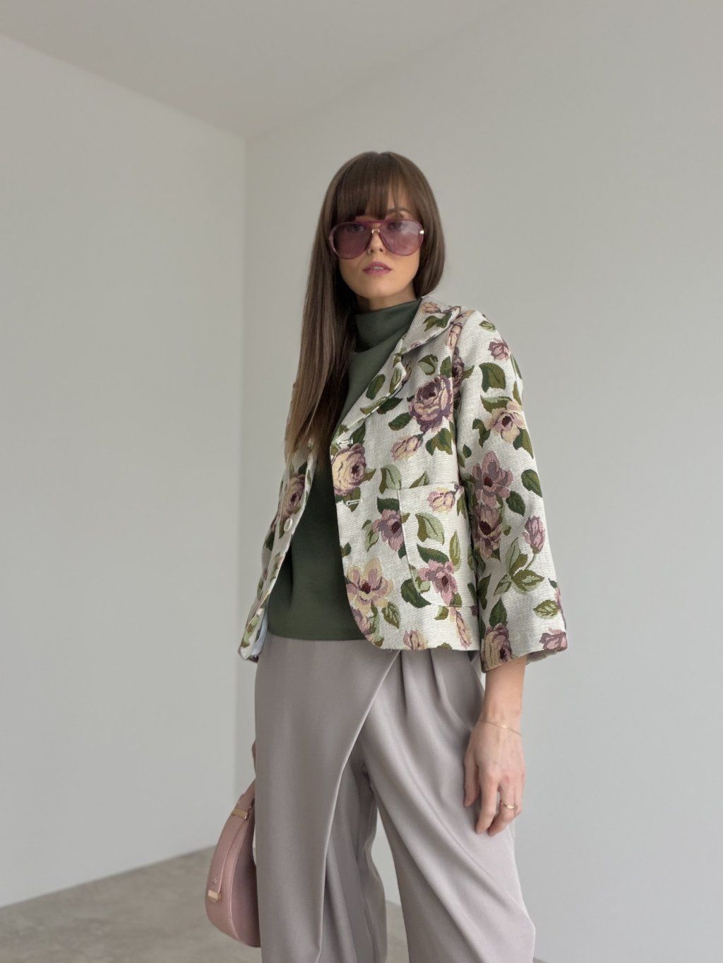 Elegantné kvetované sako je štýlový a ženský kúsok, ktorý oživí každý outfit. Vďaka svojmu výraznému vzoru a upravenému strihu pôsobí originálne, sviežo a veľmi elegantne.