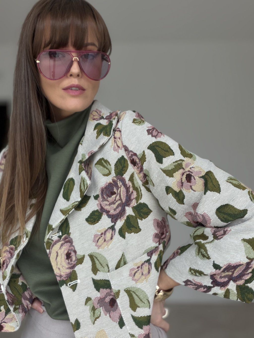 Elegantné sako s kvetovaným vzorom je výrazný a zároveň veľmi ženský kúsok, ktorý okamžite oživí každý outfit. Jeho štýlový strih pôsobí upravene, no zároveň si zachováva jemnosť a ľahkosť vďaka romantickému vzoru. Tento model je ideálny pre ženy, ktoré chcú do svojho šatníka zaradiť niečo originálne, nadčasové a ľahko kombinovateľné. Skvelo sa hodí k jednoduchým topom, nohaviciam aj sukniam a vytvára elegantný look vhodný na bežný deň aj výnimočnejšie príležitosti. Sako dokáže pôsobiť sofistikovane, ale aj sviežo a módne podľa toho, ako ho skombinuješ.