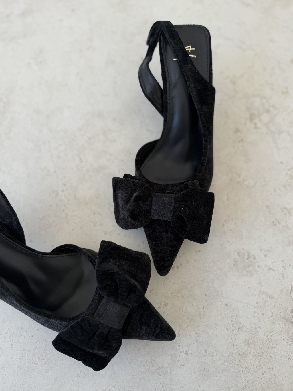 Štýlové lodičky na nižšom podpätku, ktoré zaujmú výraznou mašľou umiestnenou na špičke. Ich otvorená päta so zapínaním okolo členka zaručí pohodlné nosenie aj počas dlhších dní. Vďaka elegantnému tvaru a jemným detailom sú vhodné na spoločenské udalosti, ale aj na spríjemnenie každodenného outfitu.