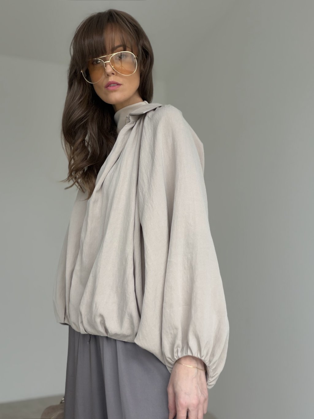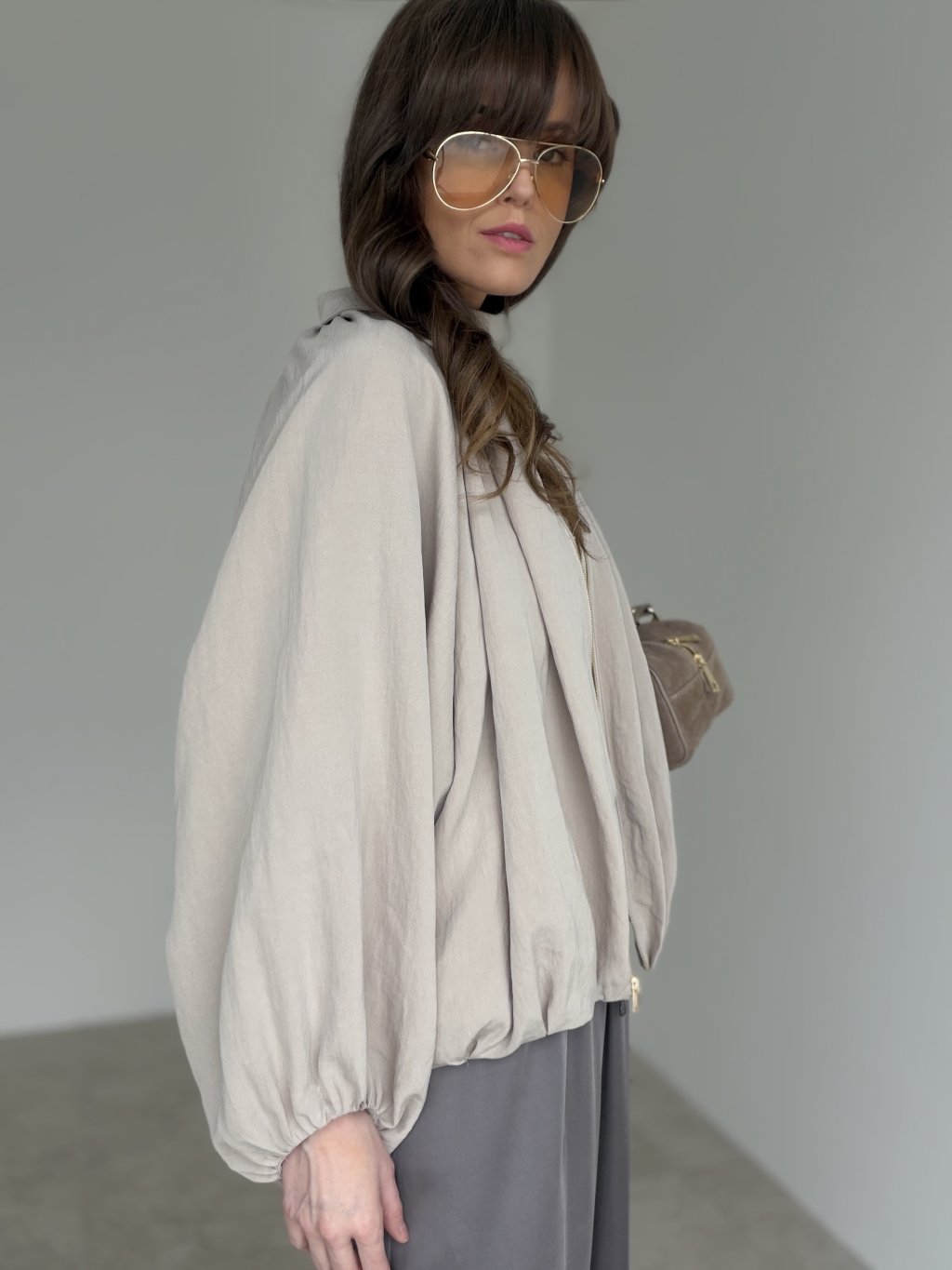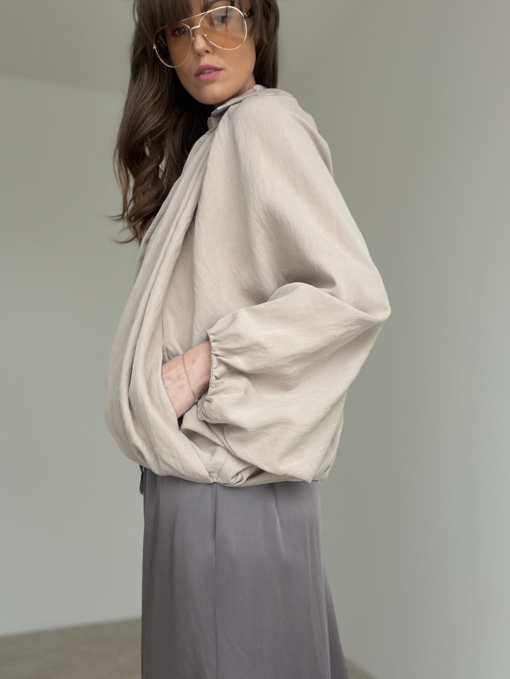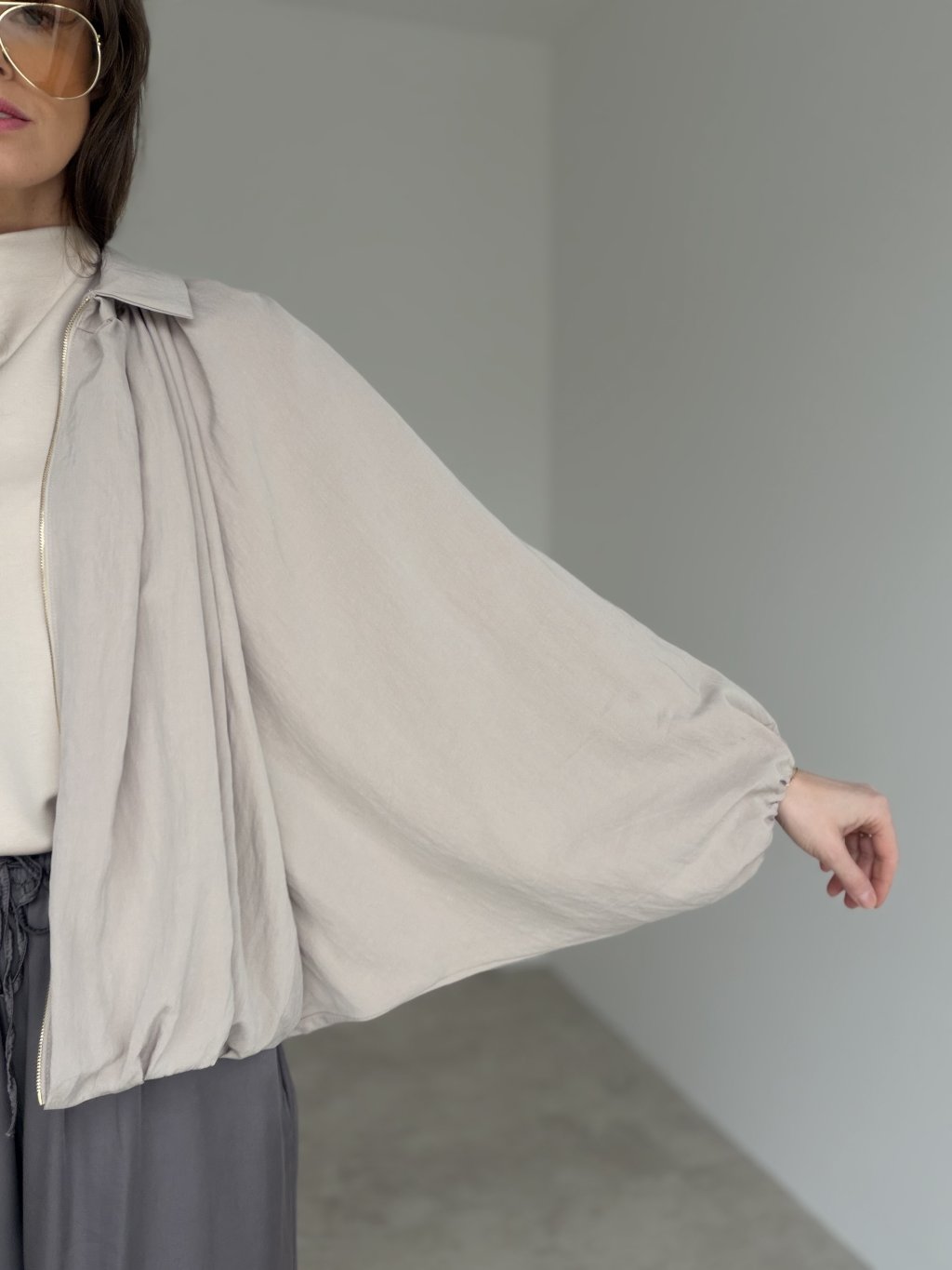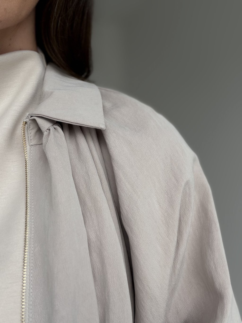 Ľahká lyocellová bunda so zipsom a golierom, s voľnejším strihom a výraznejšími rukávmi. Bunda môže prísť jemne pokrčená, odporúčame šetrné naparovanie.