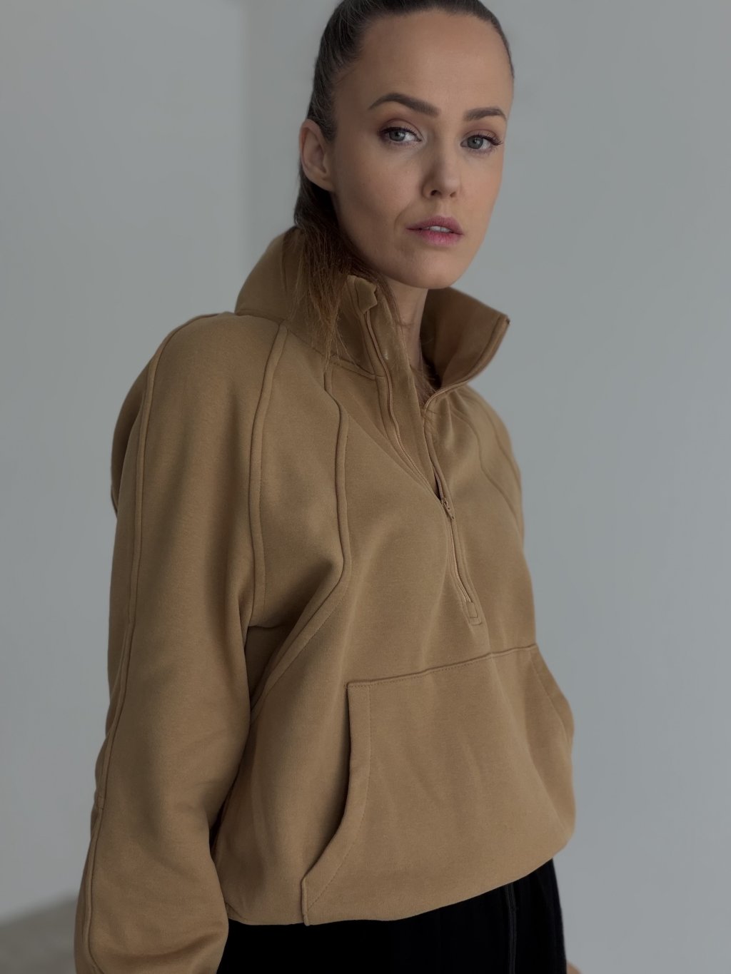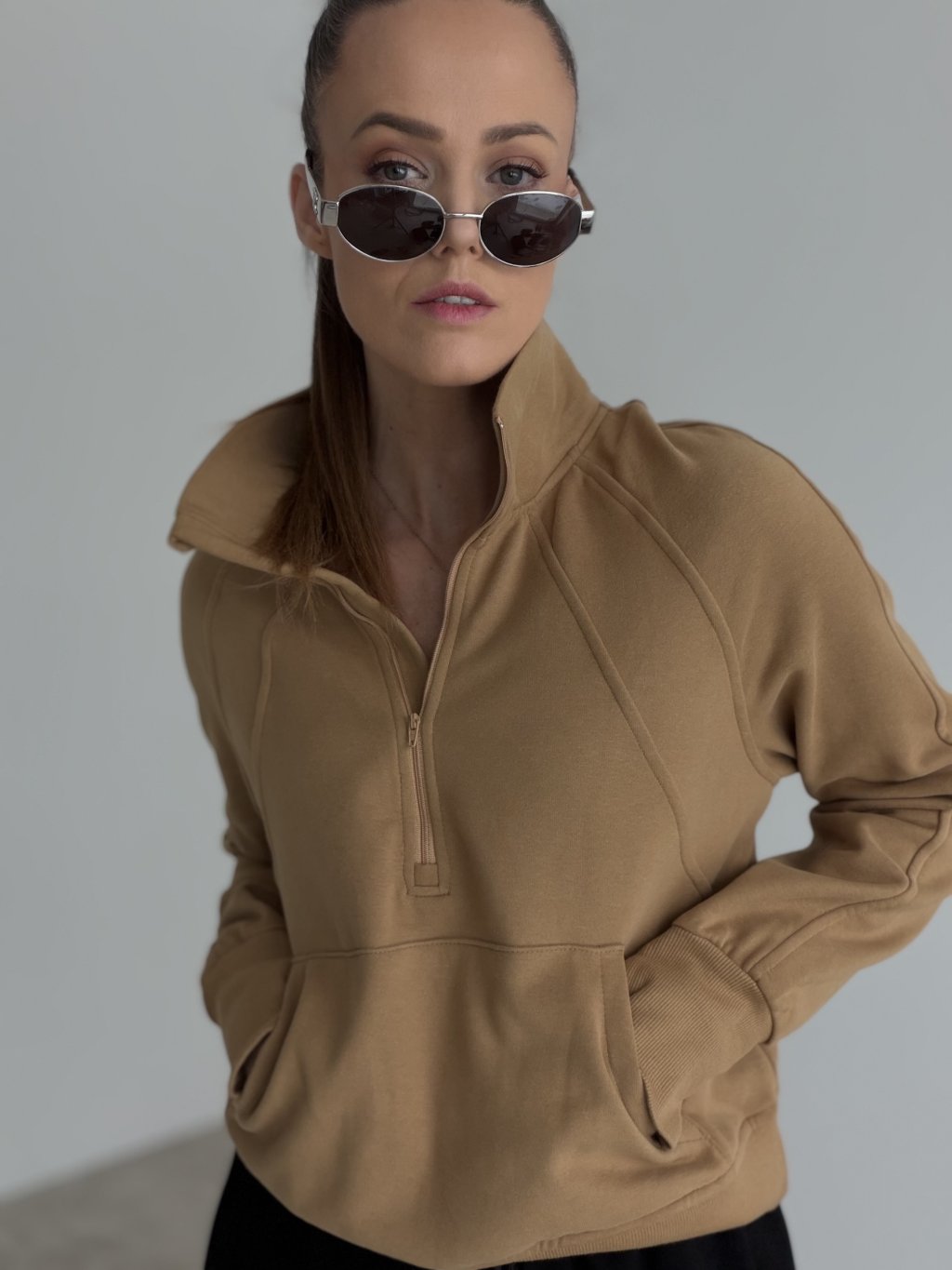 Mikina s polovičným zipsom a vyšším stojačikom. Voľnejší strih, predné vrecko a rebrované lemy pre pohodlné nosenie a čistý mestský look.