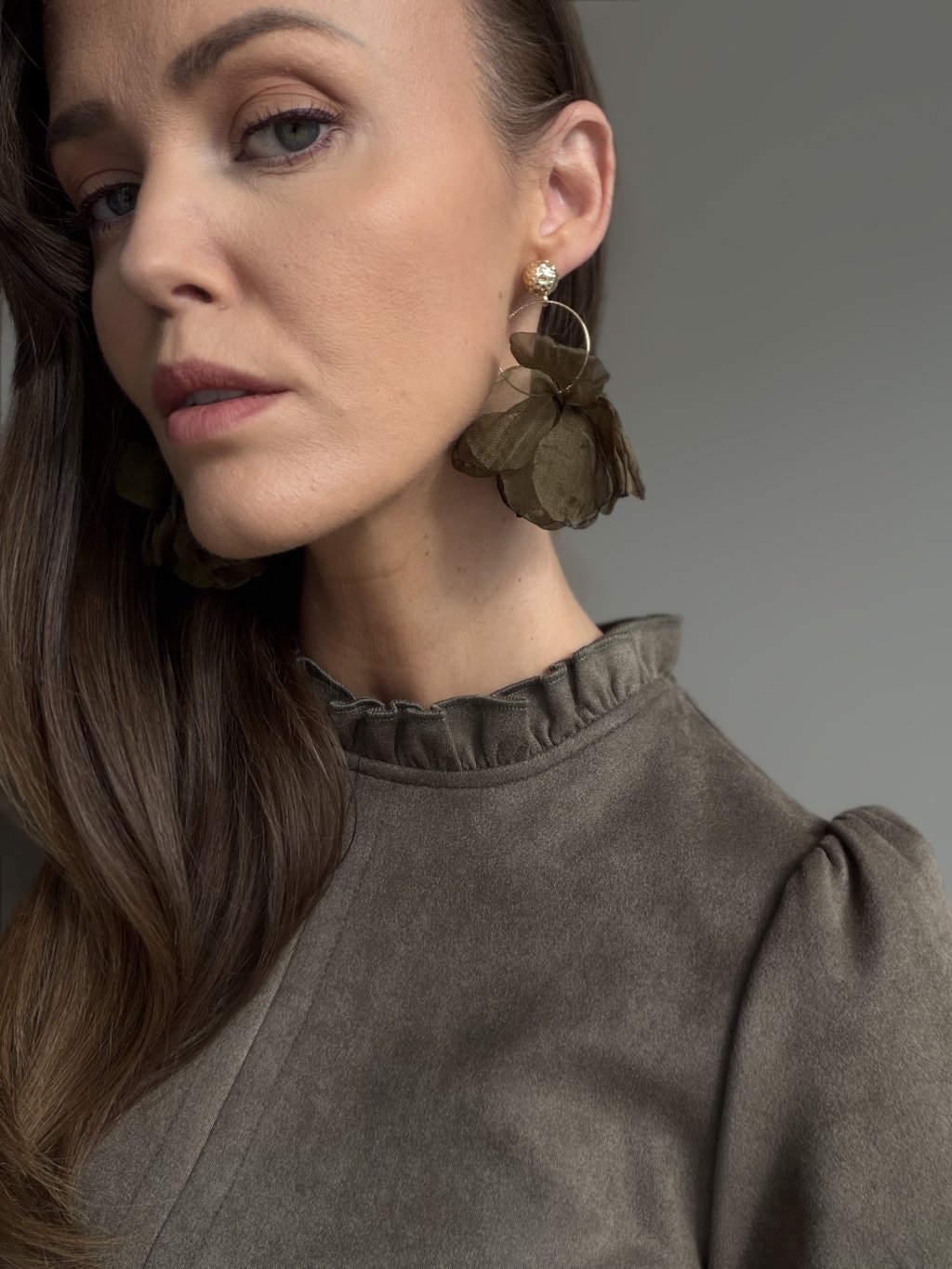 Tieto náušnice sú výrazným doplnkom, ktorý okamžite pritiahne pozornosť a dodá stylingu ľahkosť aj ženskosť. Kombinácia jemného kruhu s textilným kvetinovým detailom pôsobí elegantne, no zároveň moderne a hravo. Vďaka vrstvenému efektu kvetu vyzerajú náušnice bohatšie, krásne sa hýbu pri chôdzi a vytvárajú jemný, romantický dojem bez toho, aby pôsobili prehnane.