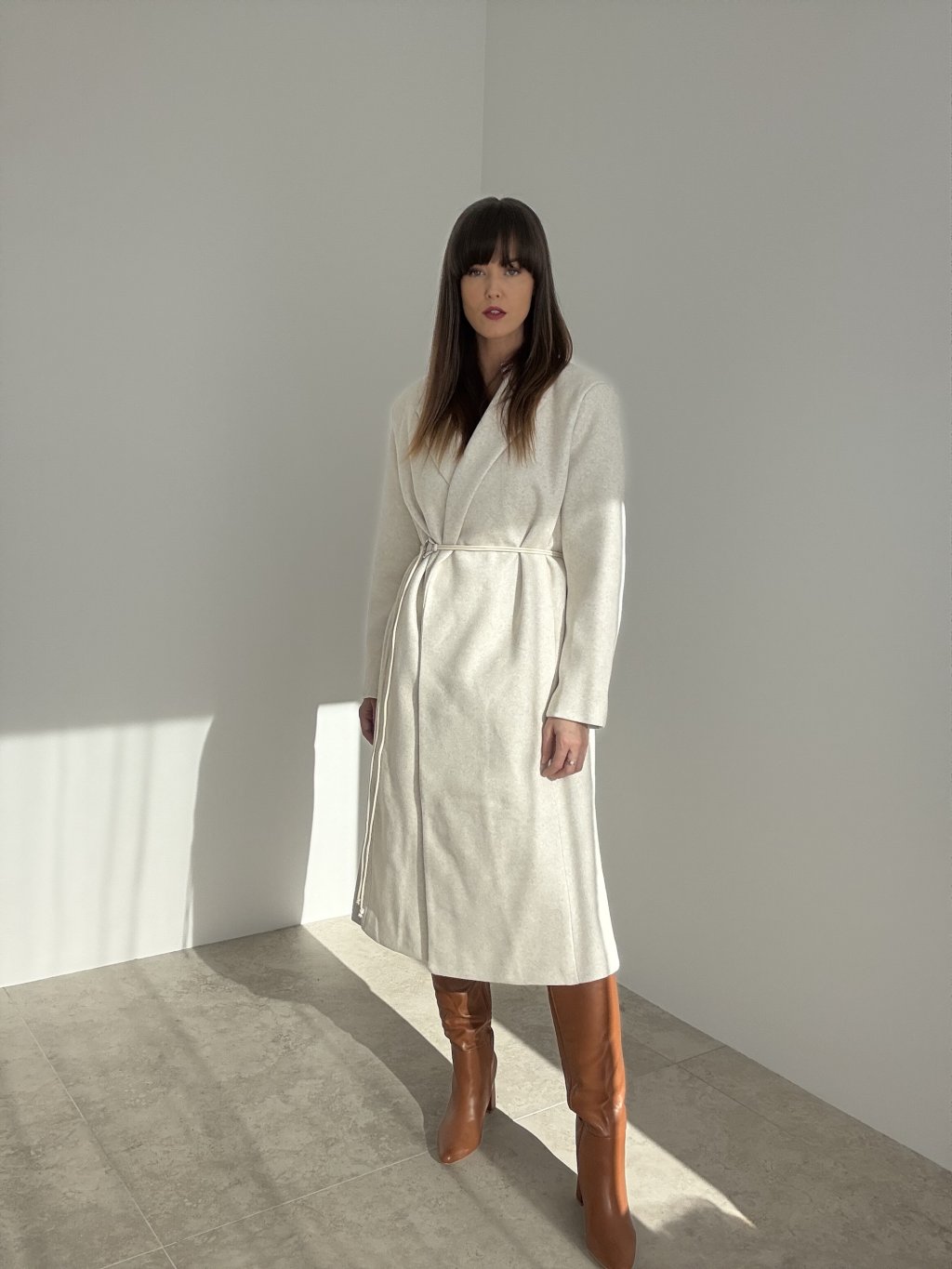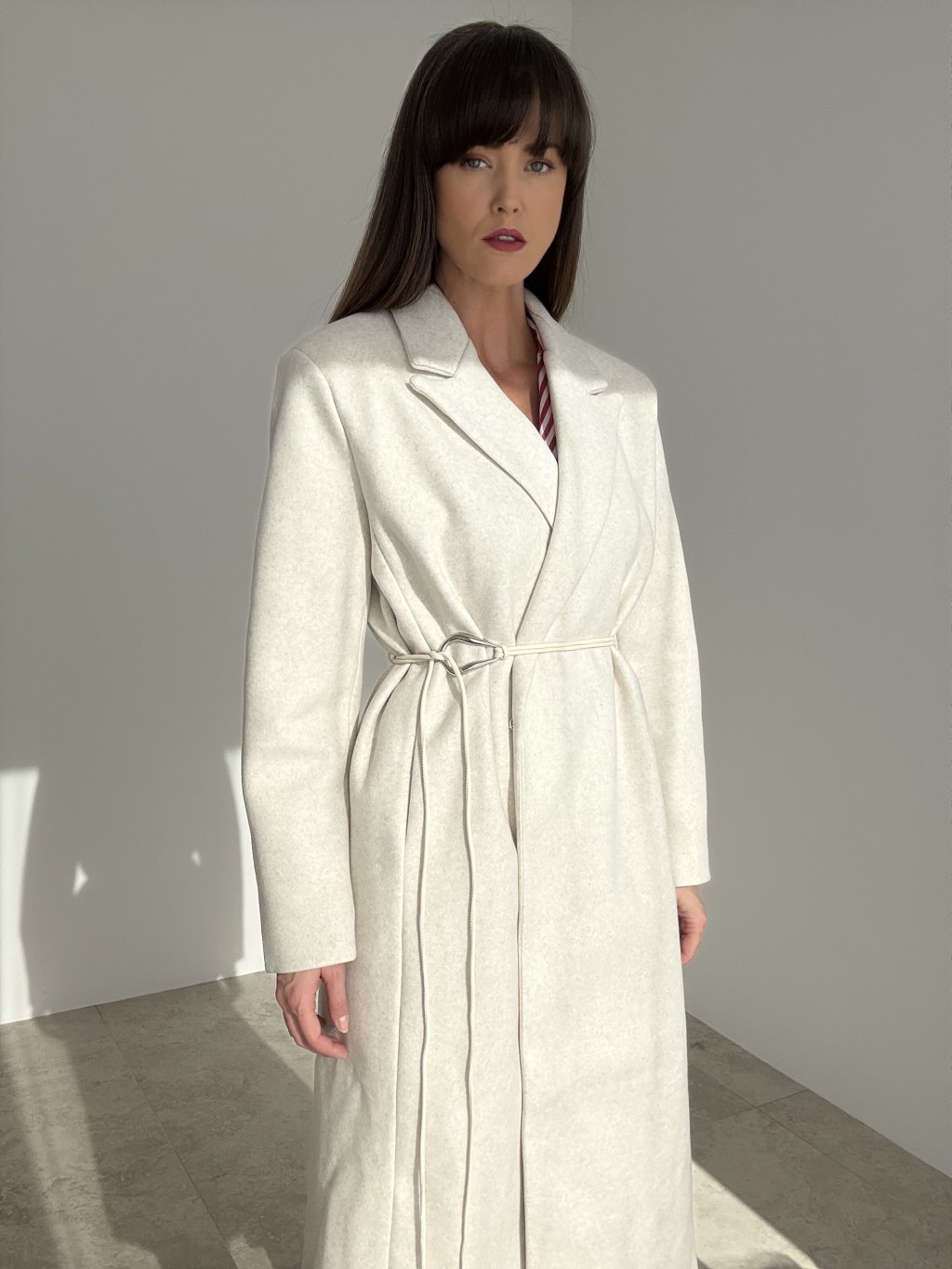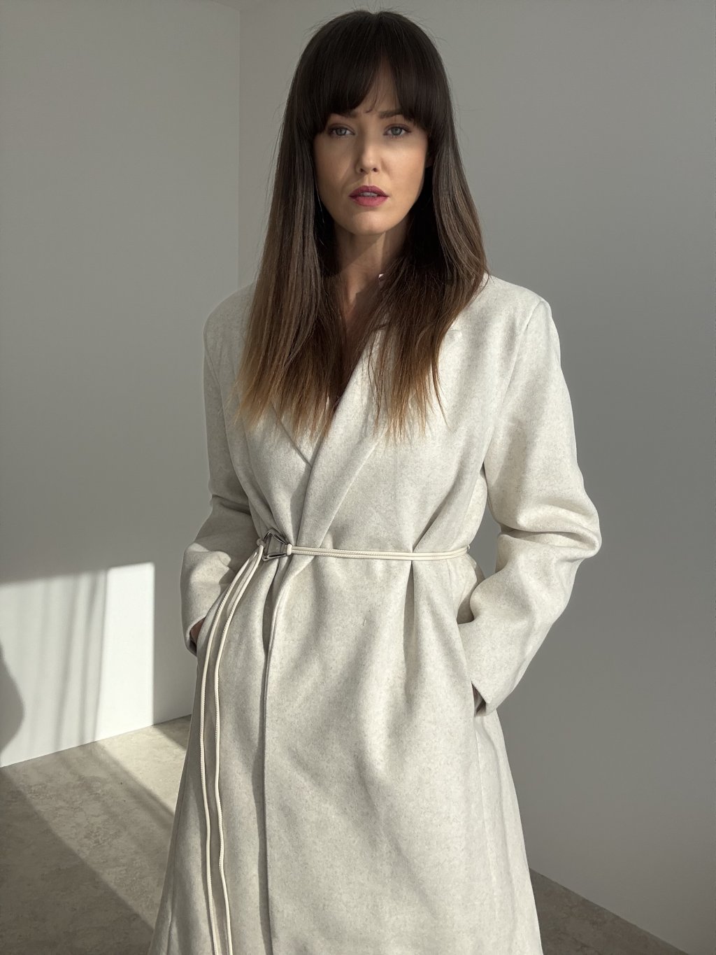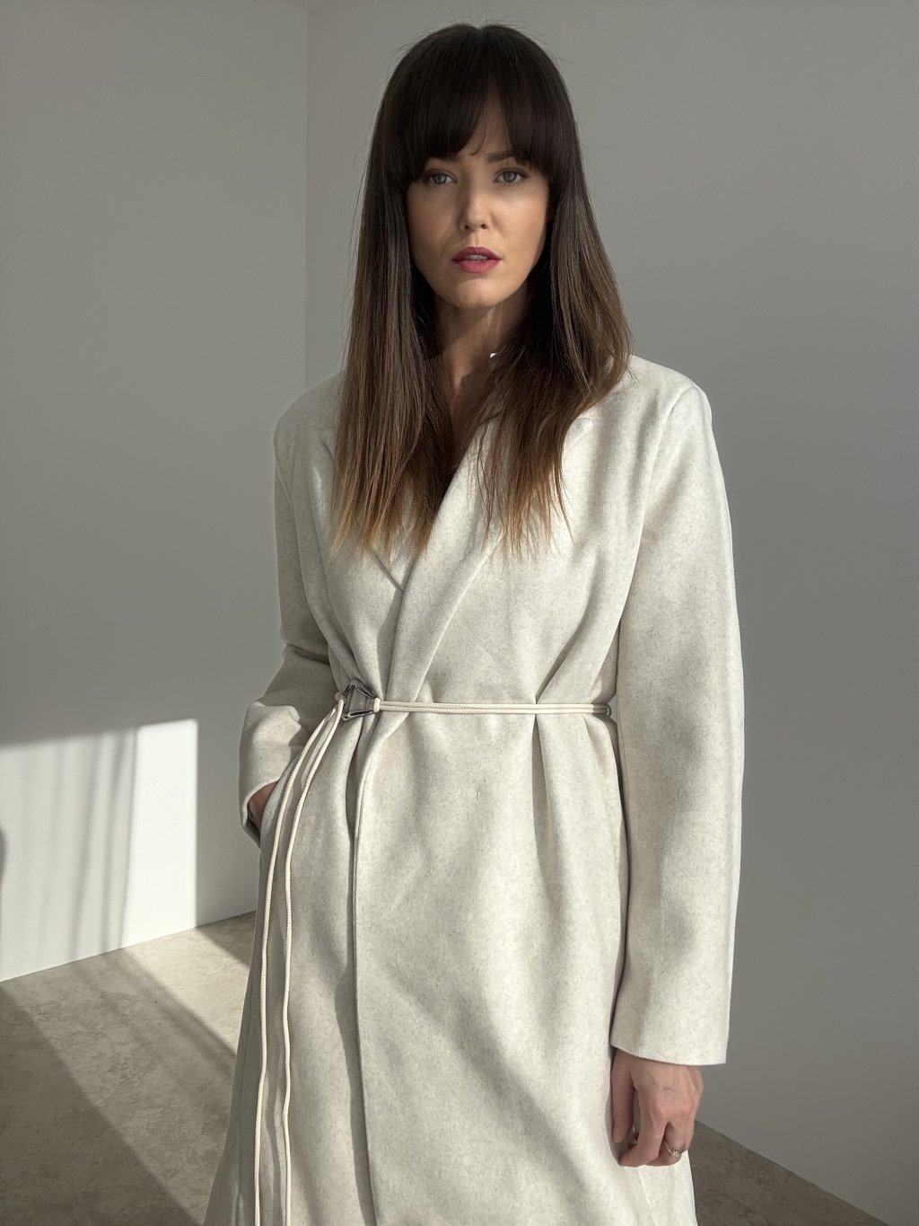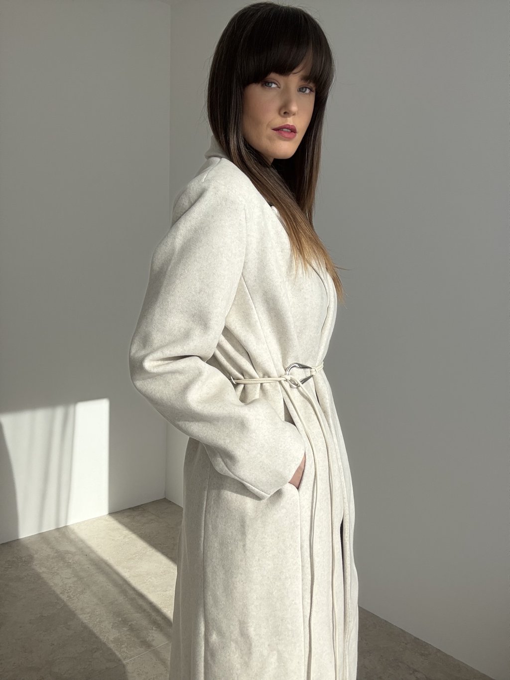 Dlhý oversize kabát s fazónou, bočnými vreckami a viazaním v páse.