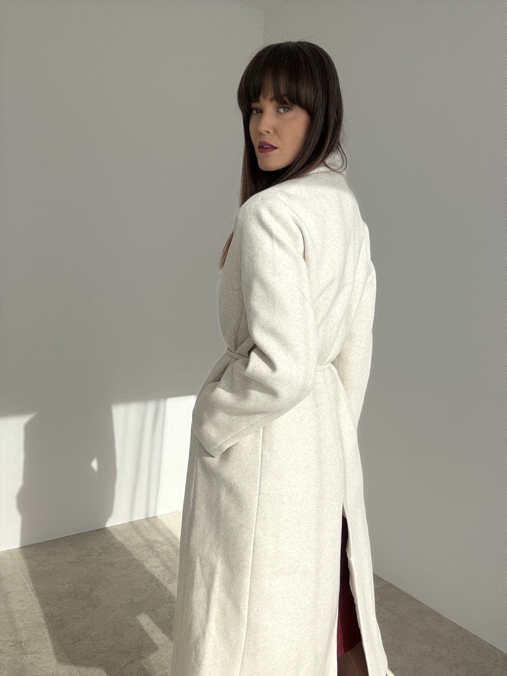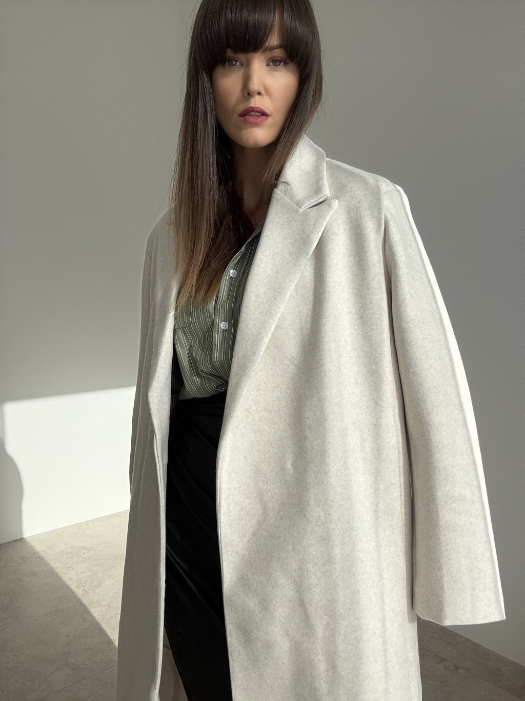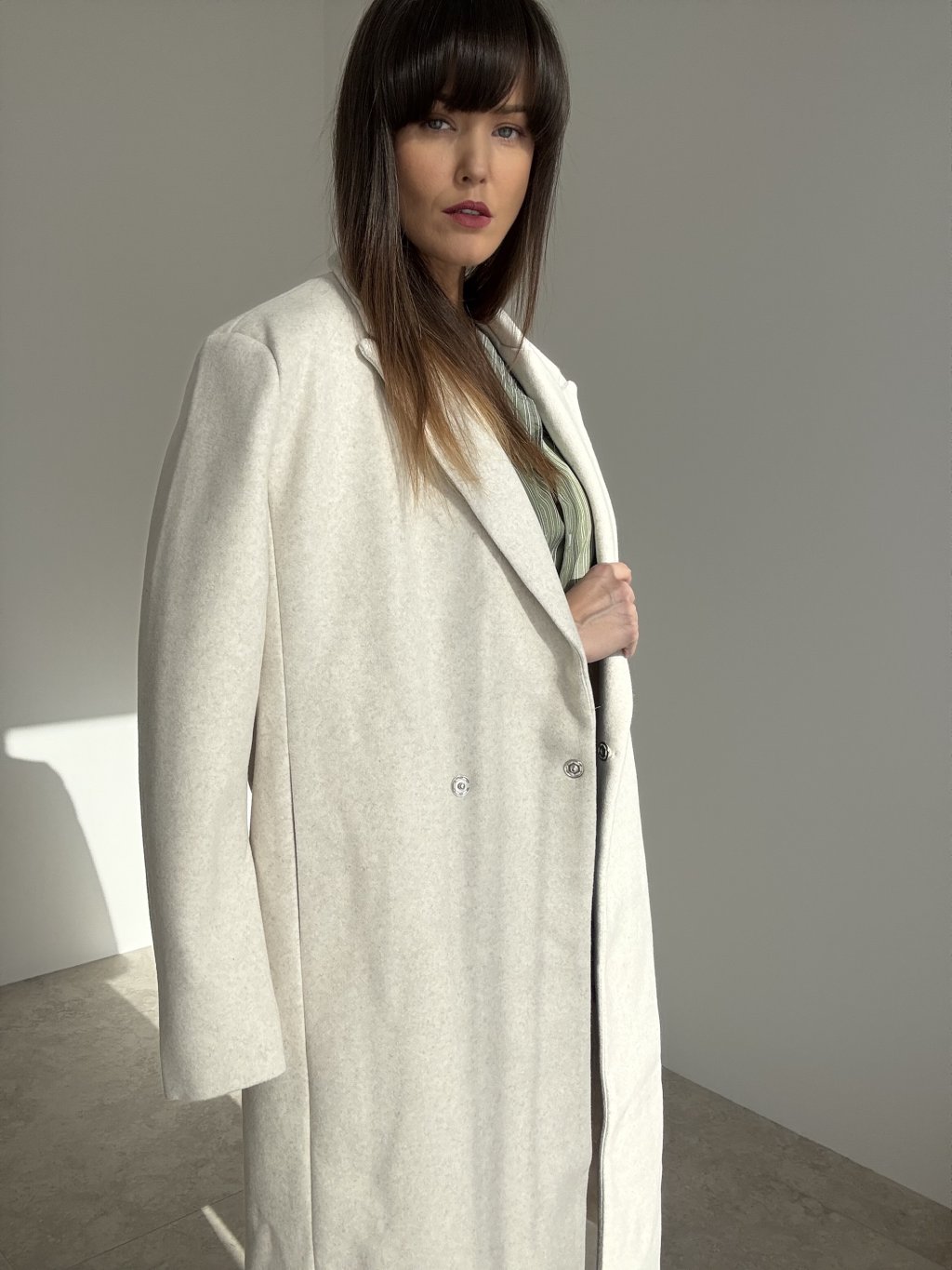 Dlhý oversize kabát s fazónovým golierom a čistou líniou, ktorý sa dá nosiť voľne alebo previazaný tenkým opaskom v páse. Uvoľnený strih s rovným rukávom príjemne vrství aj cez hrubší sveter. Skryté zapínanie vpredu pôsobí upravene, praktické bočné vrecká a zadný rázporok zaisťujú pohodlie pri chôdzi. Nadčasový kúsok do mesta aj do práce.