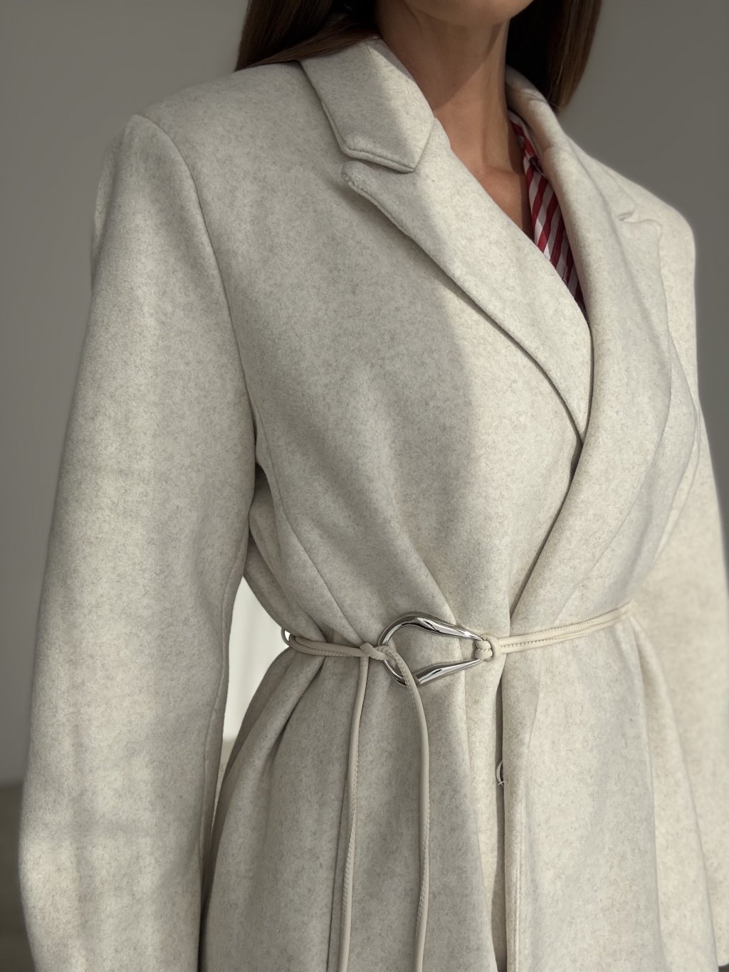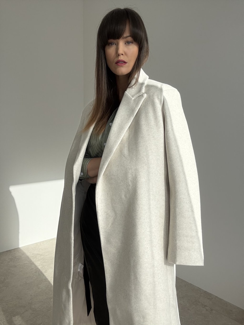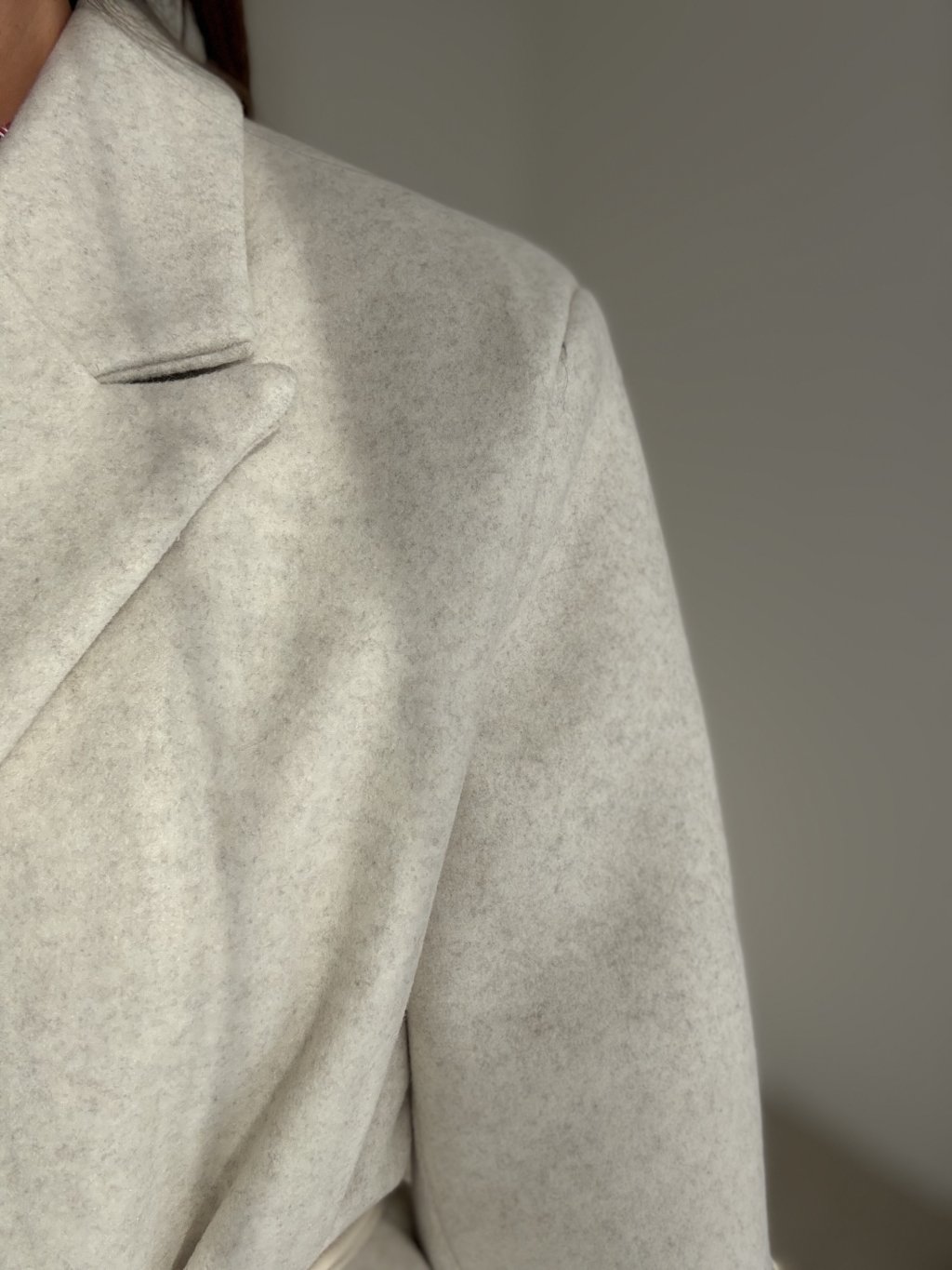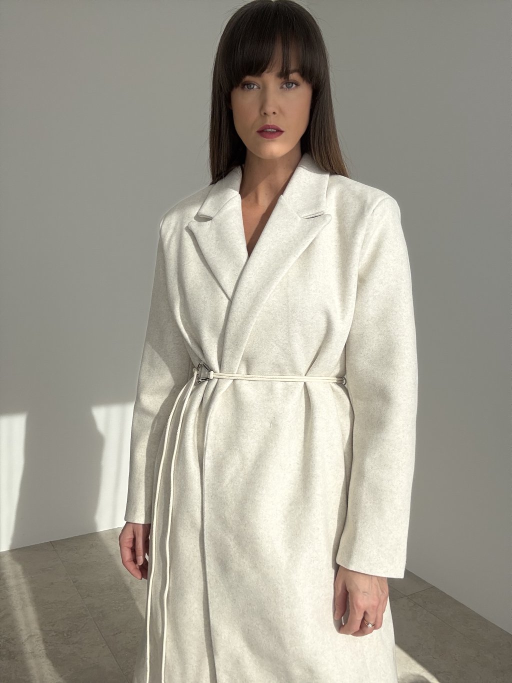 Dlhý oversize kabát s fazónovým golierom a čistou líniou, ktorý sa dá nosiť voľne alebo previazaný tenkým opaskom v páse. Uvoľnený strih s rovným rukávom príjemne vrství aj cez hrubší sveter. Skryté zapínanie vpredu pôsobí upravene, praktické bočné vrecká a zadný rázporok zaisťujú pohodlie pri chôdzi. Nadčasový kúsok do mesta aj do práce.