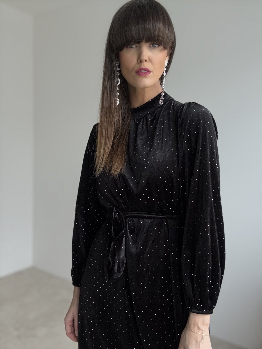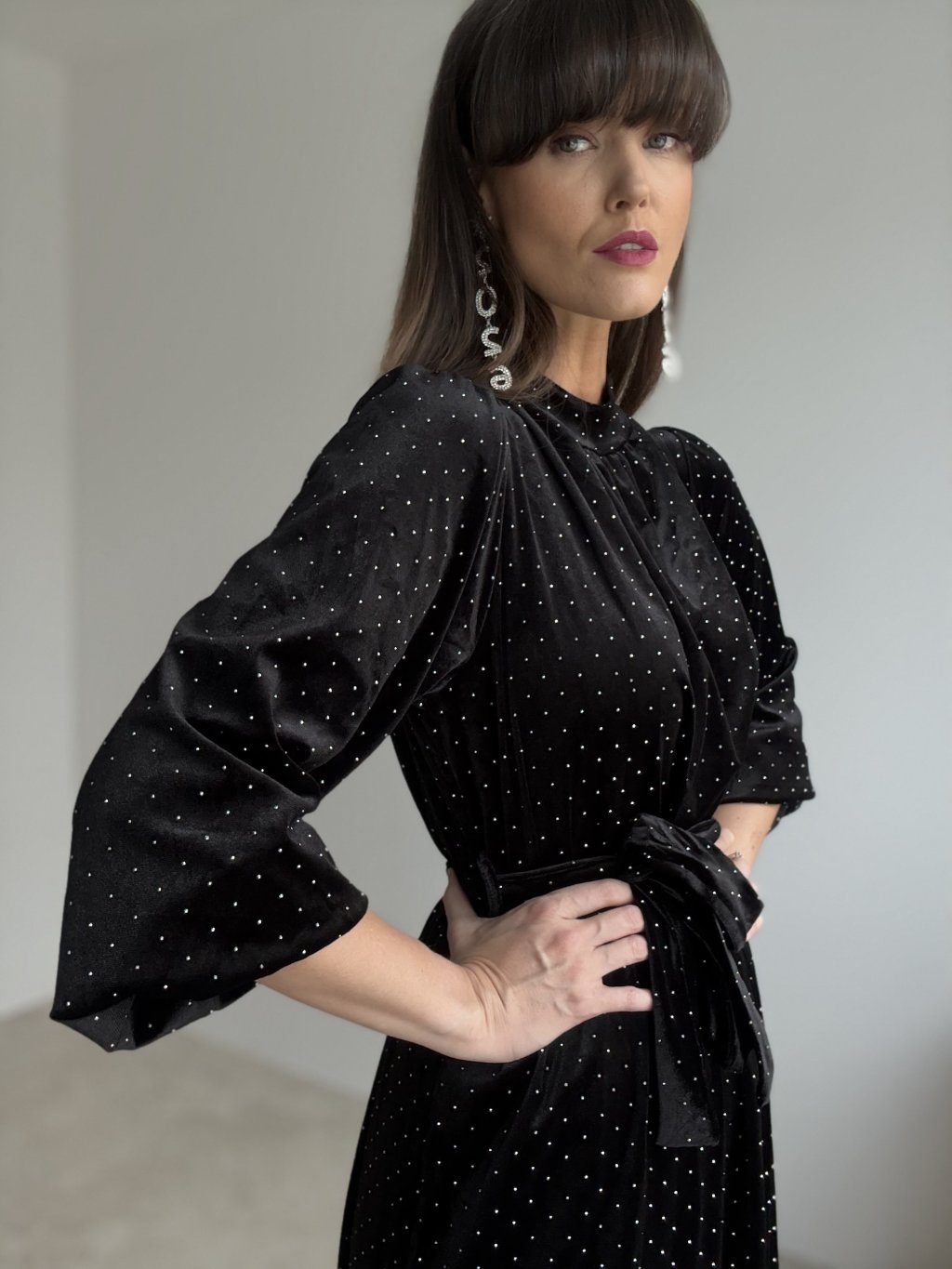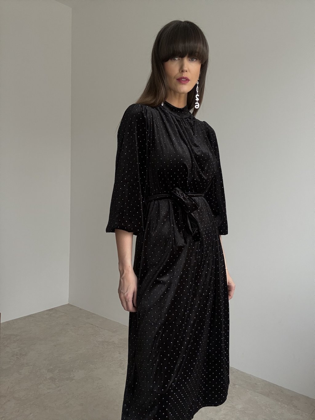 Elegancka aksamitna sukienka z wiązaniem w talii i delikatnie obszernymi rękawami, idealna na świąteczne i wieczorne okazje.