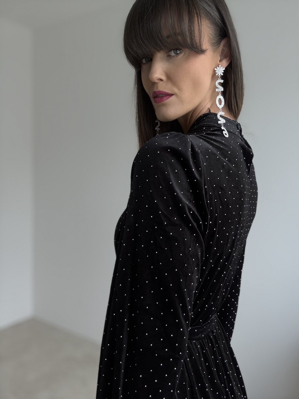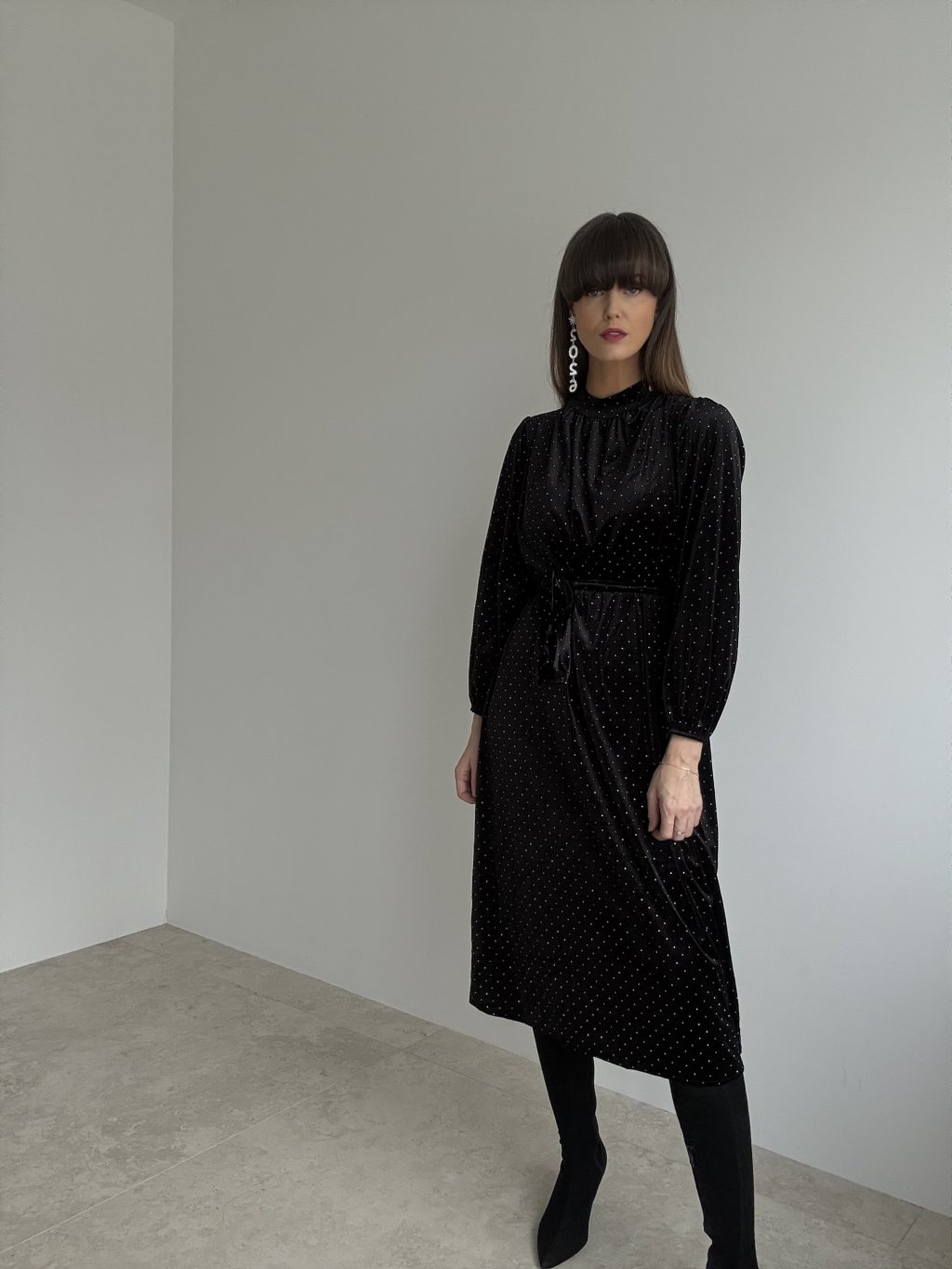 Aksamitna sukienka o eleganckim, delikatnie połyskującym wykończeniu pięknie dopasowuje się do sylwetki i nadaje jej kobiecy charakter. Rękawy z lekką objętością dodają sukience wyjątkowego wyglądu, a wiązanie w talii podkreśla figurę i tworzy harmonijny kształt. Subtelne zapięcie przy szyi z tyłu stanowi elegancki detal. To idealna propozycja na świąteczne momenty, uroczystości oraz wieczorne wyjścia.
