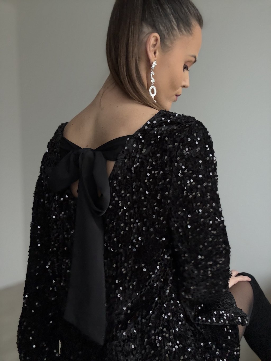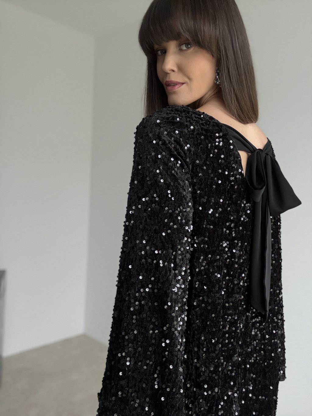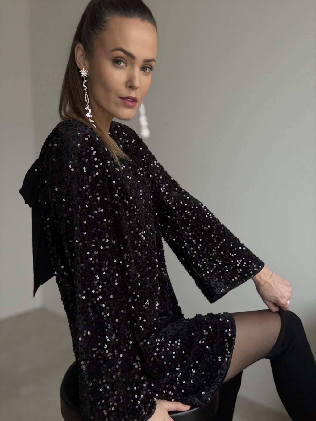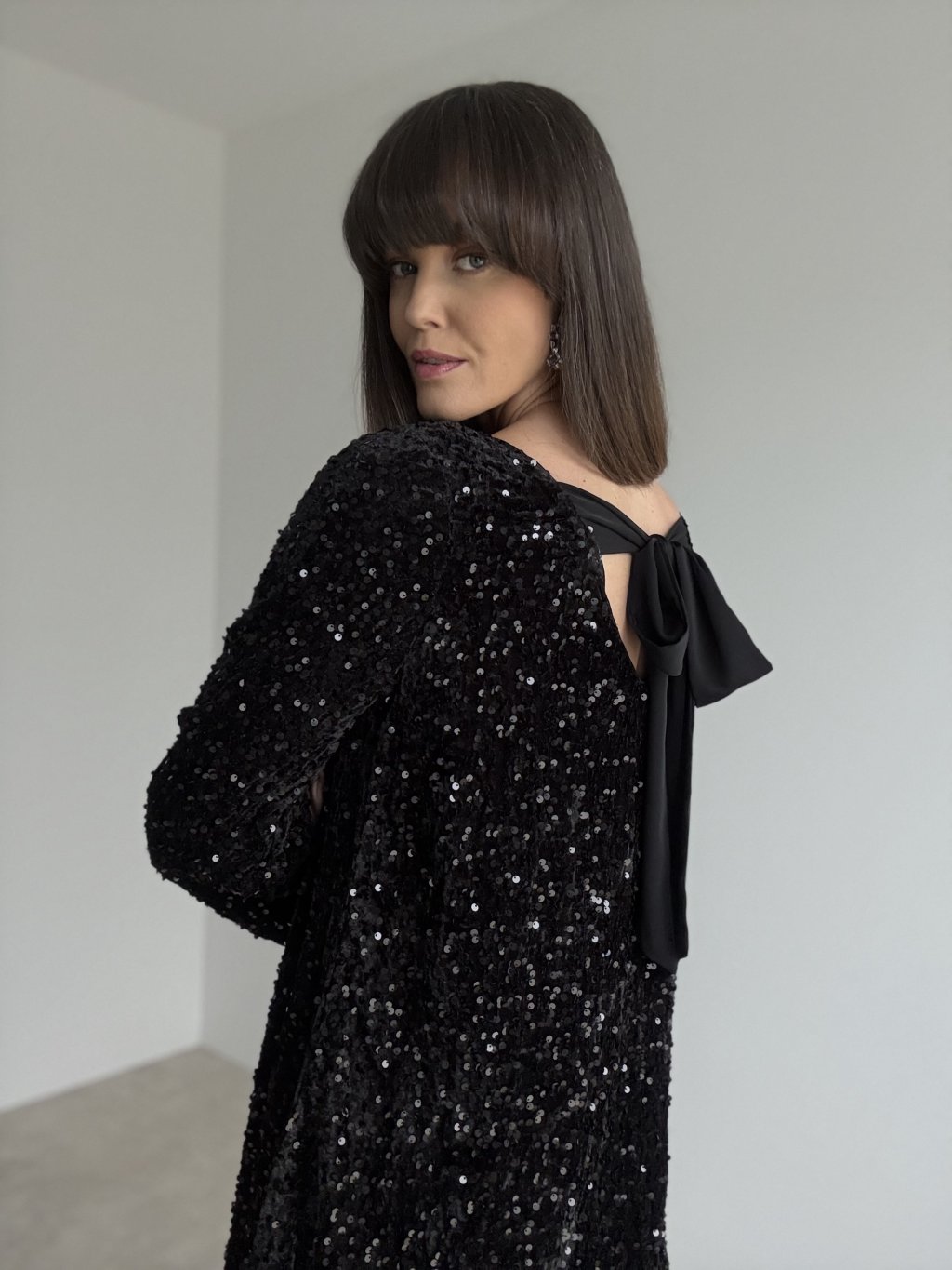 Sukienka została zaprojektowana jako elegancki, wyrazisty model, który przyciąga uwagę przy każdym ruchu. Cała powierzchnia jest bogato zdobiona cekinami, co nadaje jej luksusowego i lśniącego charakteru. Krój jest wygodny, lekko luźny, z pięknie uformowanymi rękawami, które dodają lekkości i kobiecości. Tył zdobi wiązana kokarda, tworząca subtelny i romantyczny akcent.