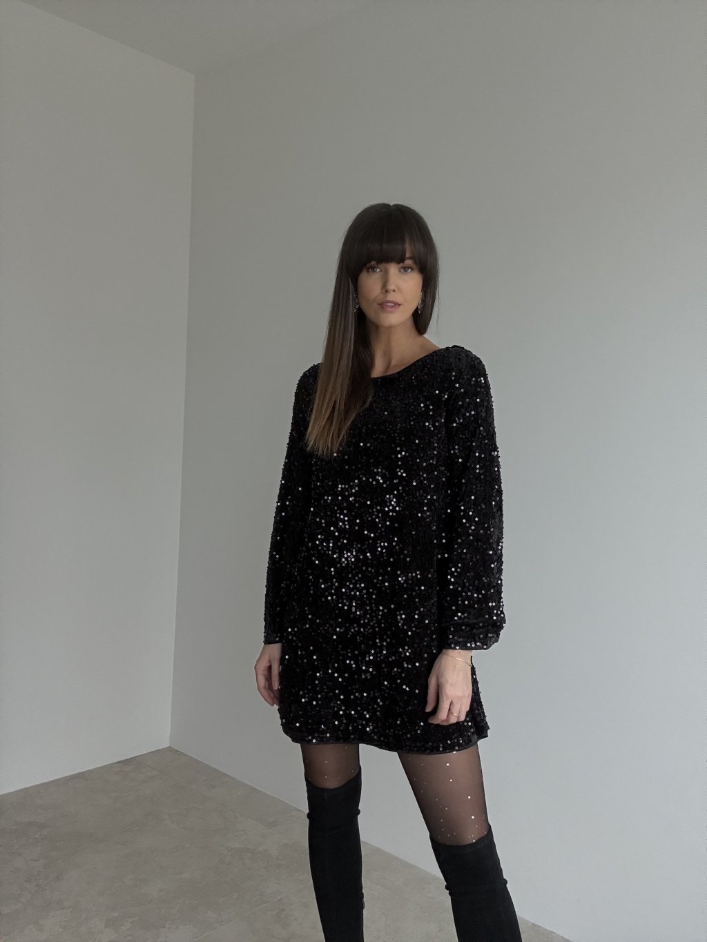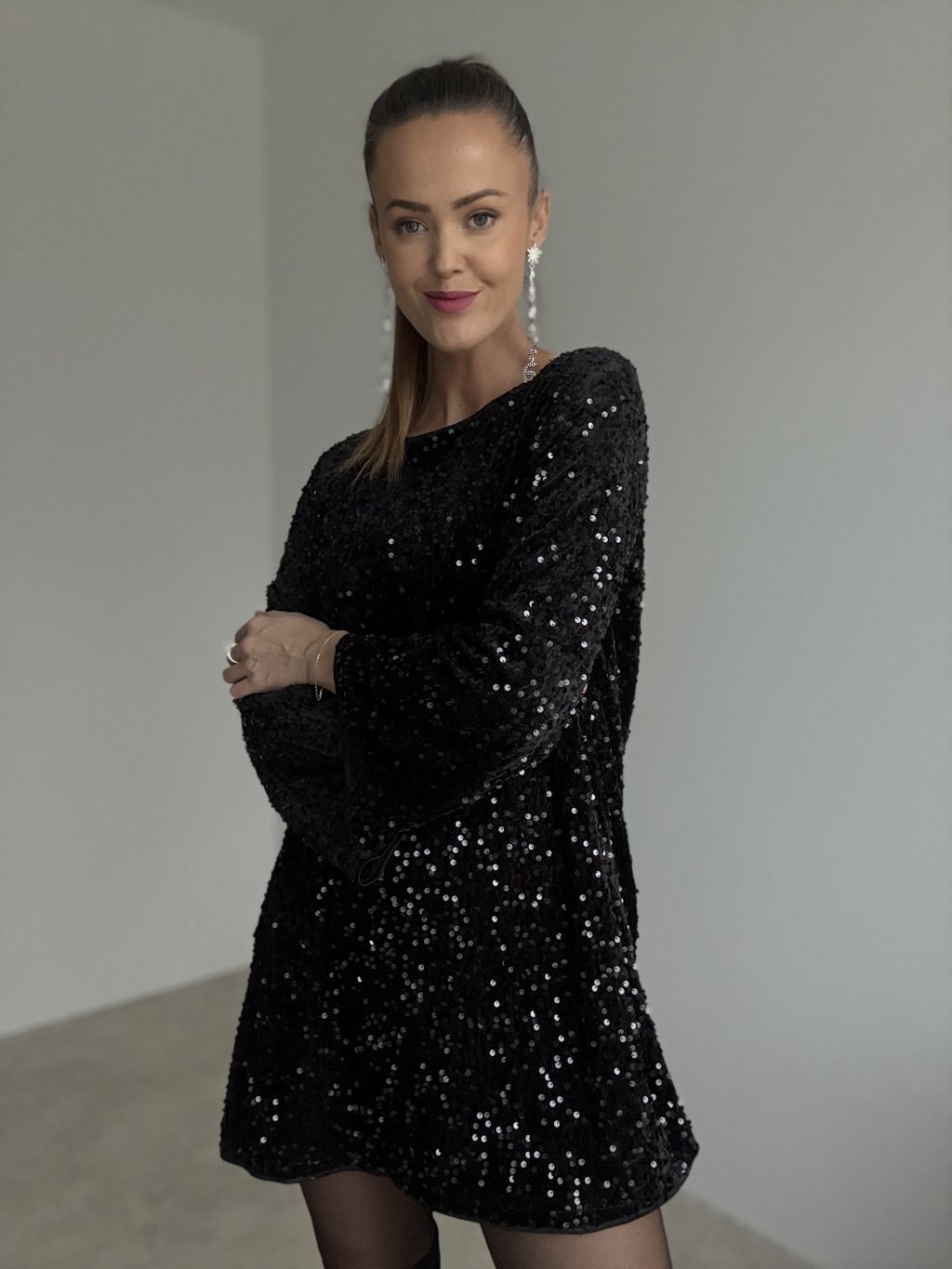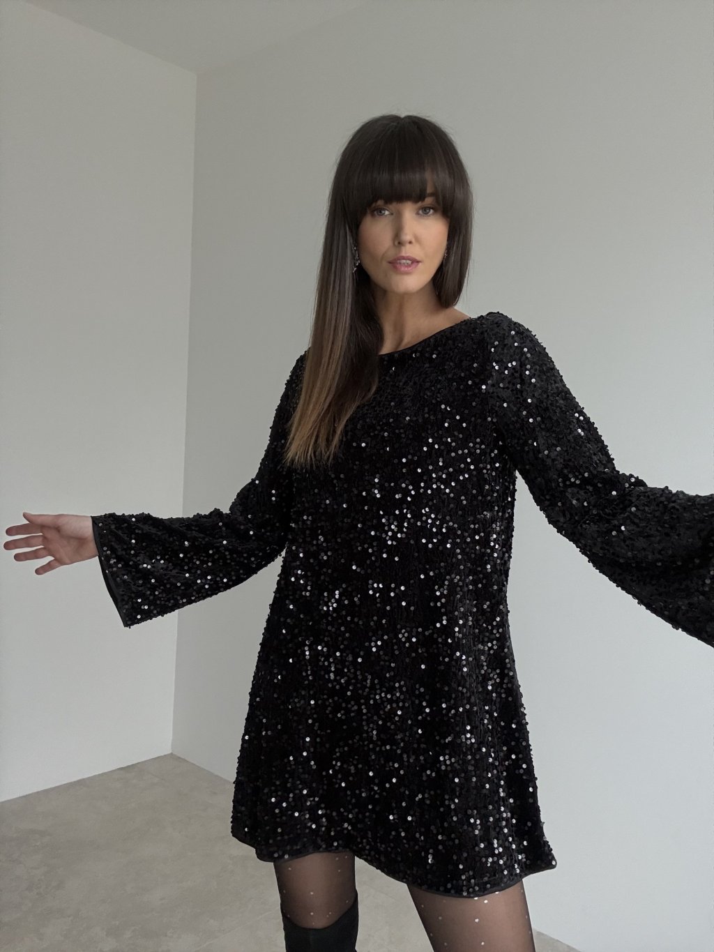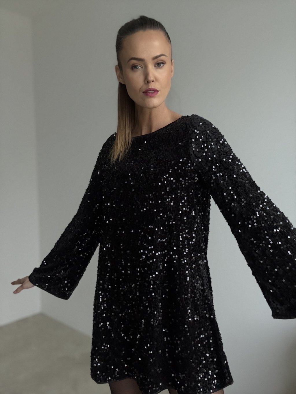 Sukienka została zaprojektowana jako elegancki, wyrazisty model, który przyciąga uwagę przy każdym ruchu. Cała powierzchnia jest bogato zdobiona cekinami, co nadaje jej luksusowego i lśniącego charakteru. Krój jest wygodny, lekko luźny, z pięknie uformowanymi rękawami, które dodają lekkości i kobiecości. Tył zdobi wiązana kokarda, tworząca subtelny i romantyczny akcent.