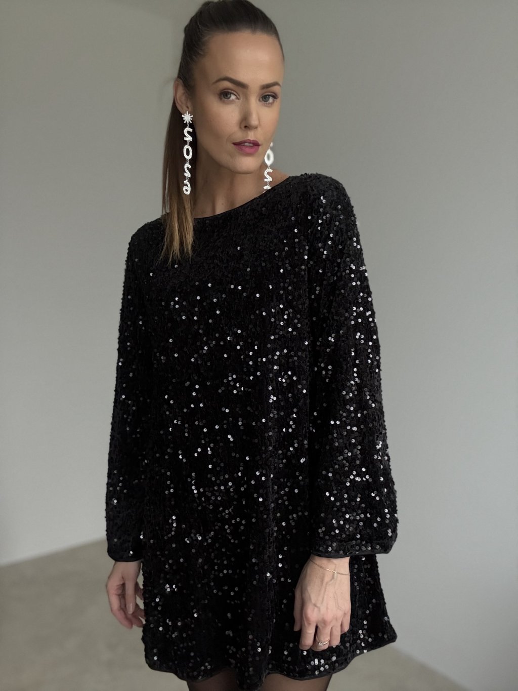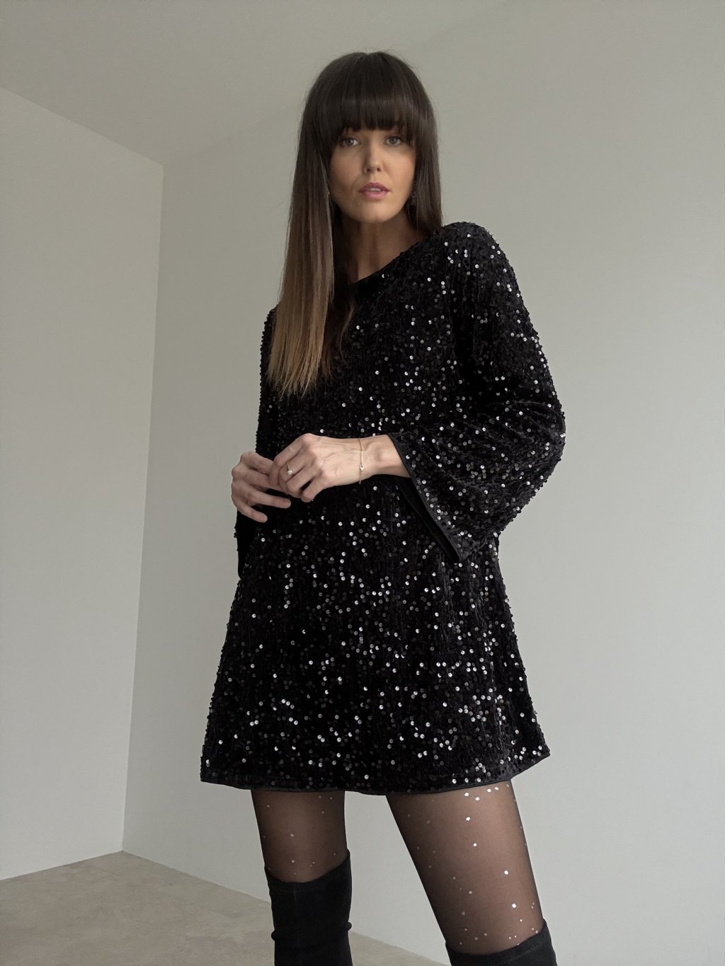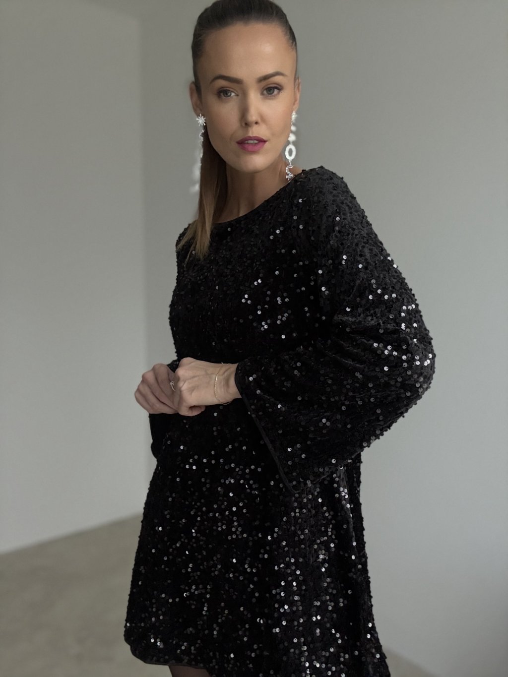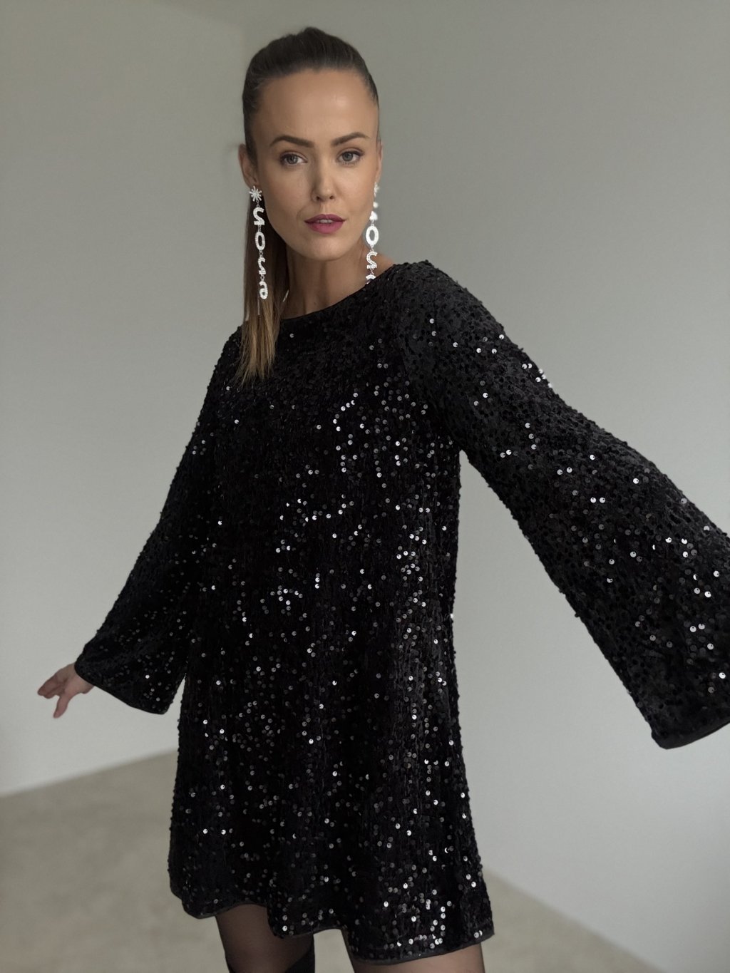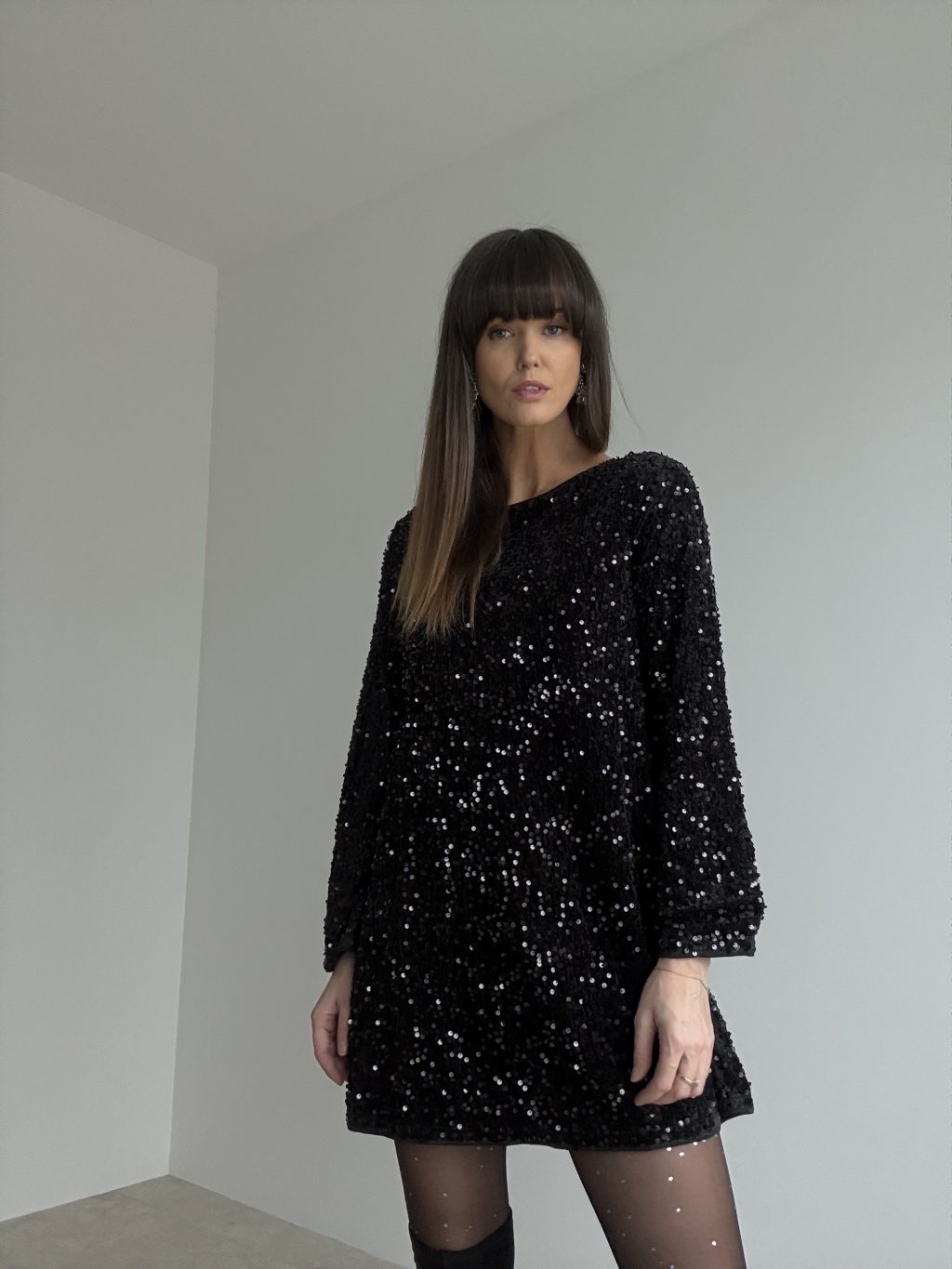 Sukienka została zaprojektowana jako elegancki, wyrazisty model, który przyciąga uwagę przy każdym ruchu. Cała powierzchnia jest bogato zdobiona cekinami, co nadaje jej luksusowego i lśniącego charakteru. Krój jest wygodny, lekko luźny, z pięknie uformowanymi rękawami, które dodają lekkości i kobiecości. Tył zdobi wiązana kokarda, tworząca subtelny i romantyczny akcent.