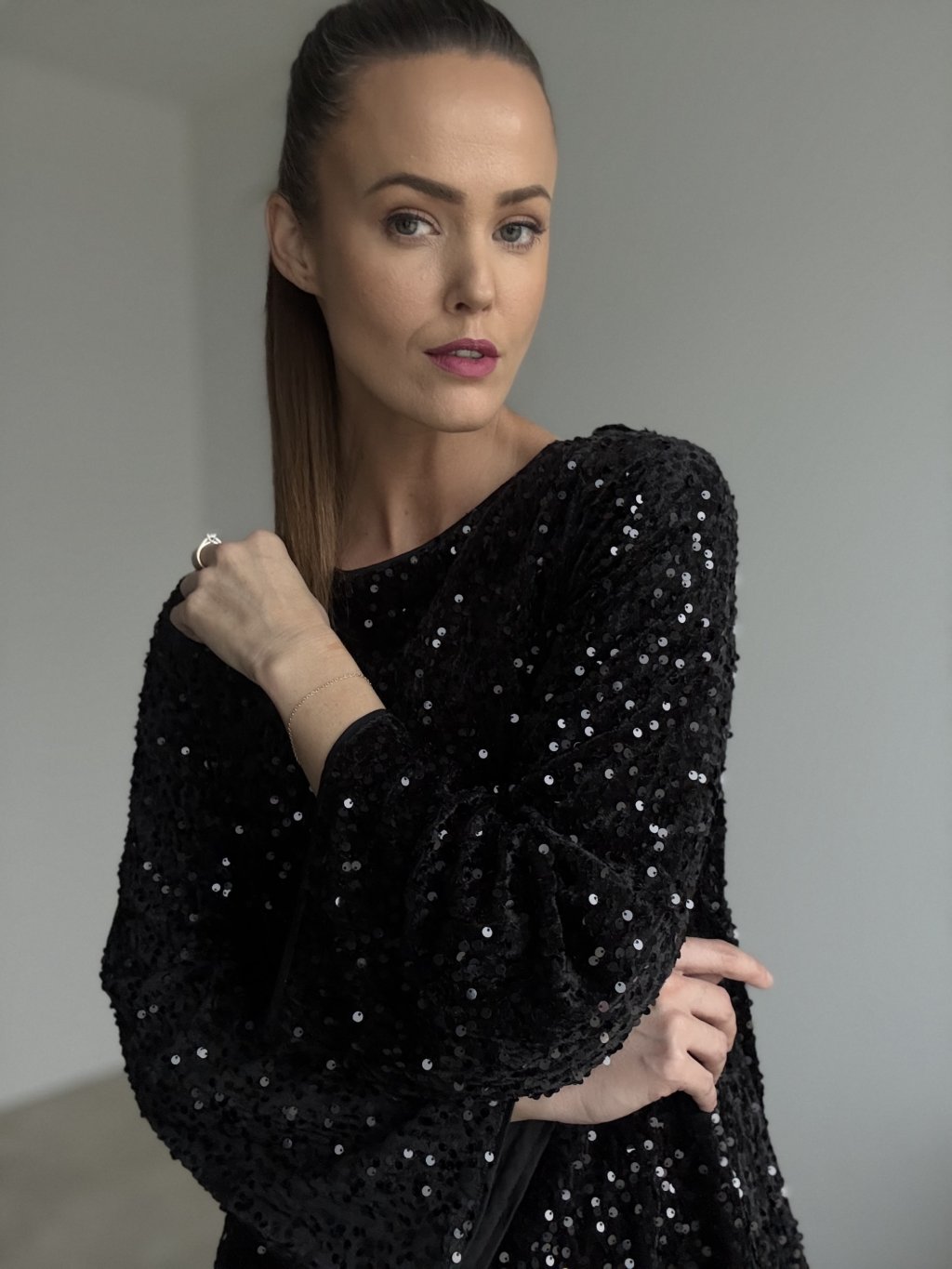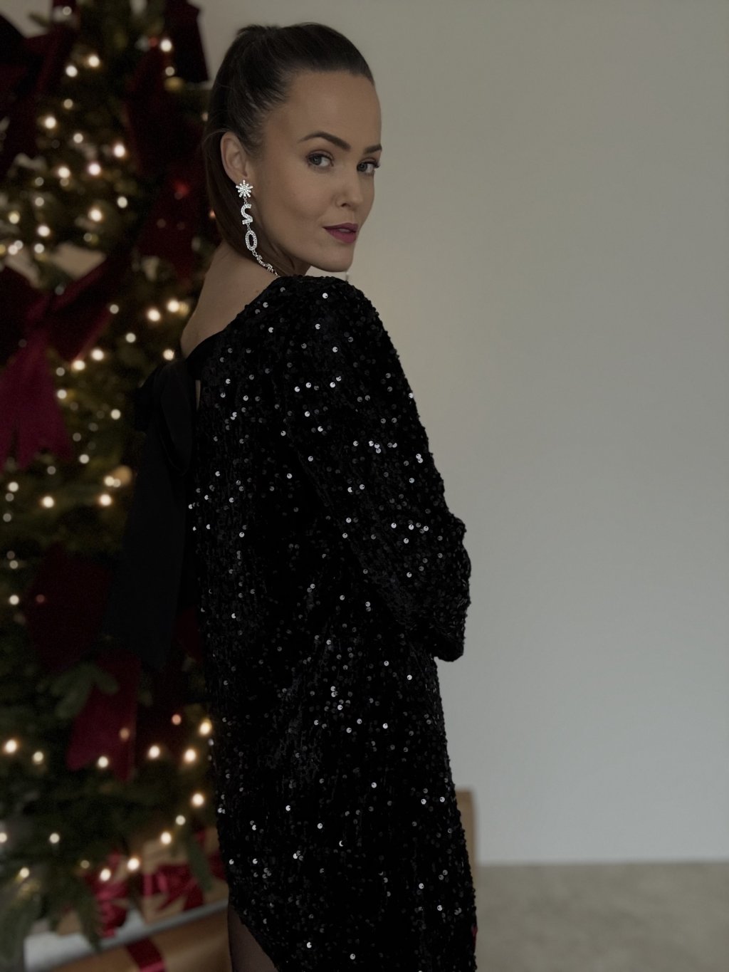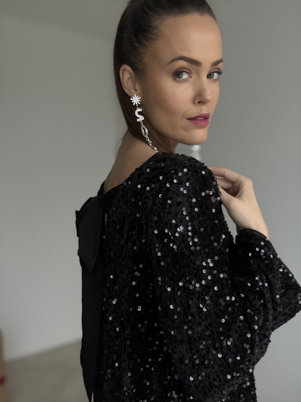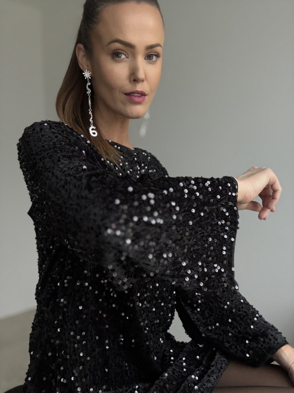 Sukienka została zaprojektowana jako elegancki, wyrazisty model, który przyciąga uwagę przy każdym ruchu. Cała powierzchnia jest bogato zdobiona cekinami, co nadaje jej luksusowego i lśniącego charakteru. Krój jest wygodny, lekko luźny, z pięknie uformowanymi rękawami, które dodają lekkości i kobiecości. Tył zdobi wiązana kokarda, tworząca subtelny i romantyczny akcent.