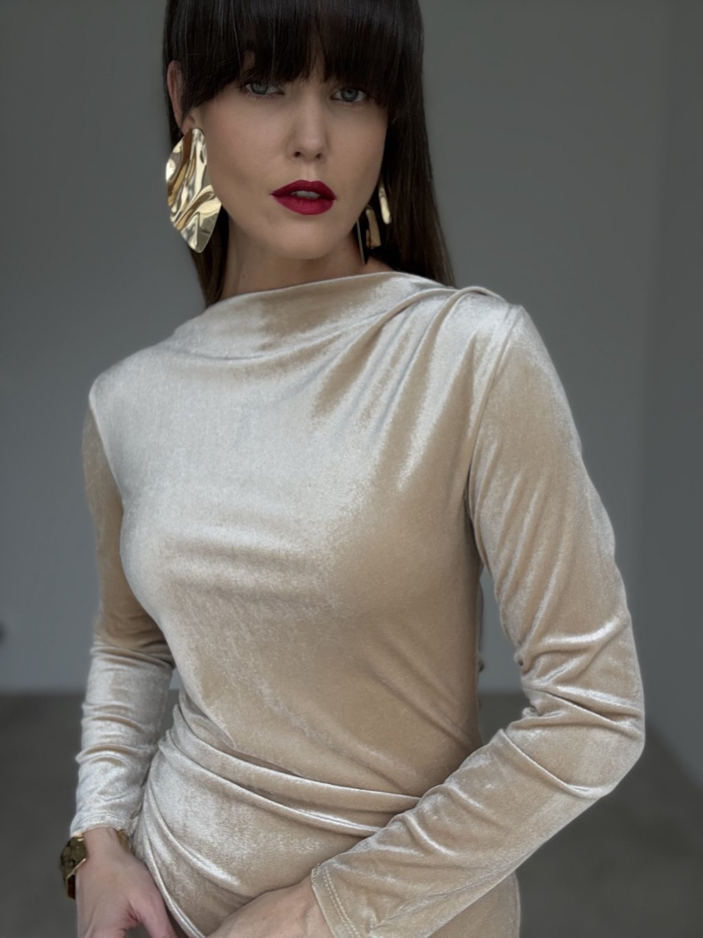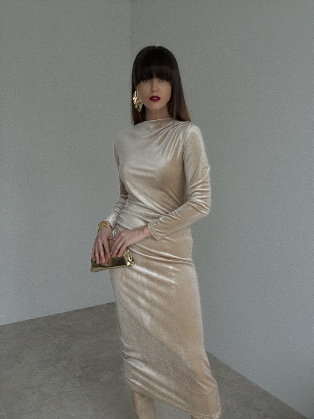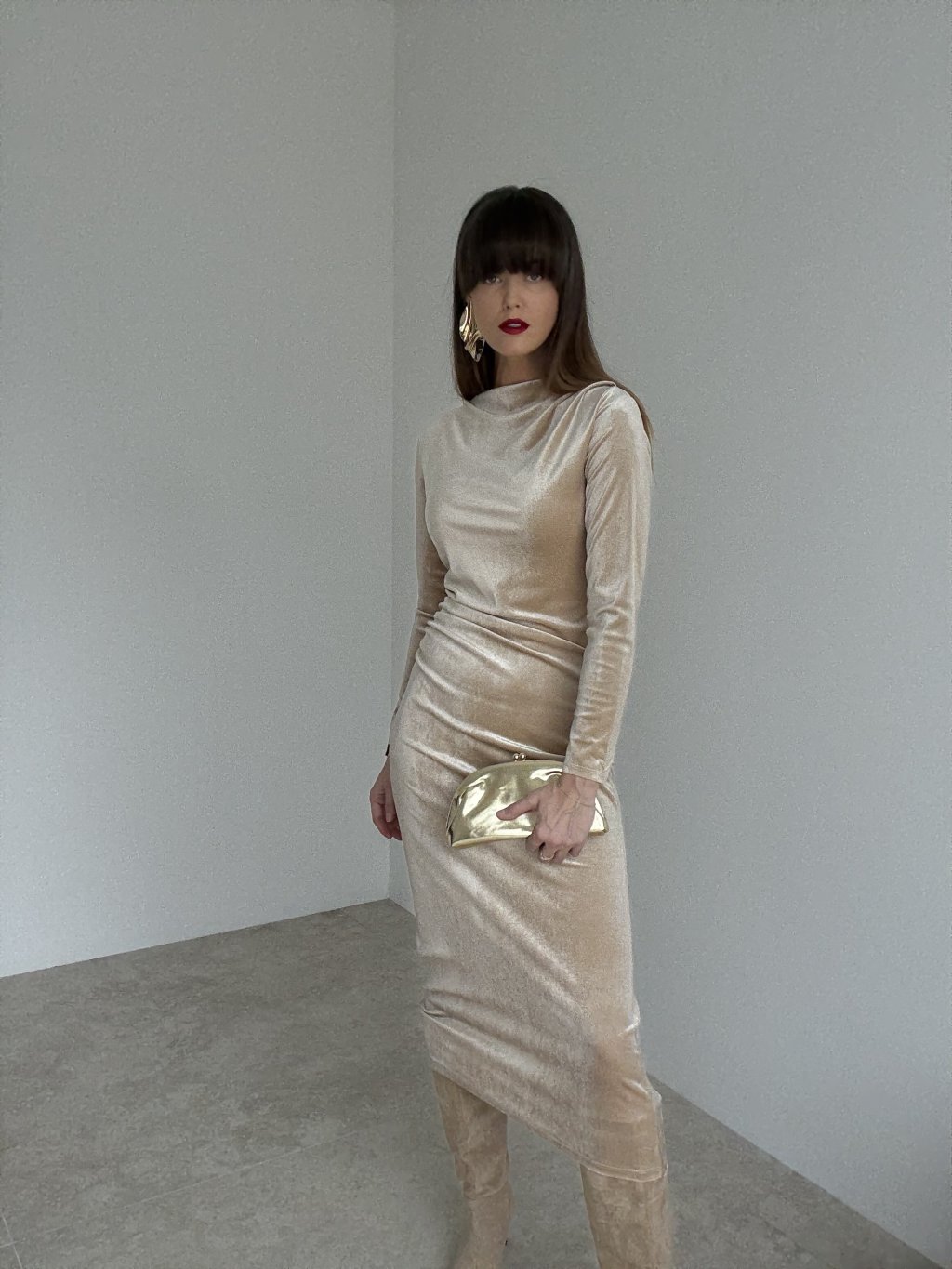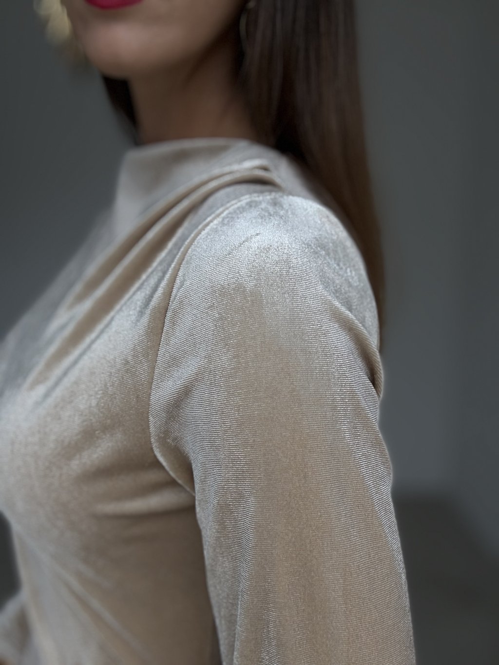 Elegancka aksamitna sukienka z subtelnym połyskiem i miękkim, opływowym układem materiału, który podkreśla sylwetkę i gwarantuje wysoki komfort. Gładka, elastyczna dzianina delikatnie dopasowuje się do ciała, a długie rękawy oraz lekko marszczona góra z miękką stójką nadają całości wyrafinowany charakter. Długość midi wysmukla figurę – model sprawdzi się na wyjścia, wieczorne okazje i świąteczne chwile.