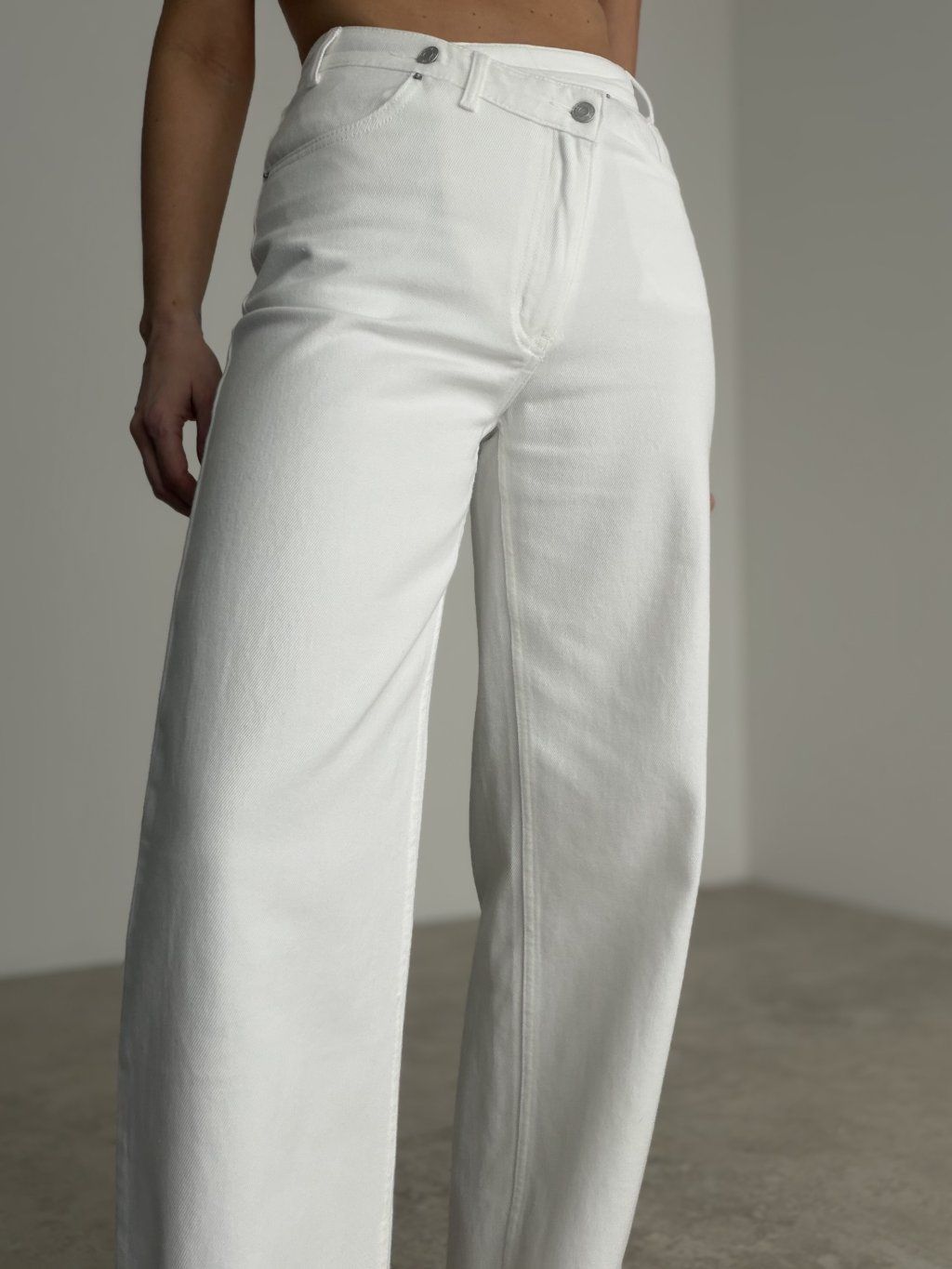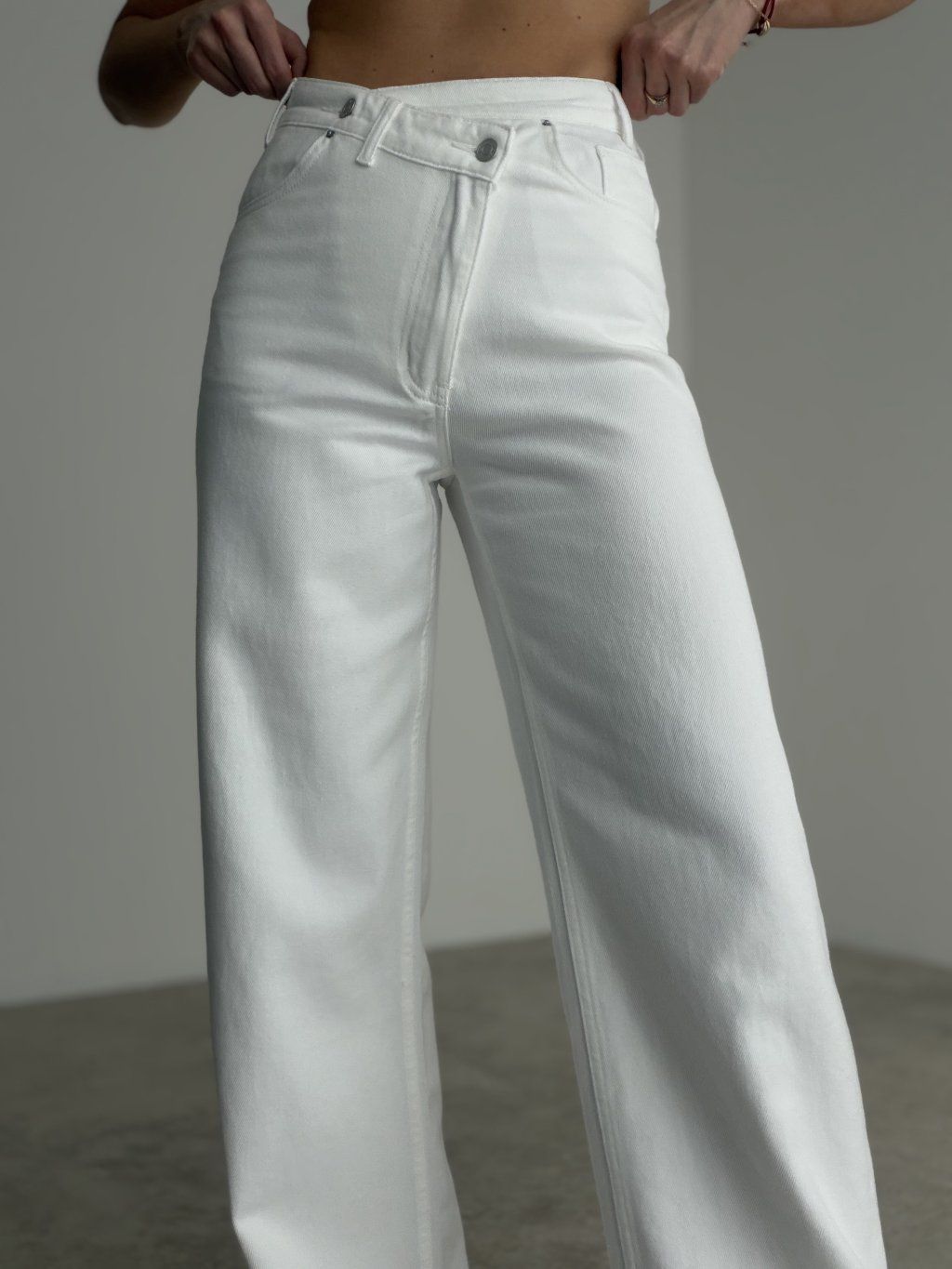 Asymetryczne jeansy o szerokim kroju i wyrazistym detalu w pasie nadają stylizacji nowoczesny i oryginalny charakter. Są wygodne, stylowe i łatwe do łączenia na różne okazje.