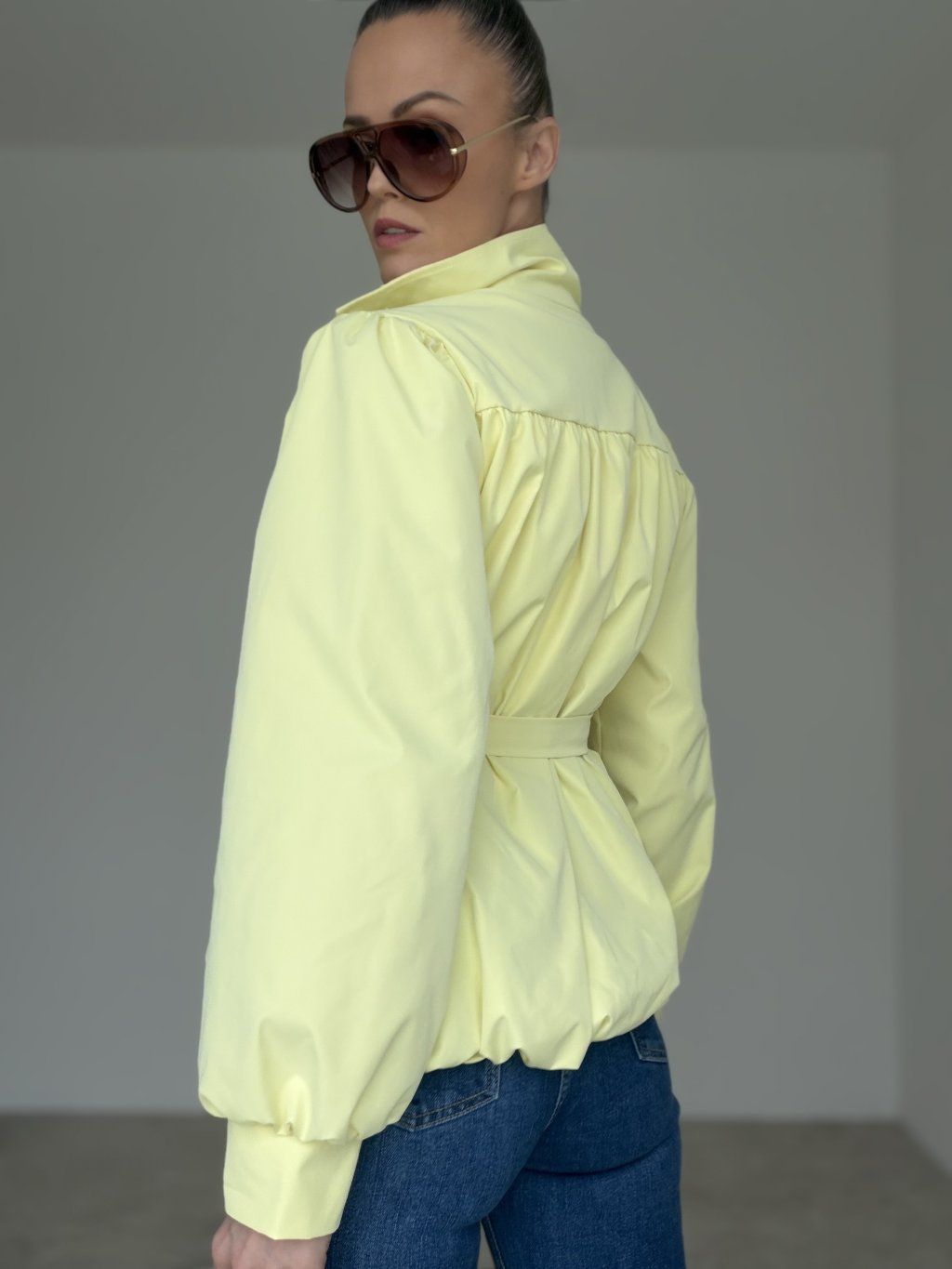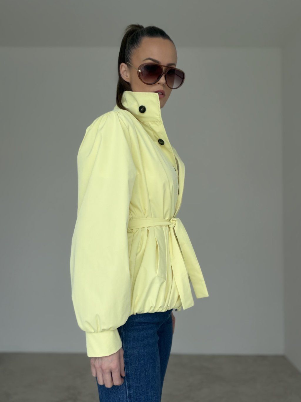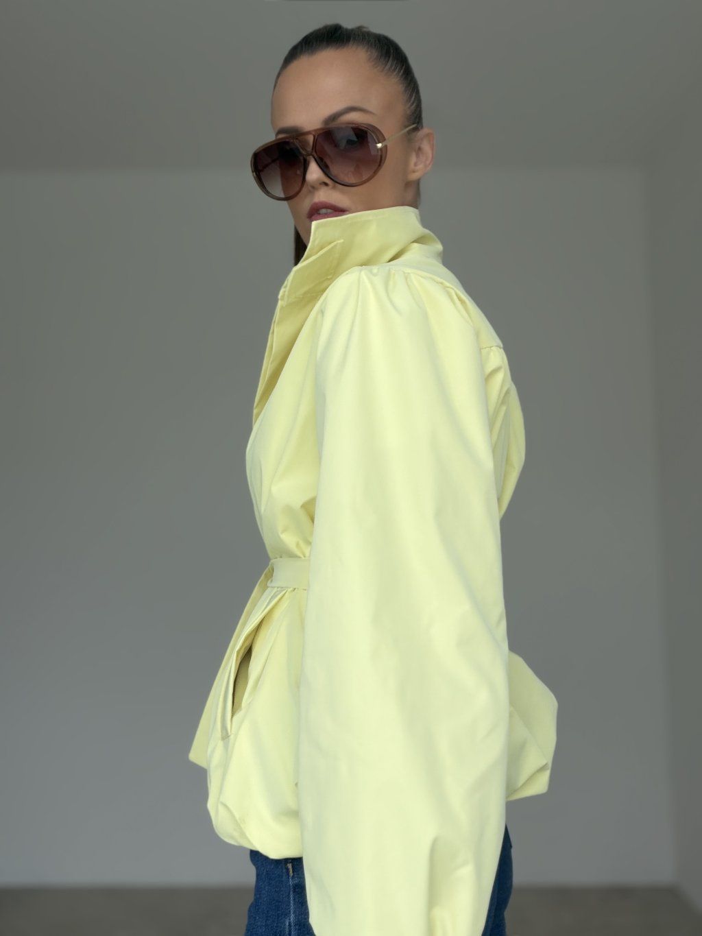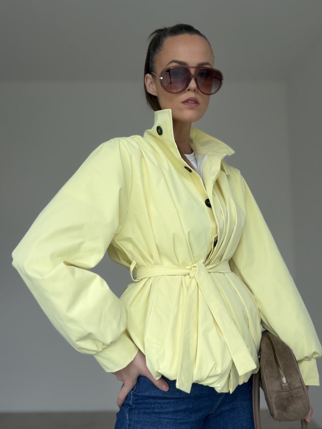 Ten model to nowoczesne spojrzenie na ponadczasową elegancję, z wyrazistą sylwetką i kobiecymi detalami. Luźniejszy krój, podkreślona talia oraz lekko bufiaste rękawy tworzą efektowny, a jednocześnie bardzo wygodny look, który sprawdzi się zarówno na co dzień, jak i w bardziej eleganckich stylizacjach. Wyższy kołnierz i zapięcie na guziki dodają całości charakteru, a wiązanie w talii pięknie podkreśla figurę i pozwala dopasować efekt końcowy do własnych upodobań. To idealna propozycja dla kobiet, które lubią modne fasony z charakterem i chcą wyglądać stylowo, nowocześnie i z klasą.