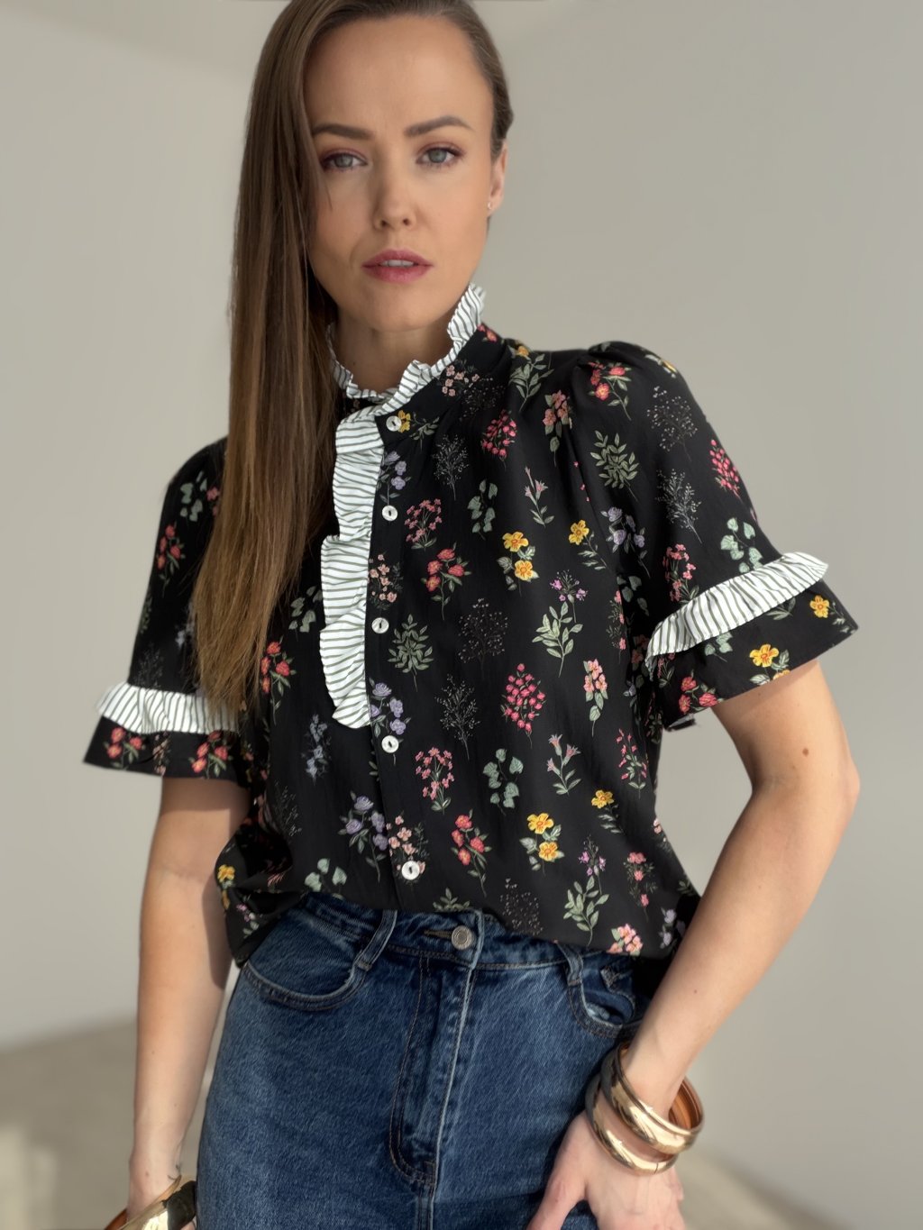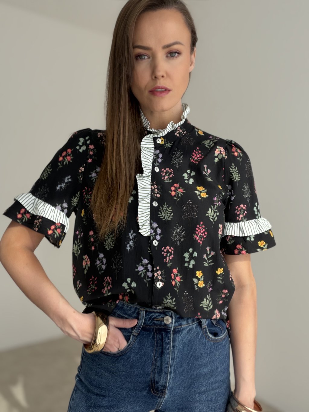Romantyczna koszula w kwiatowy wzór z efektownymi falbanowymi detalami prezentuje się kobieco, elegancko i oryginalnie. To idealny wybór na co dzień i do stylowych zestawień.