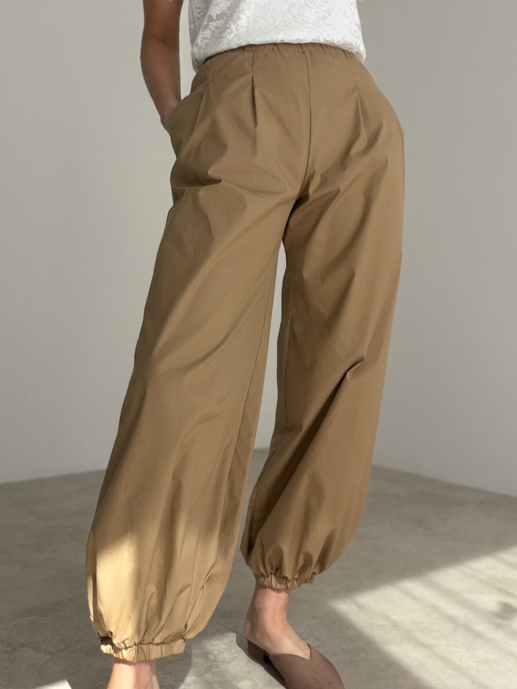Swobodne spodnie z wysokim stanem, kieszeniami i elastycznym wykończeniem nogawek. Wygodny i stylowy model, który sprawdzi się na co dzień.