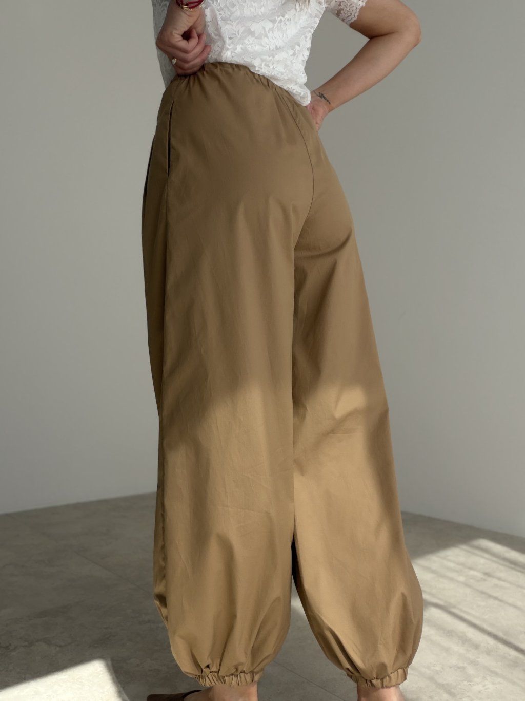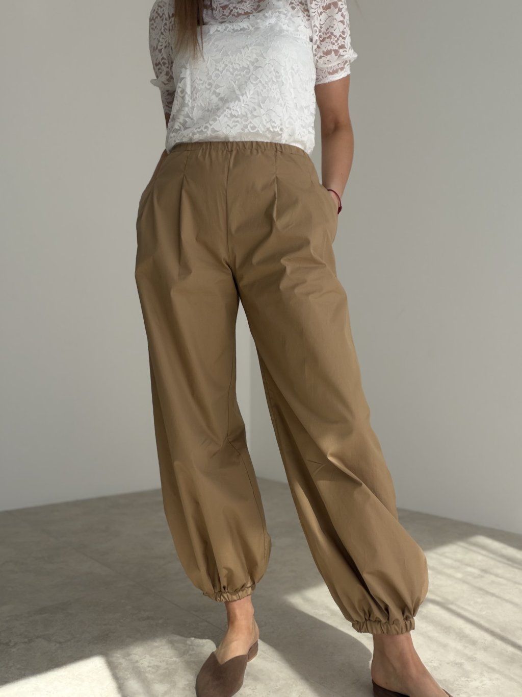 Spodnie o swobodnym kroju łączą w sobie wygodę, lekkość i niewymuszoną elegancję. Wysoki stan pięknie podkreśla sylwetkę, a delikatnie rozszerzona forma nadaje całości nowoczesny i stylowy charakter. Praktyczne kieszenie oraz elastyczne wykończenie nogawek dodają im oryginalnego vzhľadu, dzięki czemu ten model wyróżnia się w każdej stylizacji.
