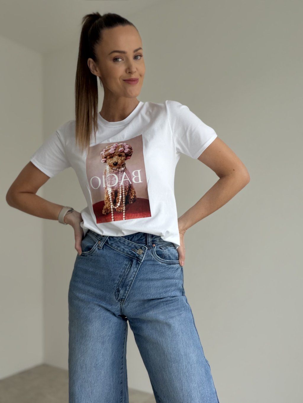 Bawełniany T-shirt z oryginalnym nadrukiem to stylowy model, który nadaje każdej stylizacji lekkości, nowoczesności i charakteru. Klasyczny fason z krótkim rękawem oraz przyjemny w noszeniu materiał zapewniają komfort przez cały dzień, a wyrazisty motyw z przodu sprawia, że koszulka staje się mocnym elementem całego looku. Świetnie komponuje się z jeansami, spodniami i spódnicami, dlatego doskonale sprawdzi się zarówno w codziennych, jak i miejskich stylizacjach. To idealna propozycja dla kobiet, które lubią wygodne ubrania z pomysłem i chcą dodać swojej garderobie świeży, modny akcent.