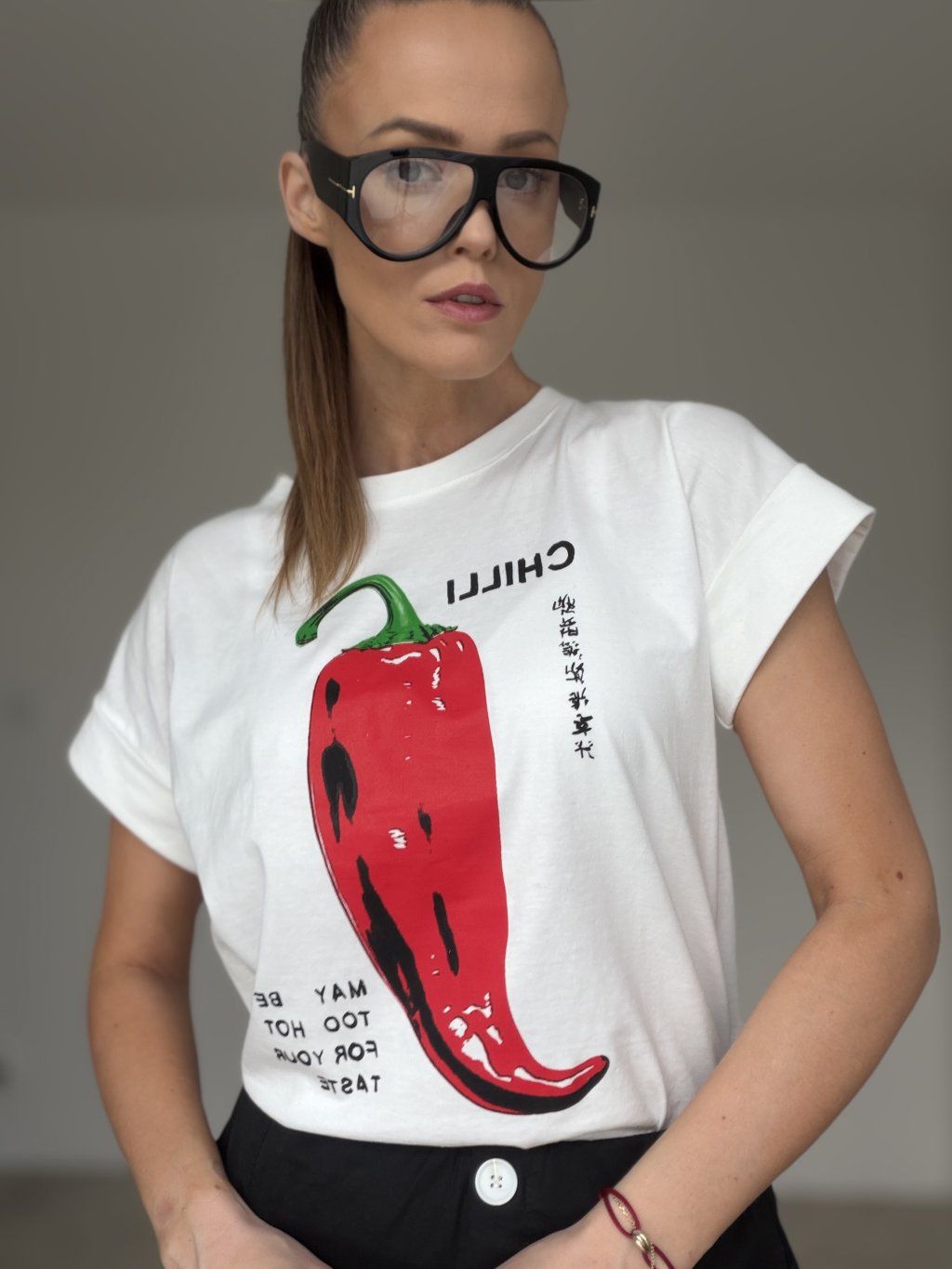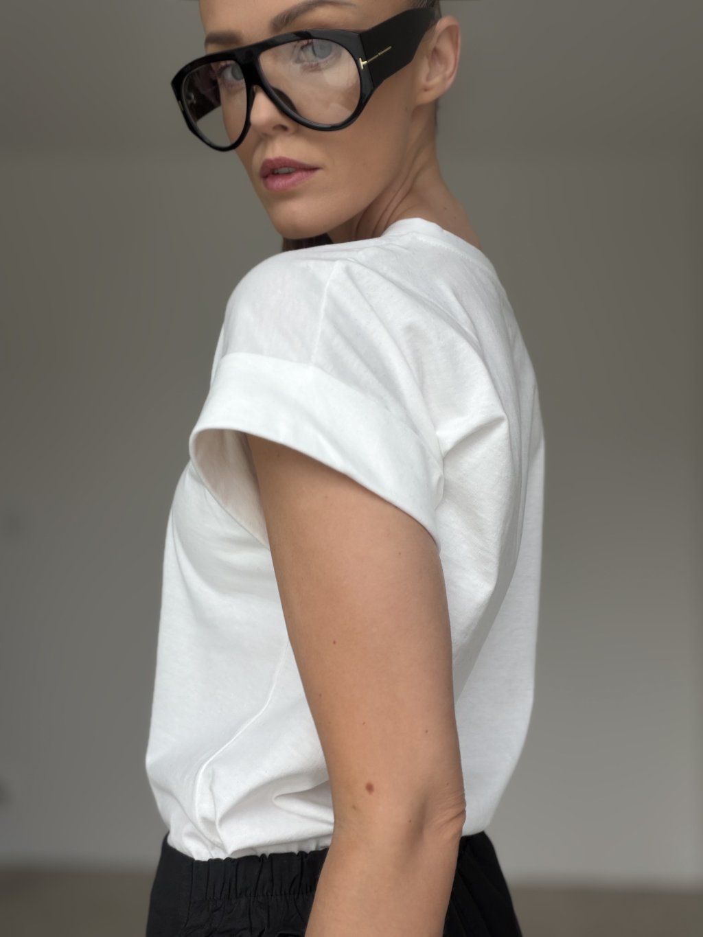 T-shirt doskonale komponuje się z jeansami, spodniami z wysokim stanem, szortami oraz spódnicą, dzięki czemu z łatwością dopasujesz go do miejskich i casualowych stylizacji. To model, który wygląda nonszalancko, a jednocześnie modnie i pewnie. Dzięki swojemu krojowi i wykonaniu sprawdzi się idealnie na co dzień, w podróży oraz wtedy, gdy chcesz wyglądać dobrze bez większego wysiłku.
