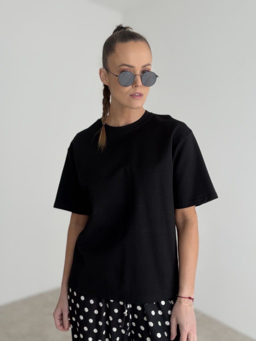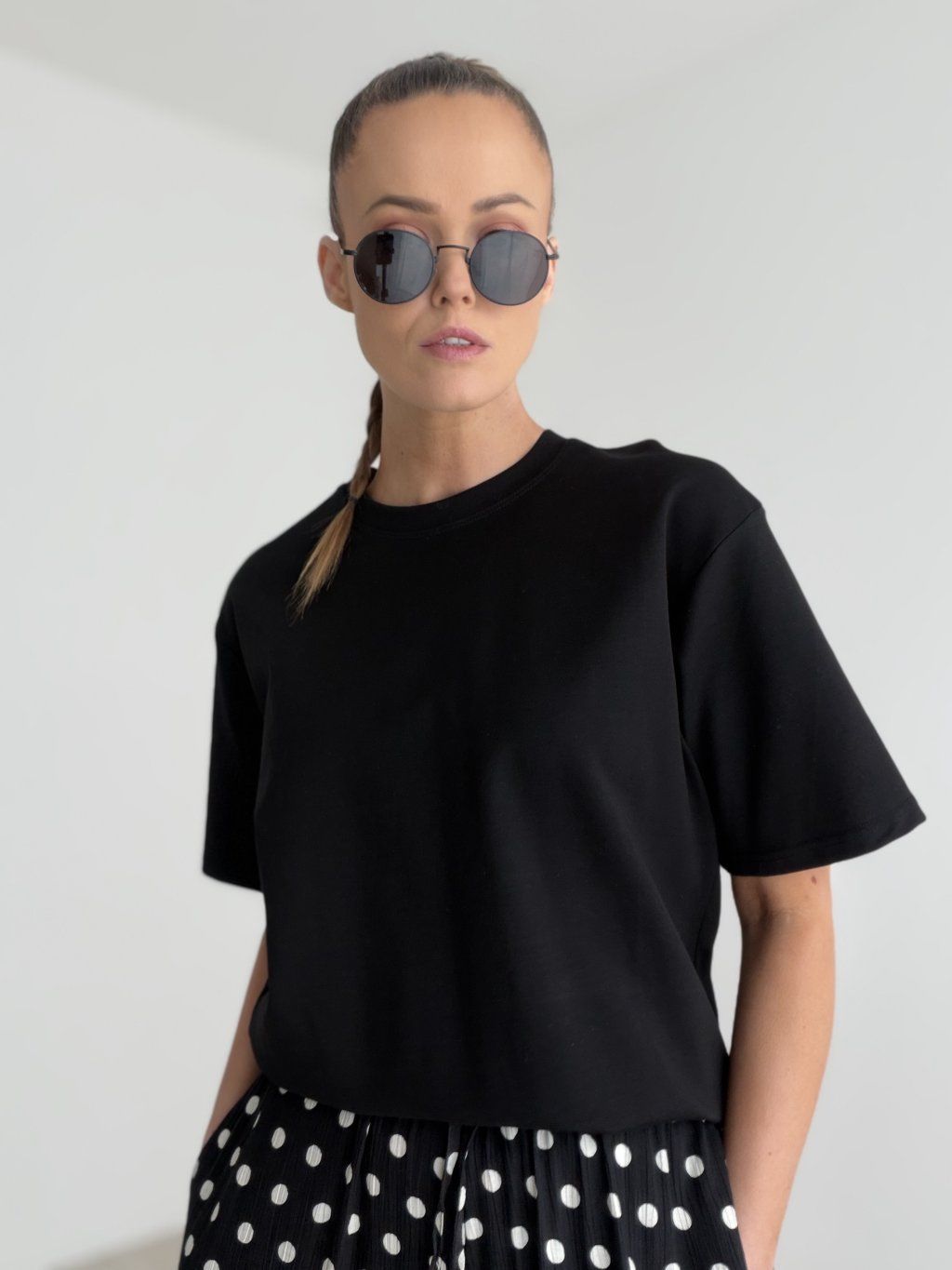 Bawełniany t-shirt o czystym, ponadczasowym fasonie, który świetnie sprawdza się na co dzień. Ma luźniejszy krój z delikatnie obniżoną linią ramion i wygodnymi rękawami, dzięki czemu wygląda nowocześnie i zapewnia komfort noszenia. Klasyczny, okrągły dekolt dobrze układa się przy szyi, a t-shirt łatwo zestawisz z jeansami, spodniami lub spódnicą. Idealny na co dzień, w podróży oraz do warstwowych stylizacji pod marynarkę lub kurtkę, gdy chcesz wyglądać schludnie bez wysiłku.