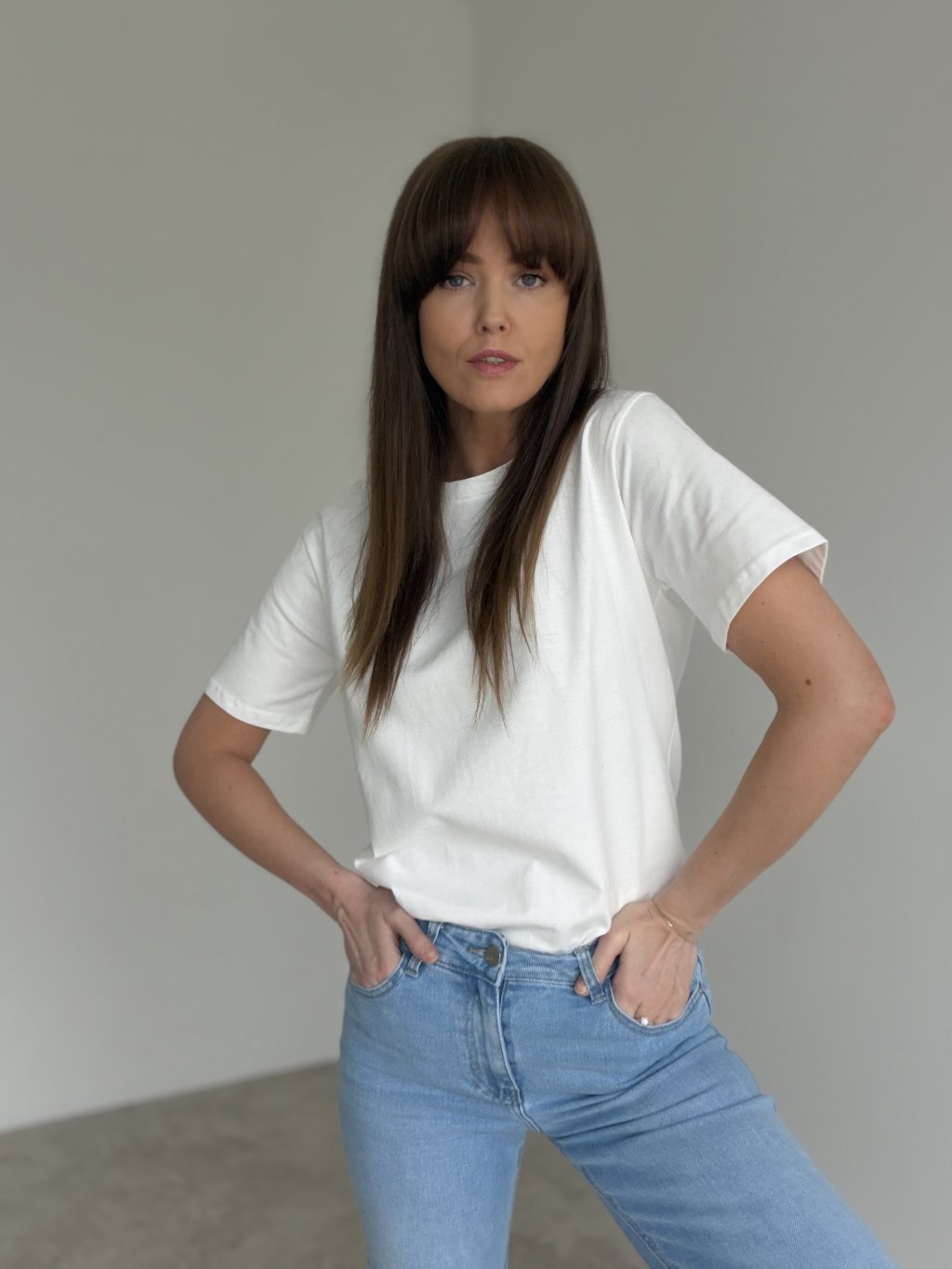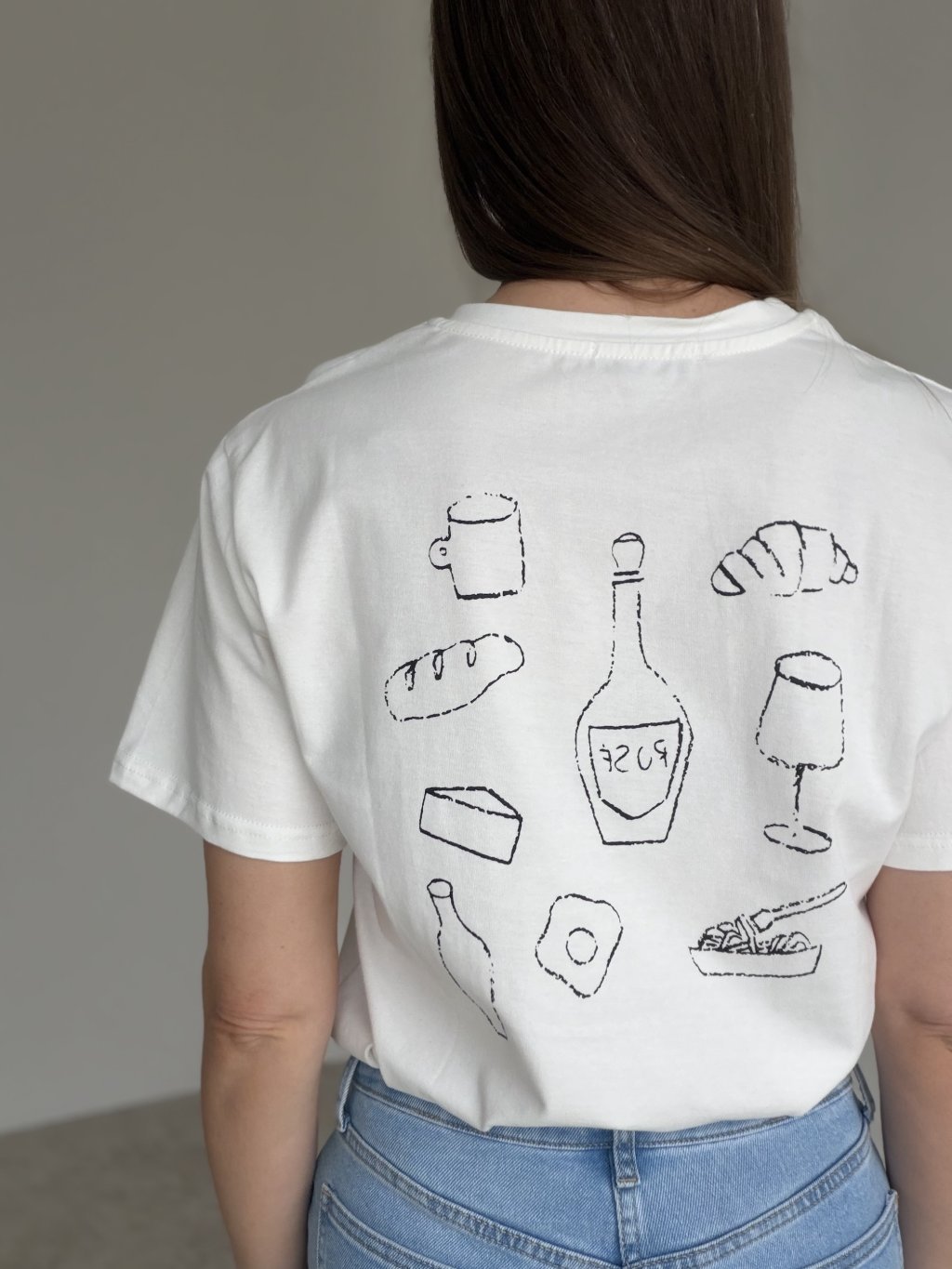 Bawełniany T-shirt o prostym, ponadczasowym kroju, który świetnie sprawdzi się na co dzień. Przód pozostaje minimalistyczny, dzięki czemu łatwo zestawisz go z jeansami, spodniami czy spódnicą. Z tyłu znajduje się delikatna ilustracja w rysunkowym stylu, która dodaje charakteru, ale nadal wygląda subtelnie i uniwersalnie. Przyjemny materiał oraz wygodny fason zapewniają komfort przez cały dzień. To idealny wybór zarówno do noszenia solo, jak i do warstwowych stylizacji pod marynarkę, kurtkę lub sweter.