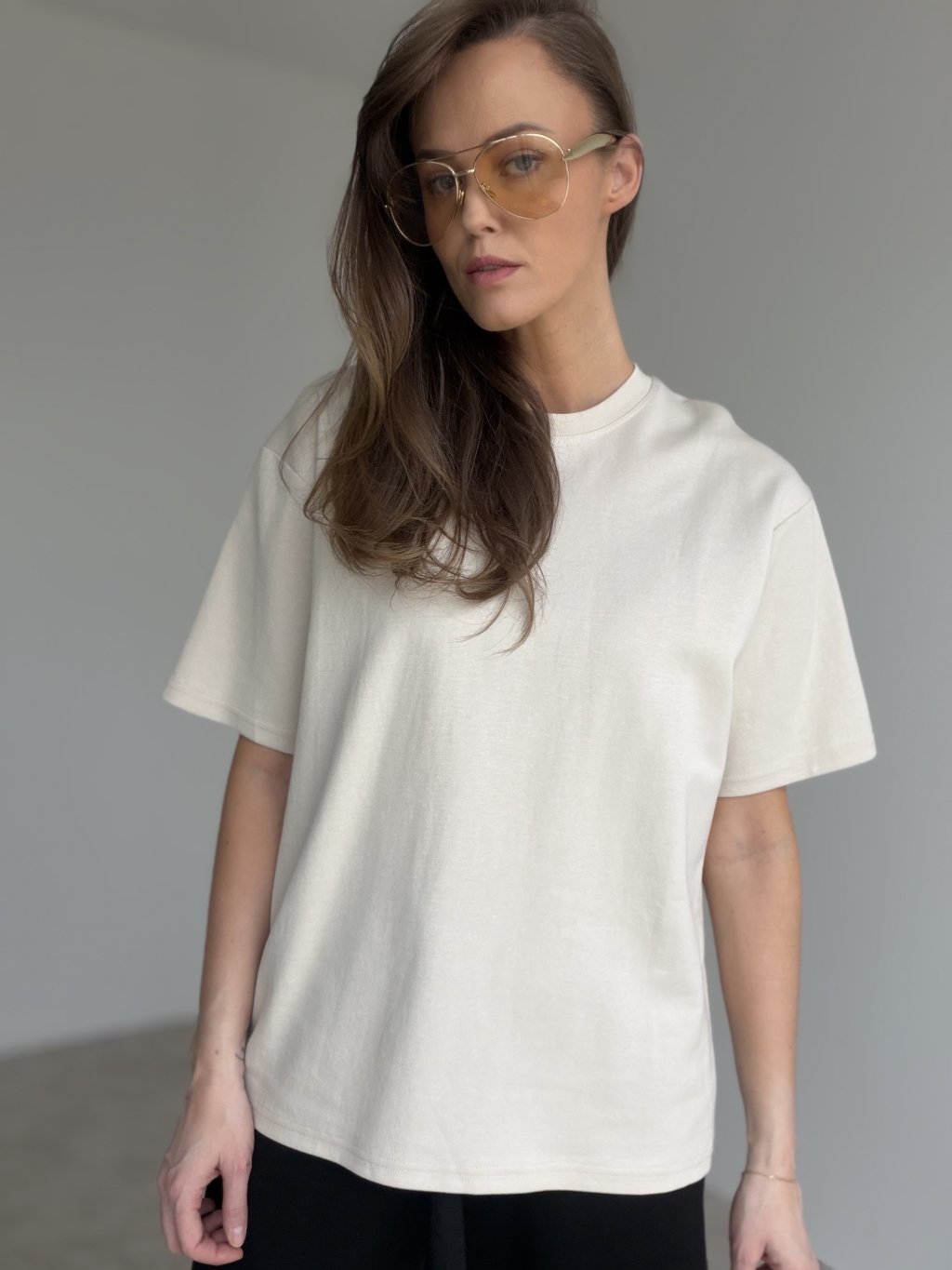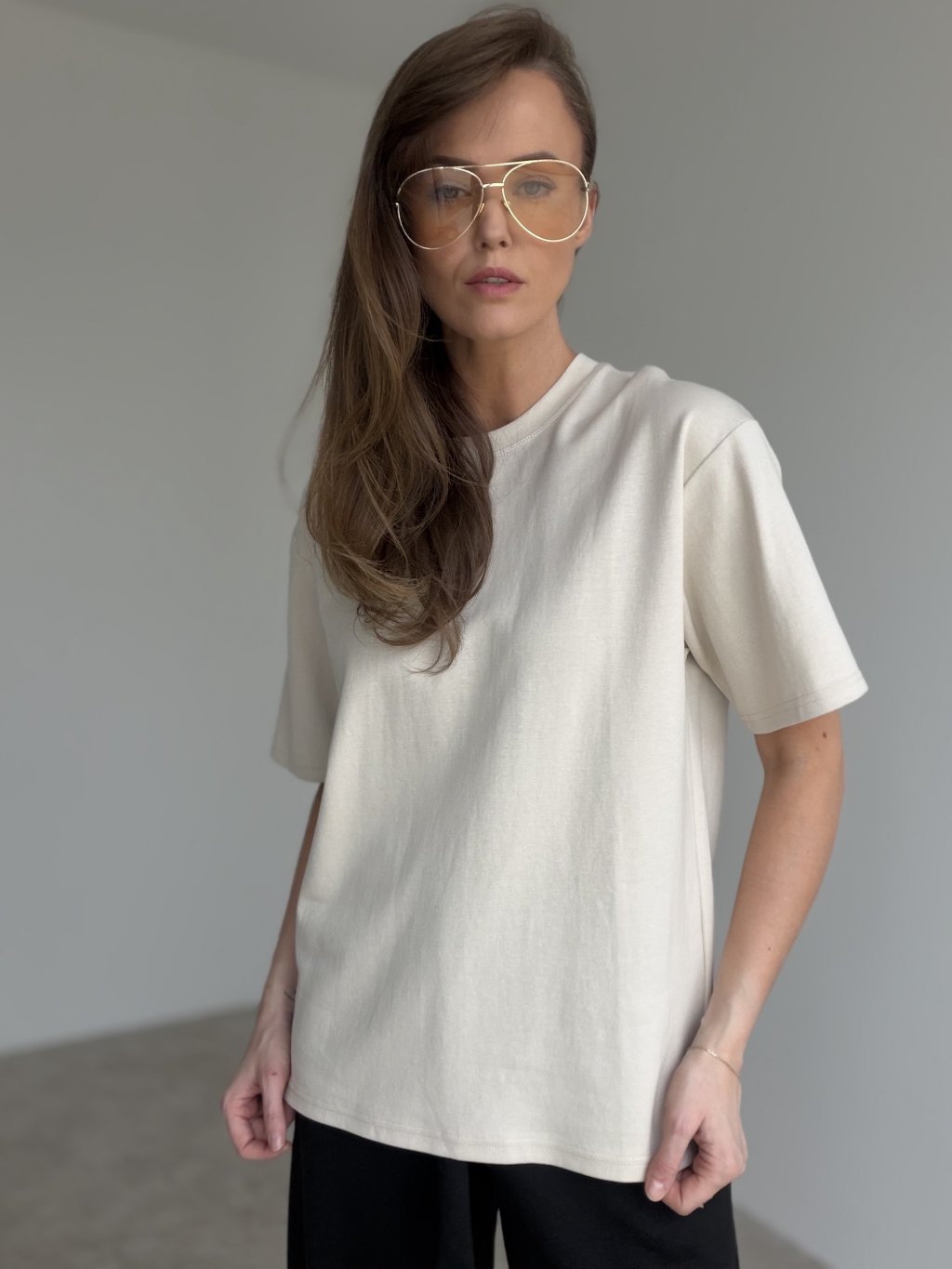 Bawełniany t-shirt o czystym, ponadczasowym fasonie, który świetnie sprawdza się na co dzień. Ma luźniejszy krój z delikatnie obniżoną linią ramion i wygodnymi rękawami, dzięki czemu wygląda nowocześnie i zapewnia komfort noszenia. Klasyczny, okrągły dekolt dobrze układa się przy szyi, a t-shirt łatwo zestawisz z jeansami, spodniami lub spódnicą. Idealny na co dzień, w podróży oraz do warstwowych stylizacji pod marynarkę lub kurtkę, gdy chcesz wyglądać schludnie bez wysiłku.