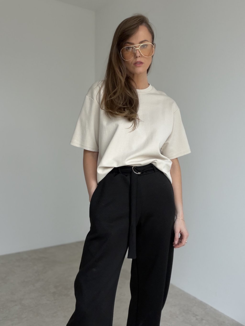 Wsuń t-shirt do spodni lub spódnicy albo zrób prosty „front tuck”, aby podkreślić talię.