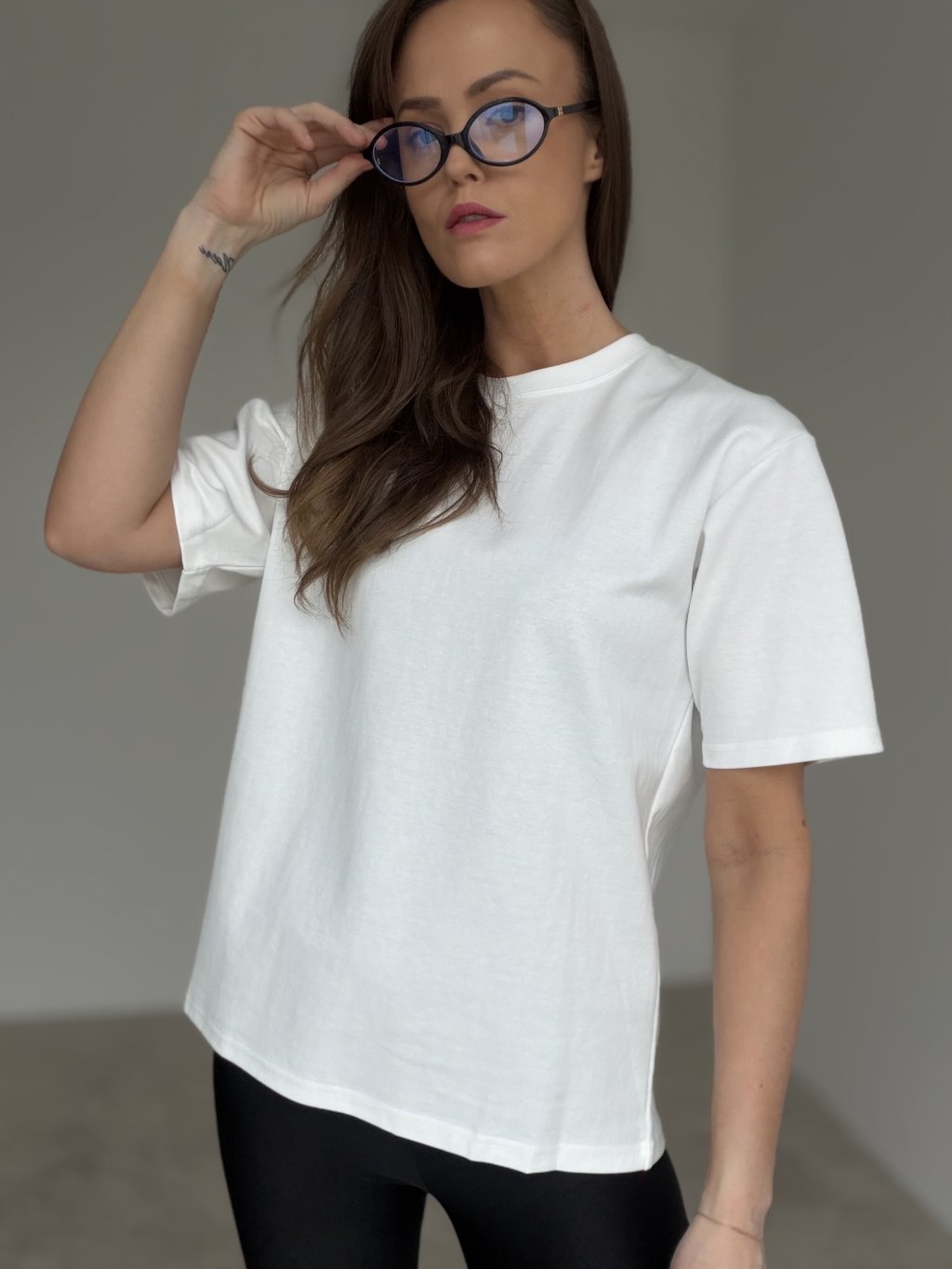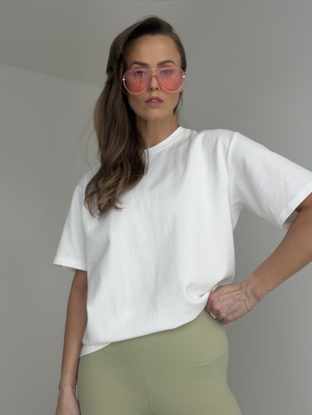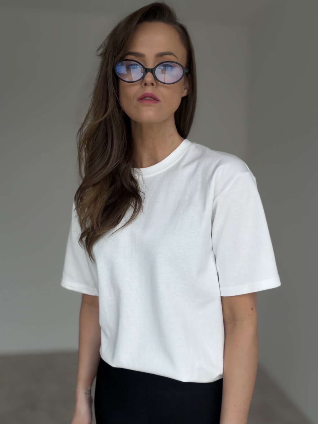 Wsuń t-shirt do spodni lub spódnicy albo zrób prosty „front tuck”, aby podkreślić talię.