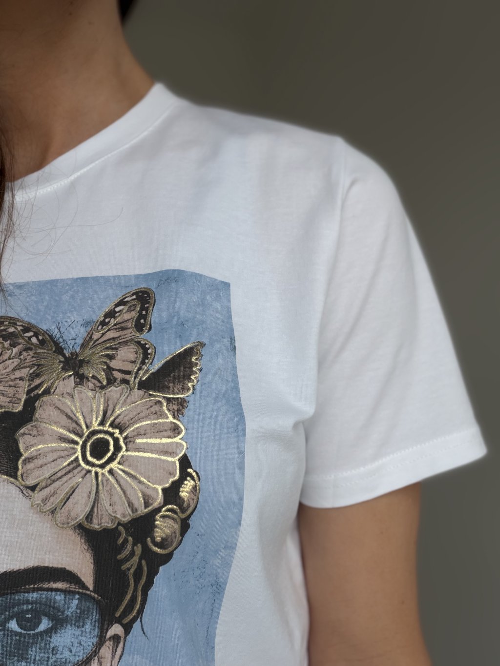 Bawełniany T-shirt z wyrazistym, artystycznym nadrukiem z przodu to świetny sposób na szybkie podkręcenie stylizacji. Nadruk uzupełnia złoty detal, który dodaje całości eleganckiego, biżuteryjnego efektu. Krój jest wygodny i łatwy do zestawiania – pasuje zarówno do jeansów, spódnicy, jak i bardziej casualowych elementów, a mimo to wygląda schludnie.