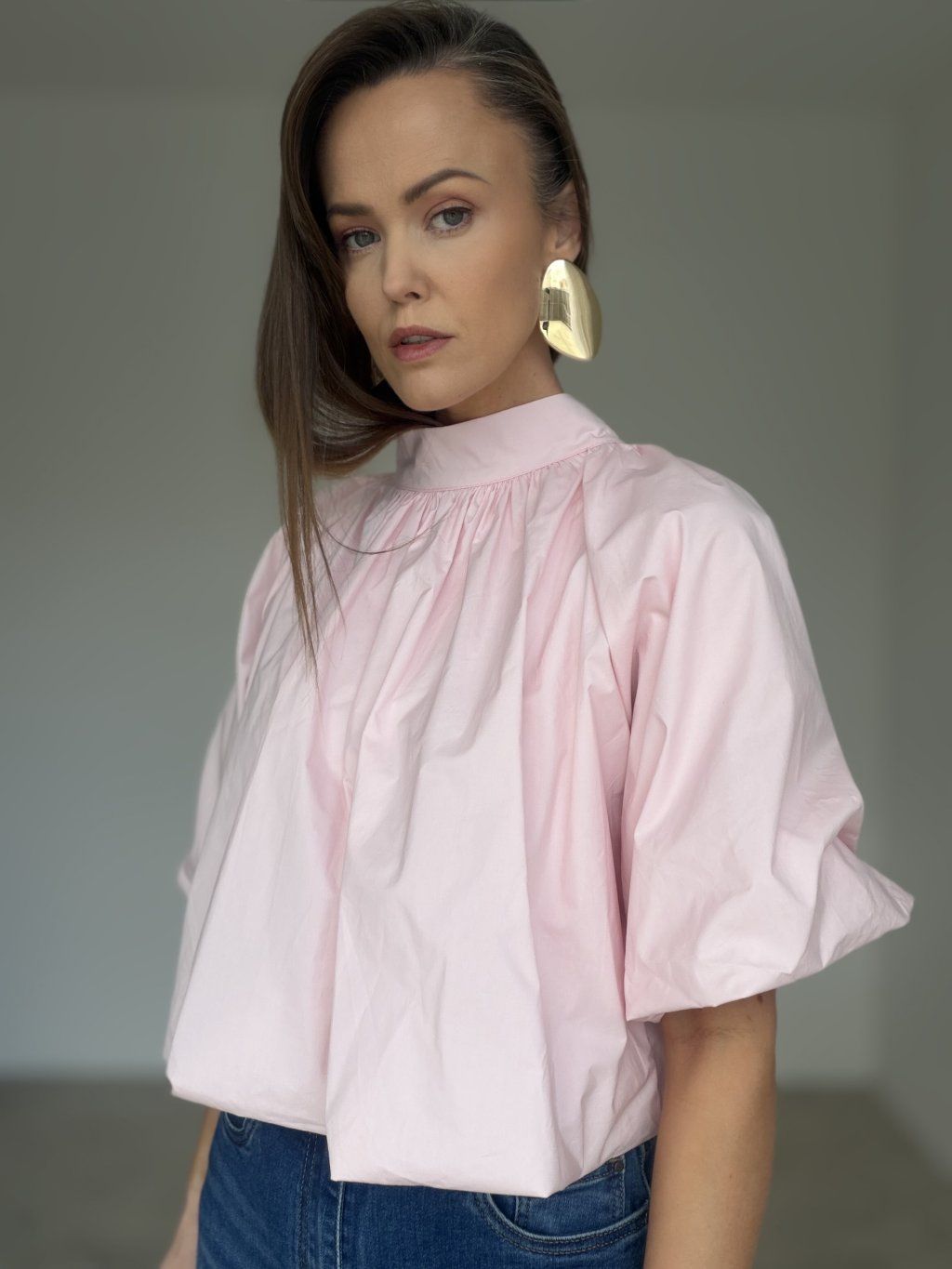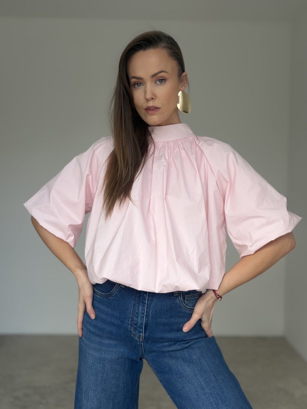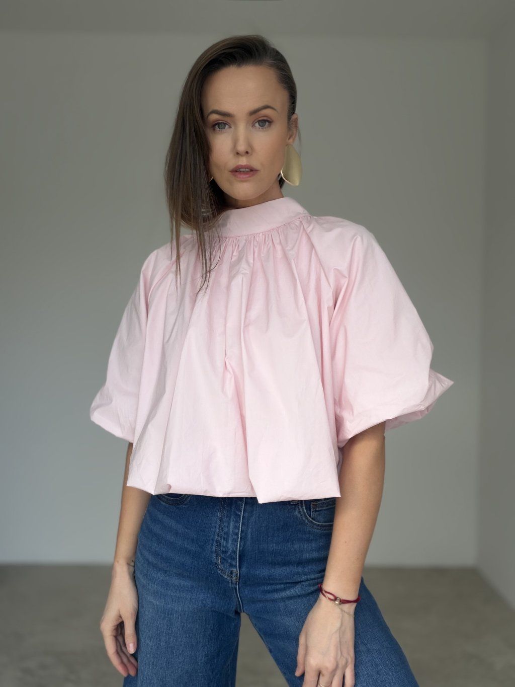 Zwiewny bawełniany top o luźniejszym kroju, z efektownym marszczeniem i bardziej wyrazistymi rękawami. Elegancki, wygodny i łatwy do stylizacji zarówno na co dzień, jak i na wyjątkowe okazje.