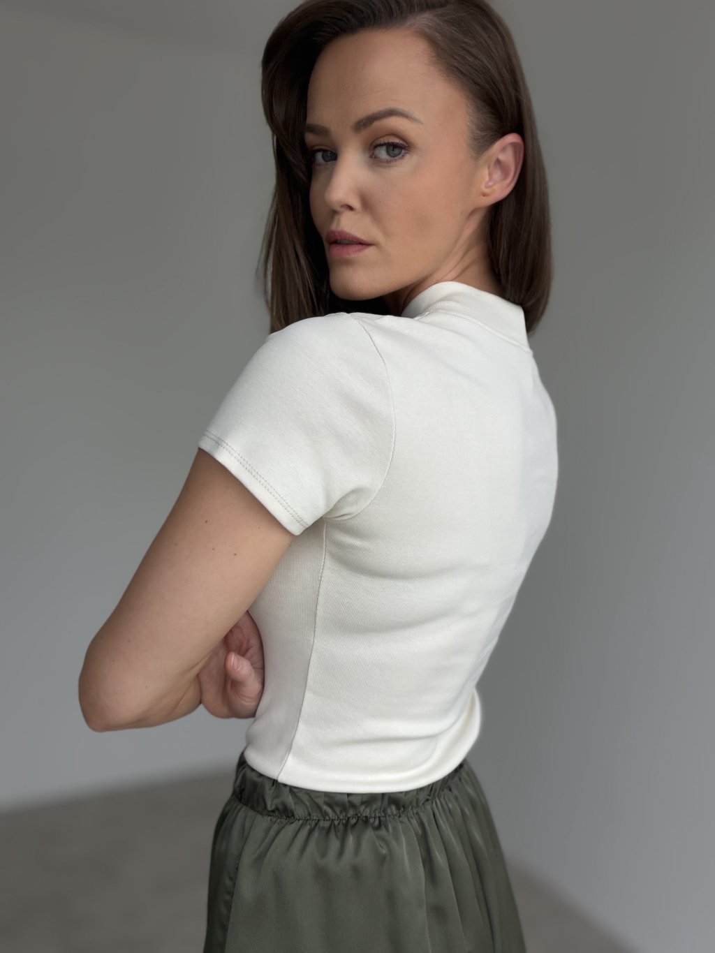 Ten bawełniany top to ponadczasowa baza garderoby, która wyróżnia się czystym krojem i dopracowanym wykończeniem. Dopasowana forma podkreśla sylwetkę, a jednocześnie zapewnia wygodę na cały dzień. Krótkie rękawy oraz nieco wyższy, okrągły dekolt nadają całości schludny, minimalistyczny charakter, dzięki czemu top łatwo zestawić zarówno ze stylizacjami codziennymi, jak i bardziej eleganckimi. Materiał jest przyjemny w dotyku i świetnie sprawdza się do noszenia warstwowo pod marynarkę, koszulę czy kurtkę, ale równie dobrze wygląda samodzielnie.