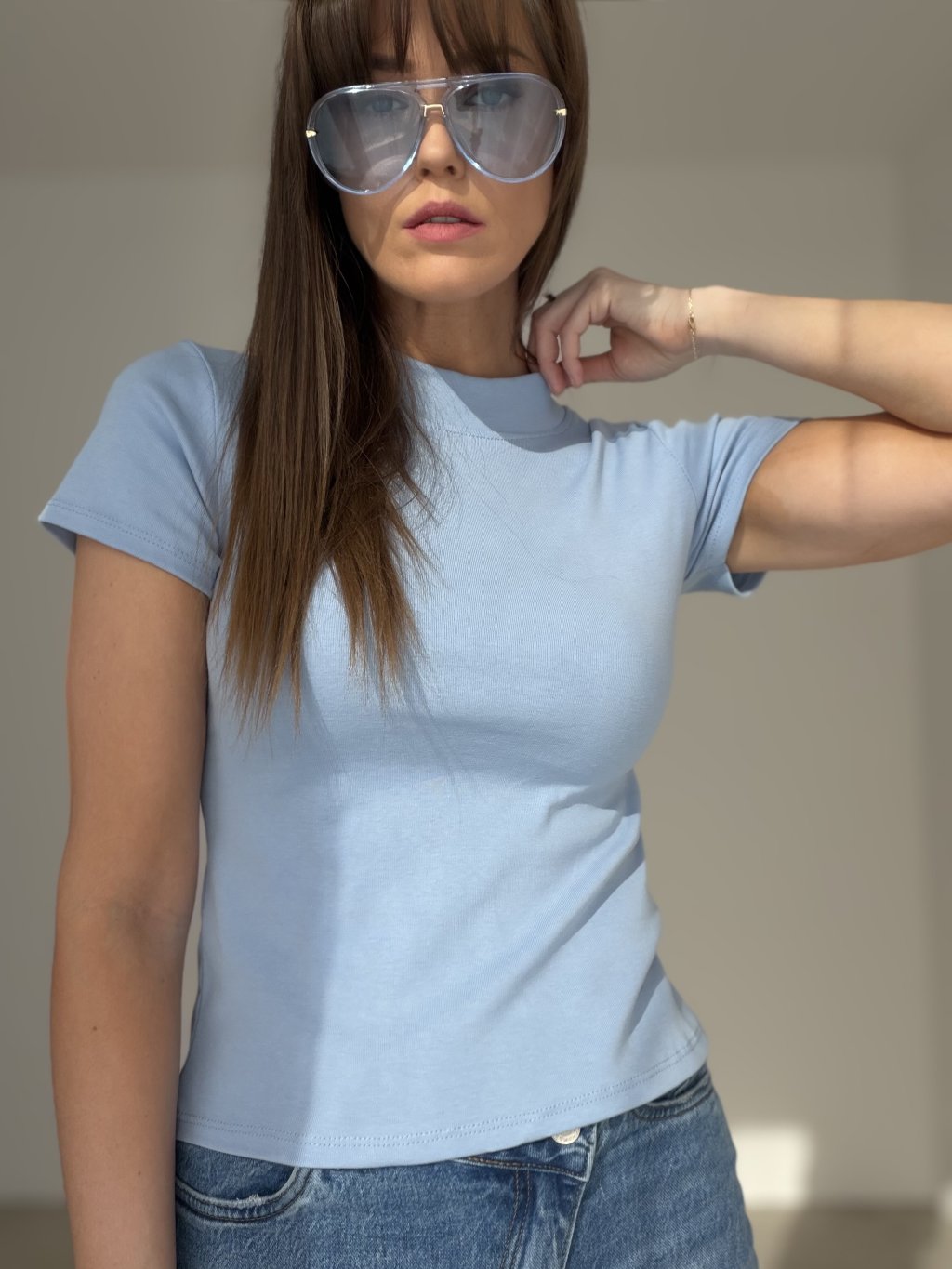 Ten bawełniany top to ponadczasowa baza garderoby, która wyróżnia się czystym krojem i dopracowanym wykończeniem. Dopasowana forma podkreśla sylwetkę, a jednocześnie zapewnia wygodę na cały dzień. Krótkie rękawy oraz nieco wyższy, okrągły dekolt nadają całości schludny, minimalistyczny charakter, dzięki czemu top łatwo zestawić zarówno ze stylizacjami codziennymi, jak i bardziej eleganckimi. Materiał jest przyjemny w dotyku i świetnie sprawdza się do noszenia warstwowo pod marynarkę, koszulę czy kurtkę, ale równie dobrze wygląda samodzielnie.
