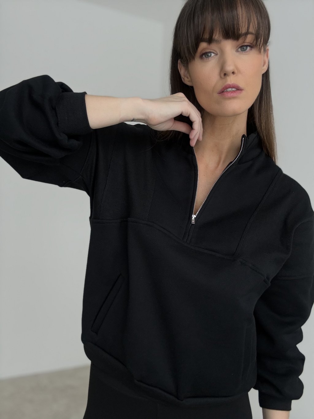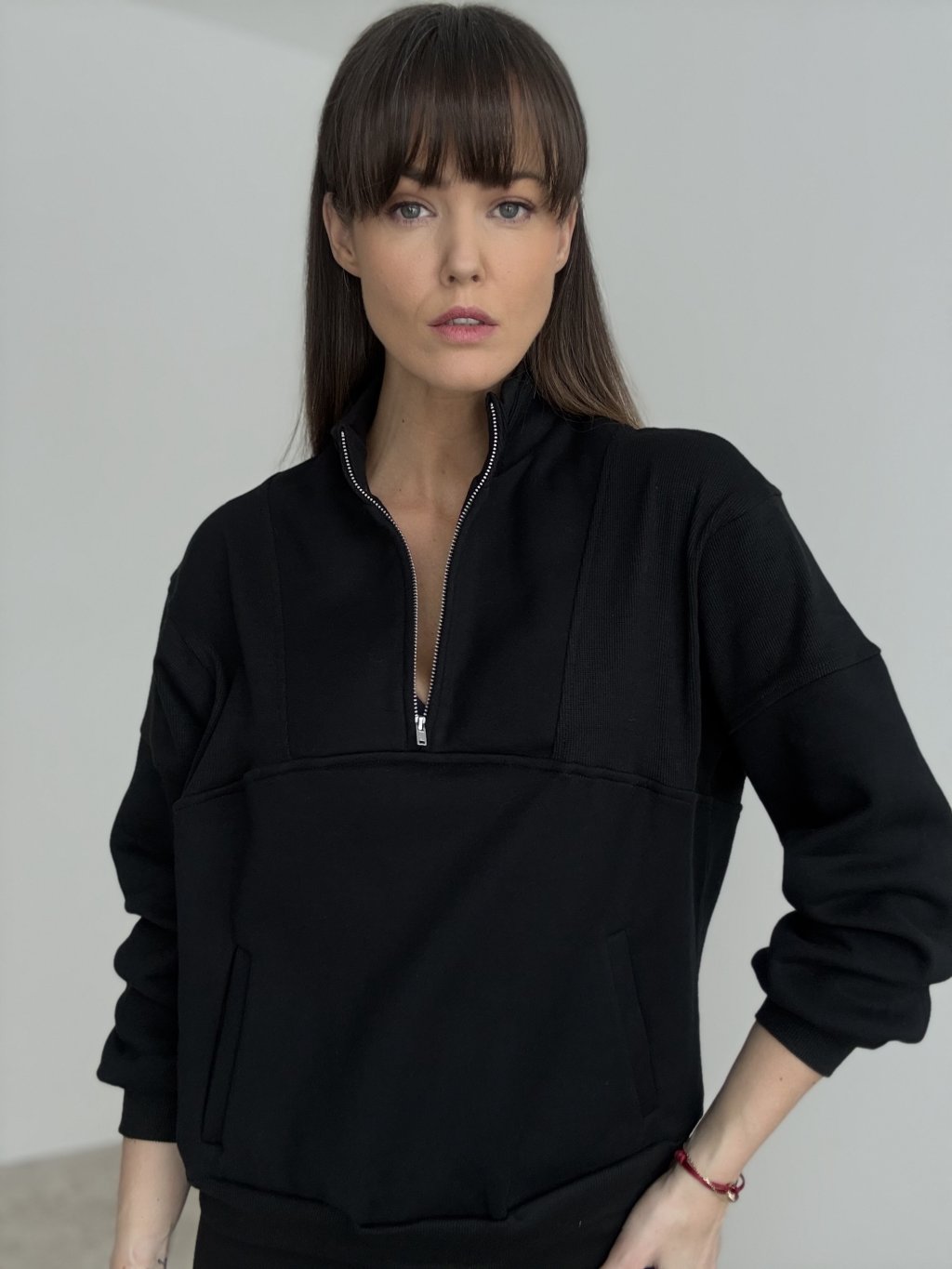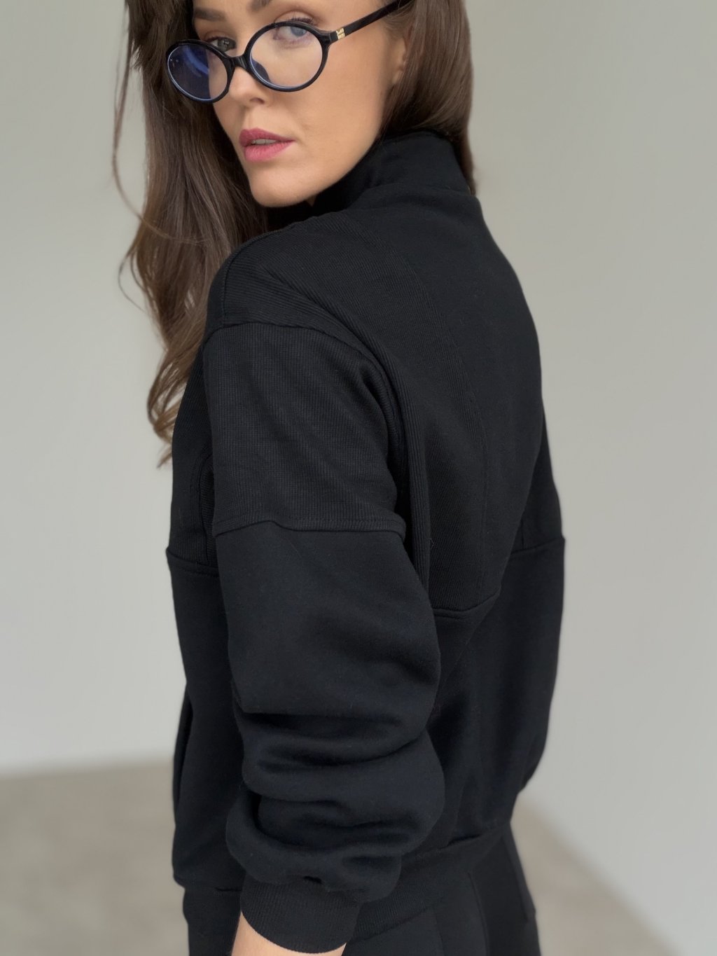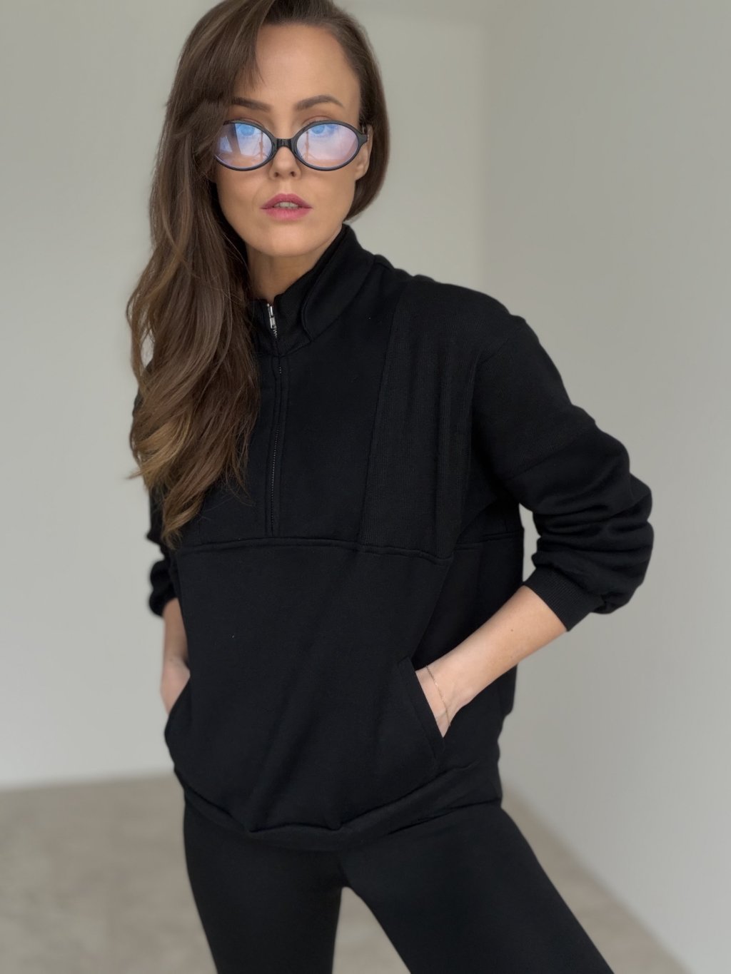 Ten model to połączenie wygody i minimalistycznego, dopracowanego wyglądu. Ma stójkę oraz krótki zamek, dzięki czemu łatwo dopasujesz dekolt i poziom ciepła. Fason jest luźniejszy, z delikatnie opuszczoną linią ramion, więc świetnie układa się na sylwetce i nie krępuje ruchów. Materiał jest bardziej strukturalny i dobrze trzyma formę, a jednocześnie pozostaje przyjemny w noszeniu. Praktycznym detalem są boczne kieszenie oraz elastyczne wykończenie rękawów i dołu, które ładnie domyka całość. Pasuje zarówno do jeansów i legginsów, jak i do bardziej eleganckich spodni.