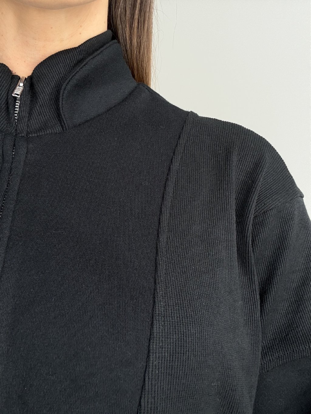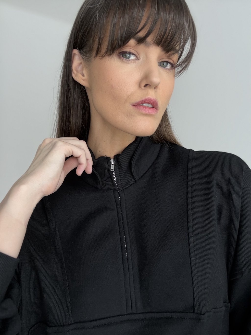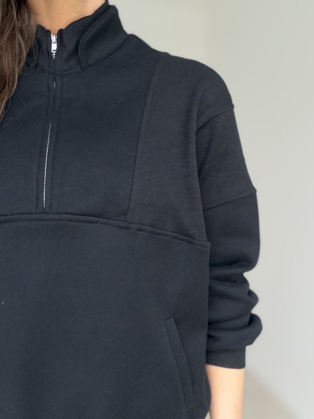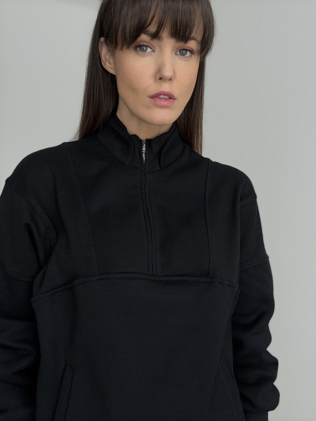Ten model to połączenie wygody i minimalistycznego, dopracowanego wyglądu. Ma stójkę oraz krótki zamek, dzięki czemu łatwo dopasujesz dekolt i poziom ciepła. Fason jest luźniejszy, z delikatnie opuszczoną linią ramion, więc świetnie układa się na sylwetce i nie krępuje ruchów. Materiał jest bardziej strukturalny i dobrze trzyma formę, a jednocześnie pozostaje przyjemny w noszeniu. Praktycznym detalem są boczne kieszenie oraz elastyczne wykończenie rękawów i dołu, które ładnie domyka całość. Pasuje zarówno do jeansów i legginsów, jak i do bardziej eleganckich spodni.