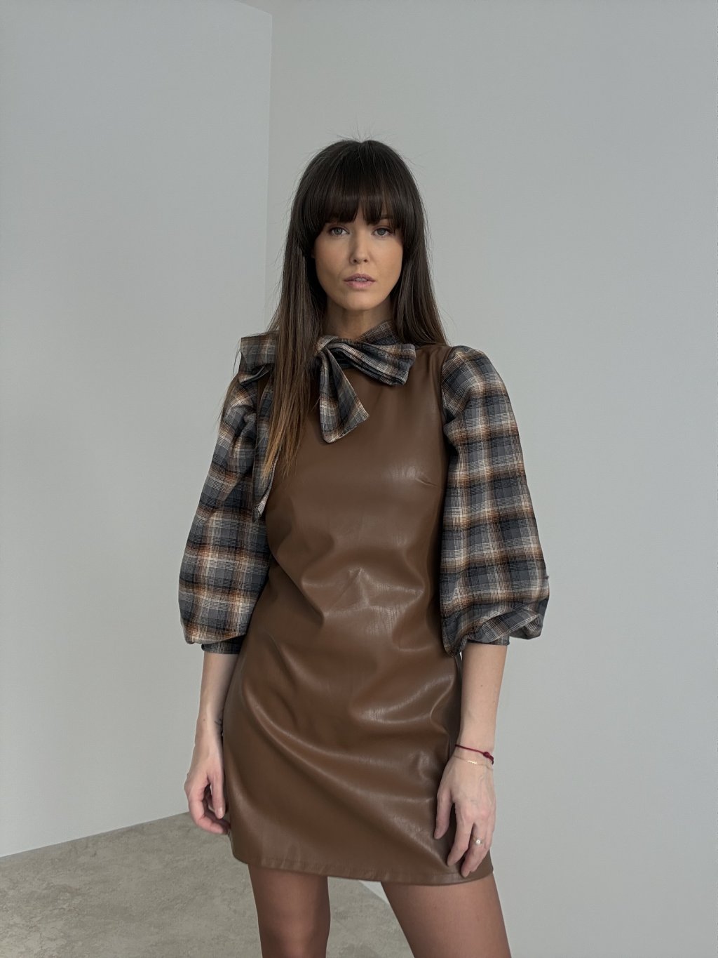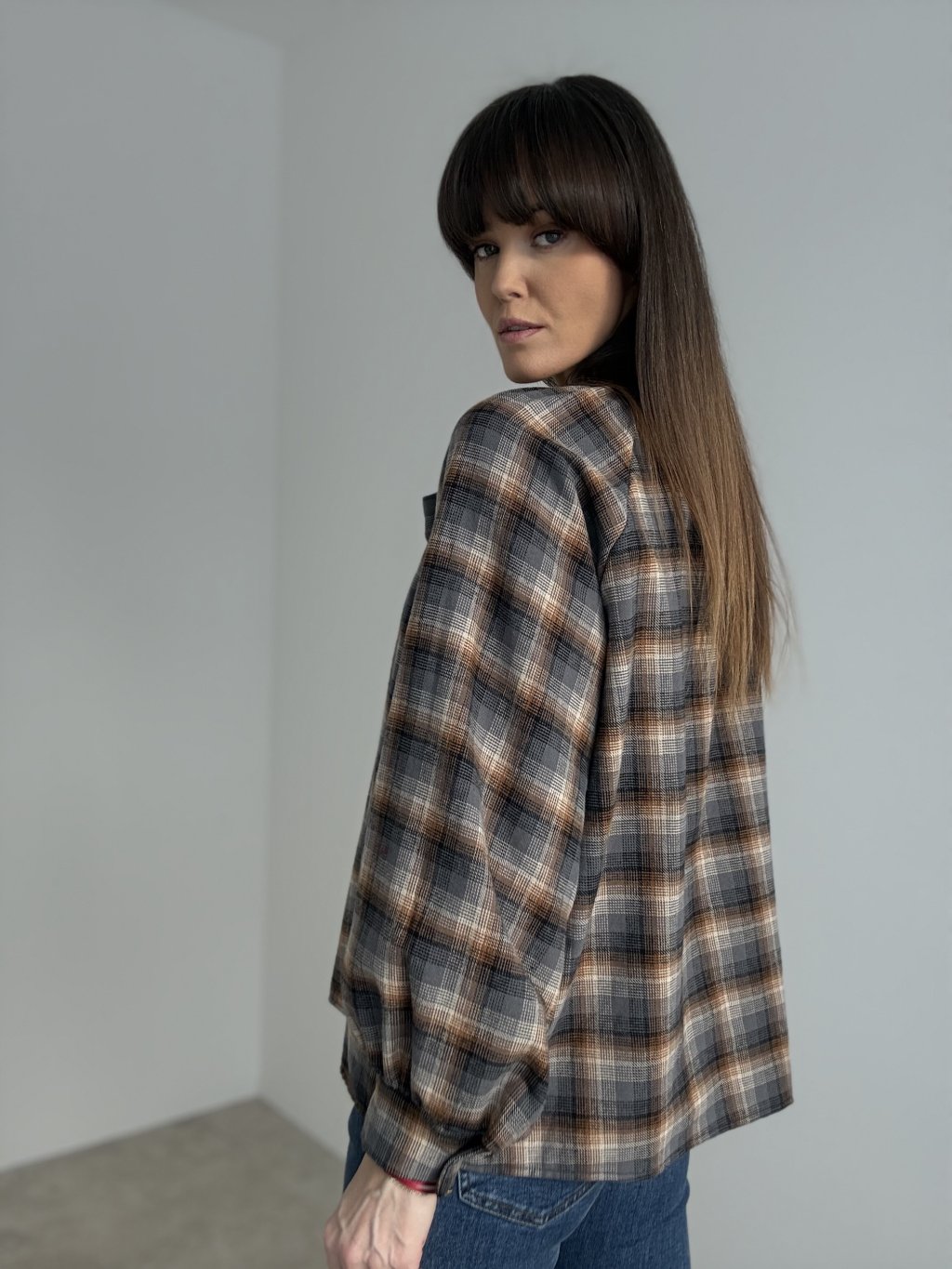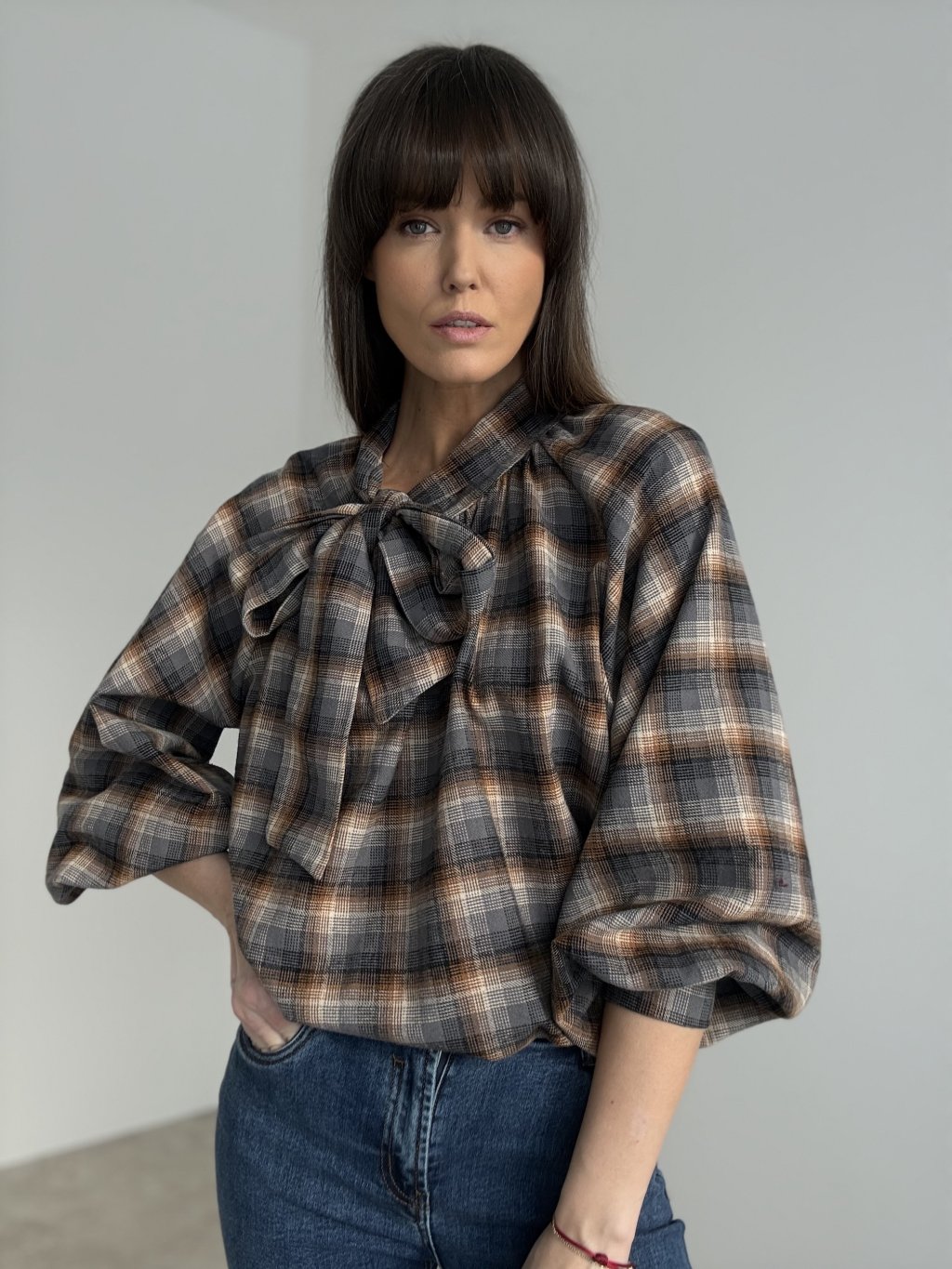 Oversize bluzka w delikatną kratę, nadająca stylizacji swobodny, a jednocześnie kobiecy wygląd. Głównym akcentem jest wiązanie przy szyi, które można zawiązać w elegancką kokardę lub pozostawić luźno. Luźny fason zapewnia komfort noszenia i dobrze sprawdza się również w zestawach warstwowych. Rękawy mają delikatnie bufowany kształt i są zakończone mankietem z guzikiem. Bluzka jest idealna na co dzień oraz do pracy, doskonale komponuje się ze spódnicami i spodniami z wysokim stanem.