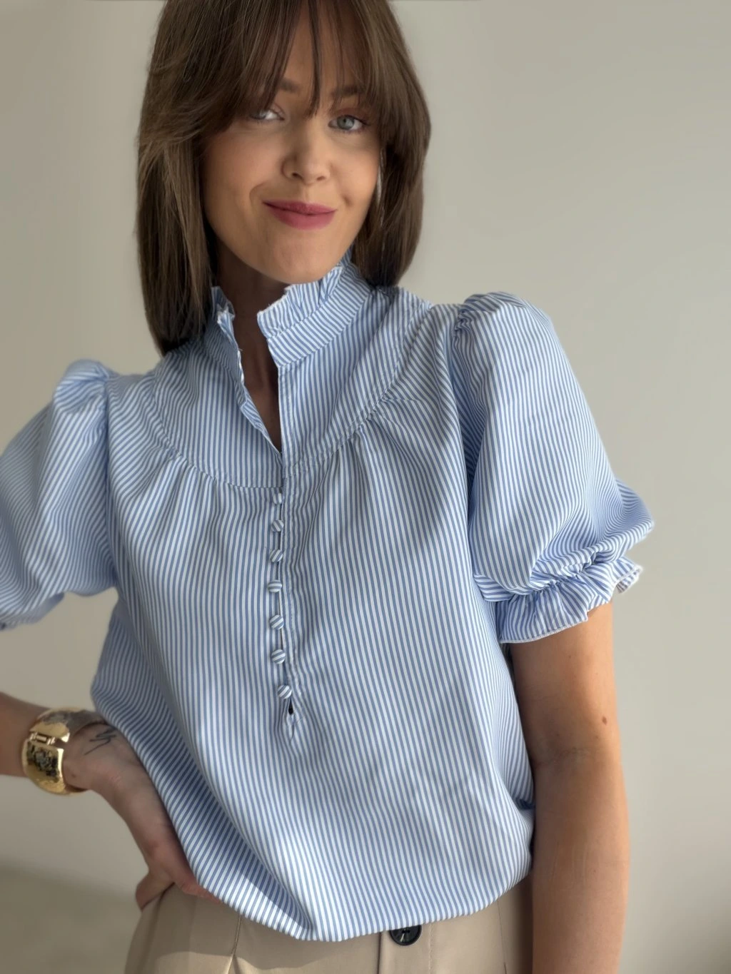 Elegancka bluzka o delikatnie romantycznym charakterze to wyjątkowy element garderoby, który prezentuje się kobieco, schludnie i bardzo stylowo. Przyciąga uwagę subtelnym wzorem w paski, delikatnymi detalami z przodu oraz bardziej wyrazistymi rękawami, które nadają całości uroku i modnego charakteru. Krój jest lekki i swobodny, dzięki czemu bluzka jest wygodna w noszeniu przez cały dzień, a jednocześnie zachowuje elegancki wygląd.