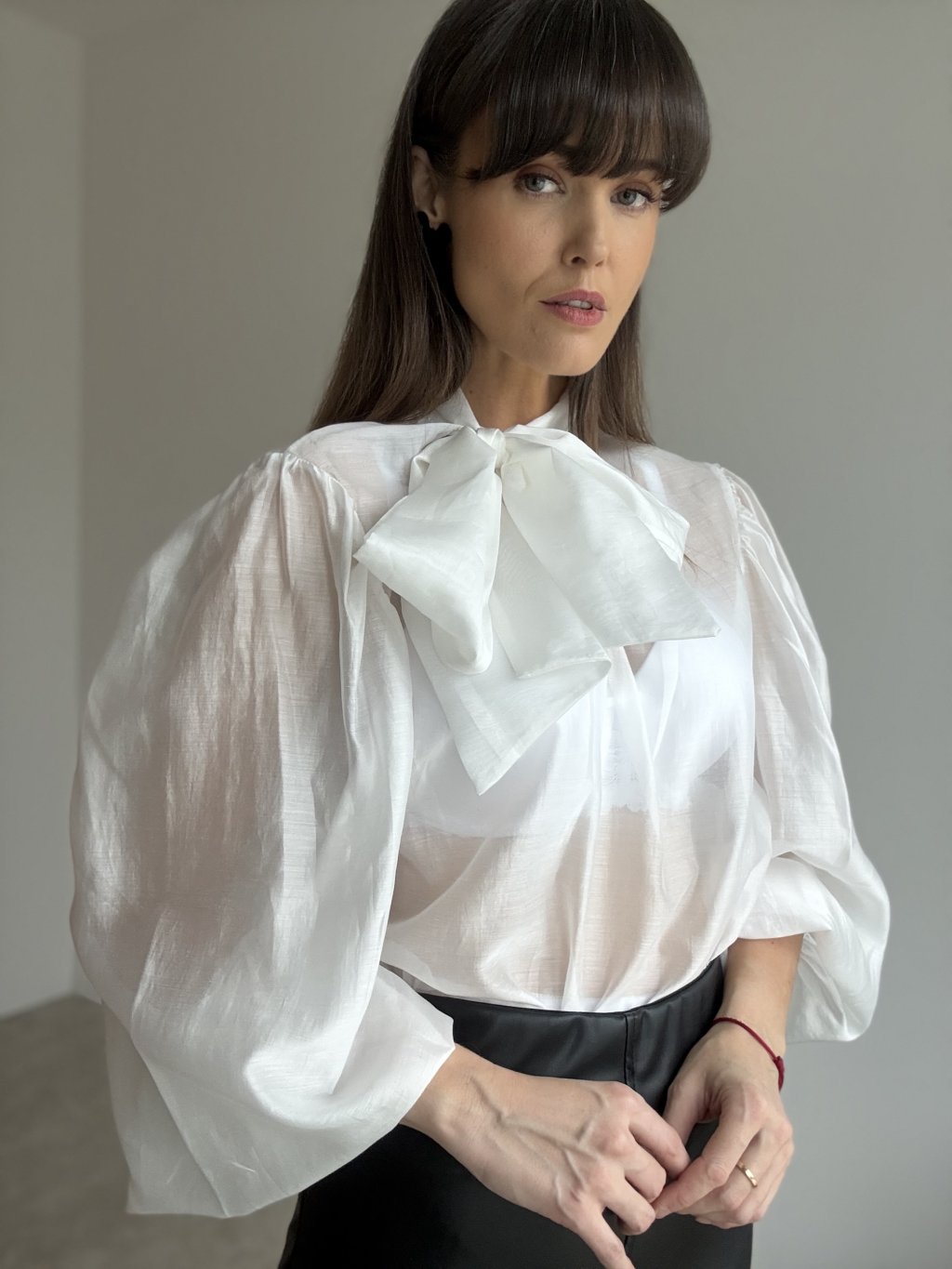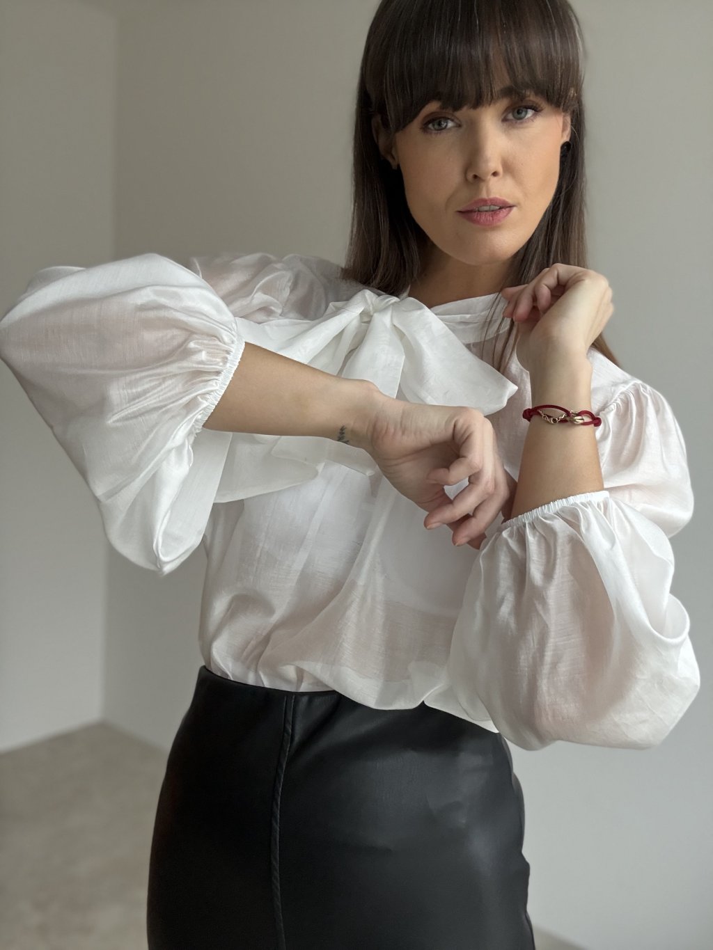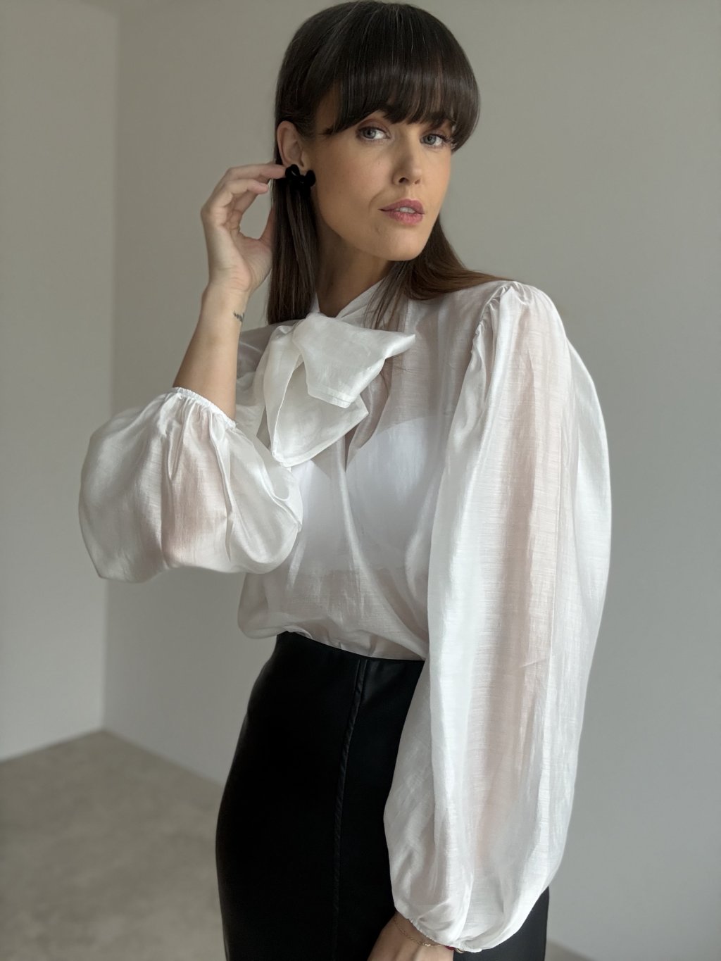 Zwiewna bluzka z lyocellu z elegancką kokardą przy szyi dodaje stylizacji subtelnie kobiecego charakteru. Luźniejszy, wygodny krój ładnie układa się na sylwetce i wygląda jednocześnie elegancko i nowocześnie. Obszerne rękawy typu balloon zakończone ściągaczem nadają całości modnej objętości i podkreślają linię ramion. Delikatny materiał jest przyjemny dla skóry, lekki i szlachetny, dlatego bluzka sprawdzi się w biurze, na spotkaniach, uroczystościach i wieczornych wyjściach. Doskonale komponuje się z ołówkową spódnicą oraz eleganckimi spodniami z wysokim stanem, a proste dodatki pozwalają wyeksponować kokardę i kobiecą linię góry.