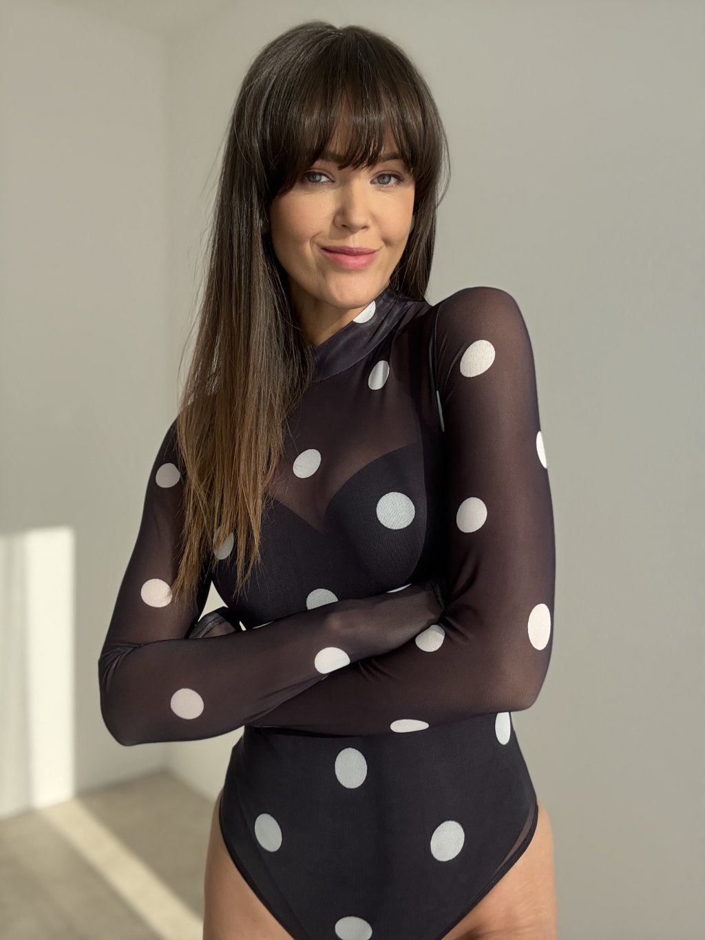 Body w kropki z lekkiego, półprzezroczystego materiału z długimi rękawami i wyższą stójką. Dopasowany krój świetnie wygląda z jeansami, spodniami i spódnicą.