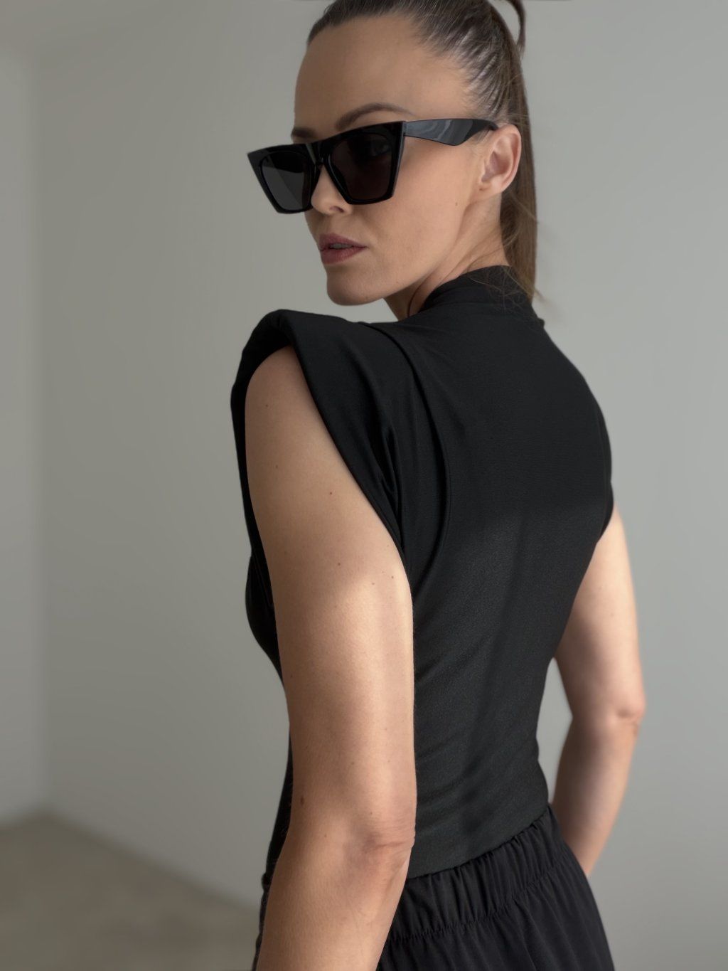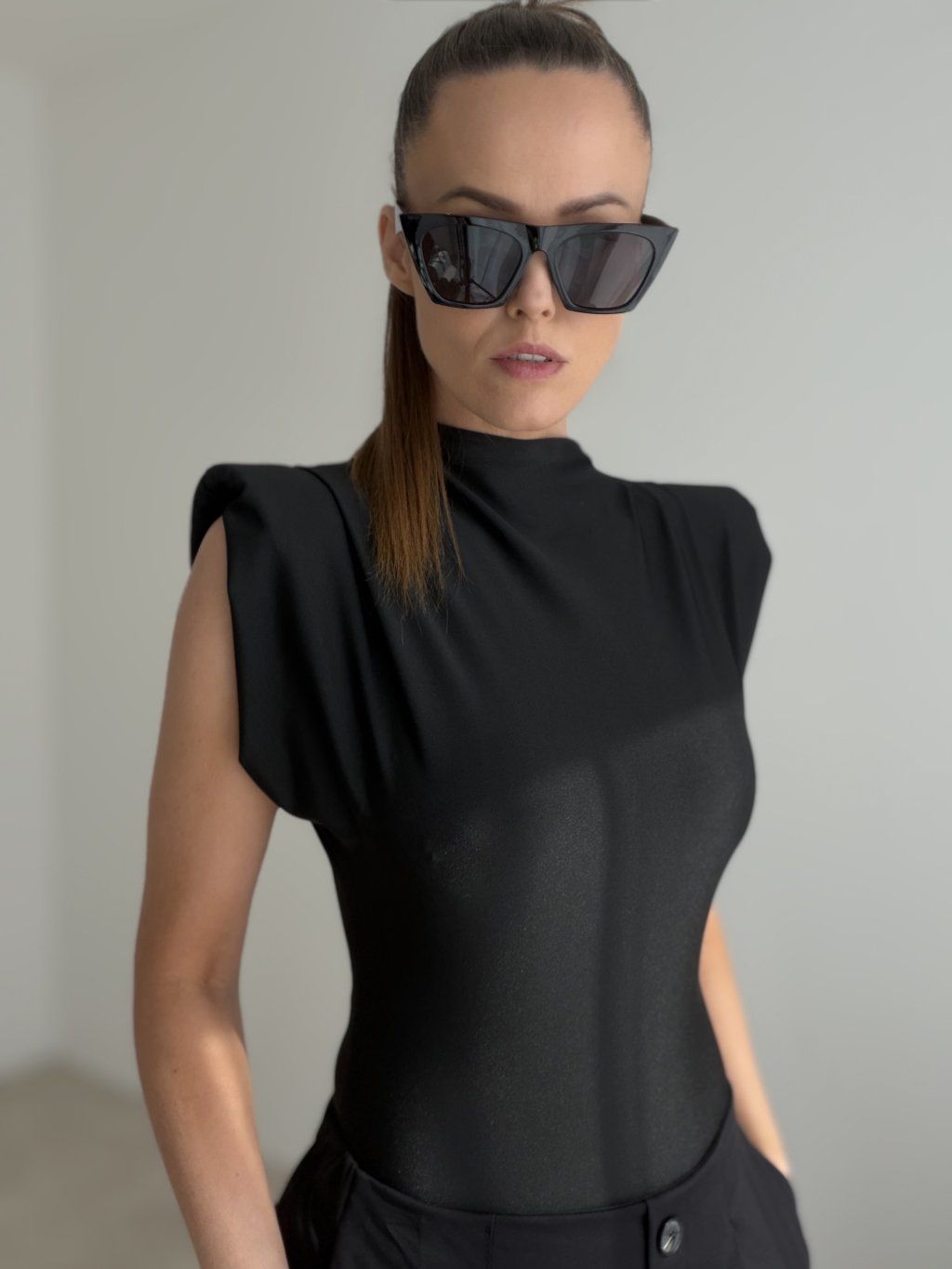 Body z wyraźnymi poduszkami na ramionach tworzy nowoczesną i elegancką sylwetkę. Gładki, lekko połyskujący materiał pięknie układa się na ciele i nadaje całości luksusowego charakteru. Stójka oraz delikatne marszczenie w górnej części dodają struktury i podkreślają czystą, wyrafinowaną linię.