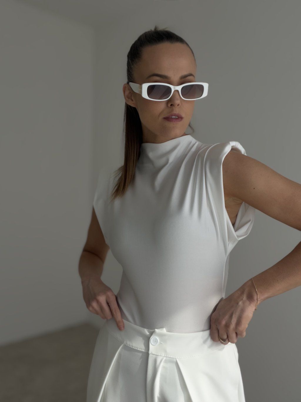 Body z wyraźnymi poduszkami na ramionach tworzy nowoczesną i elegancką sylwetkę. Gładki, lekko połyskujący materiał pięknie układa się na ciele i nadaje całości luksusowego charakteru. Stójka oraz delikatne marszczenie w górnej części dodają struktury i podkreślają czystą, wyrafinowaną linię.